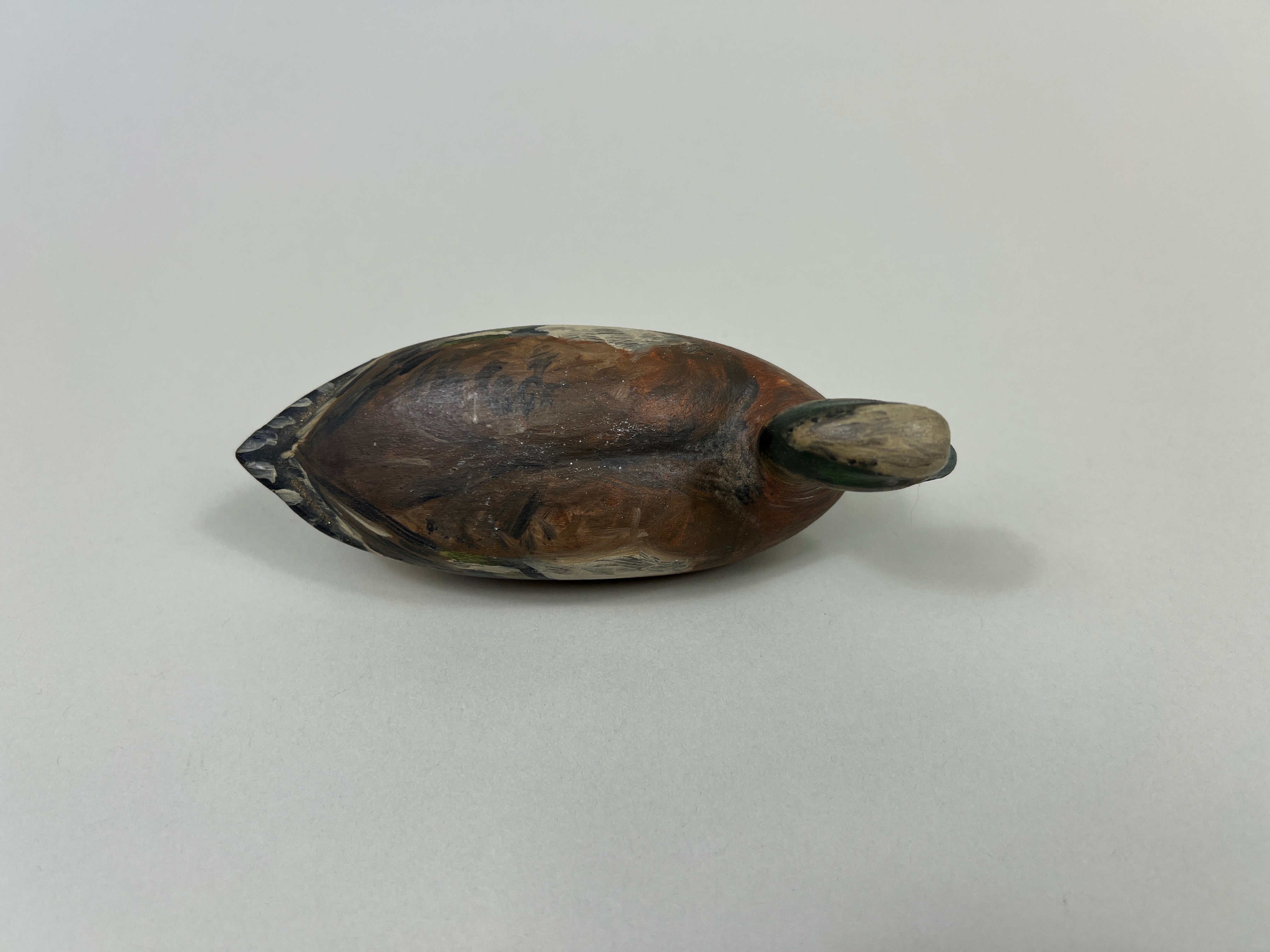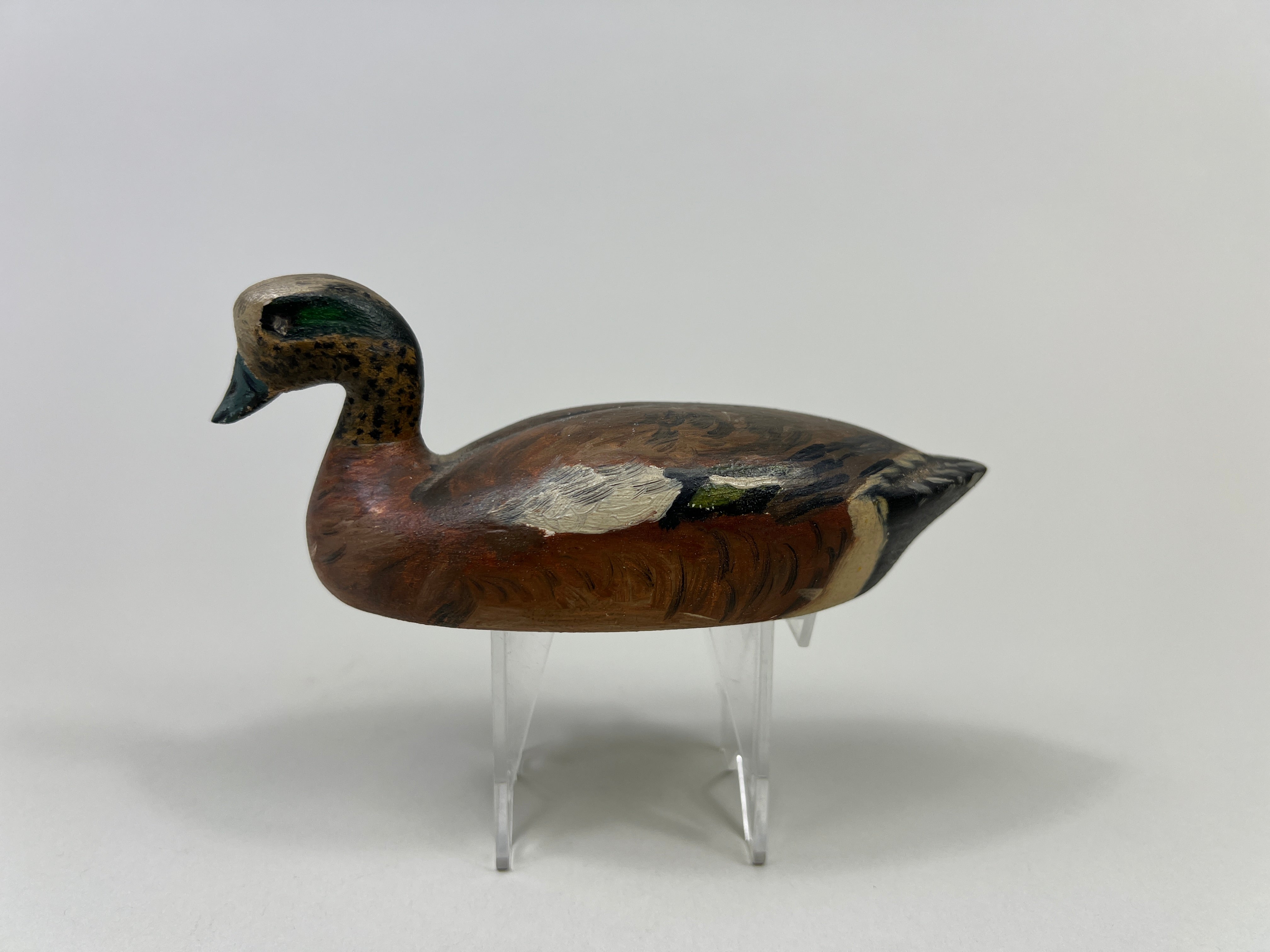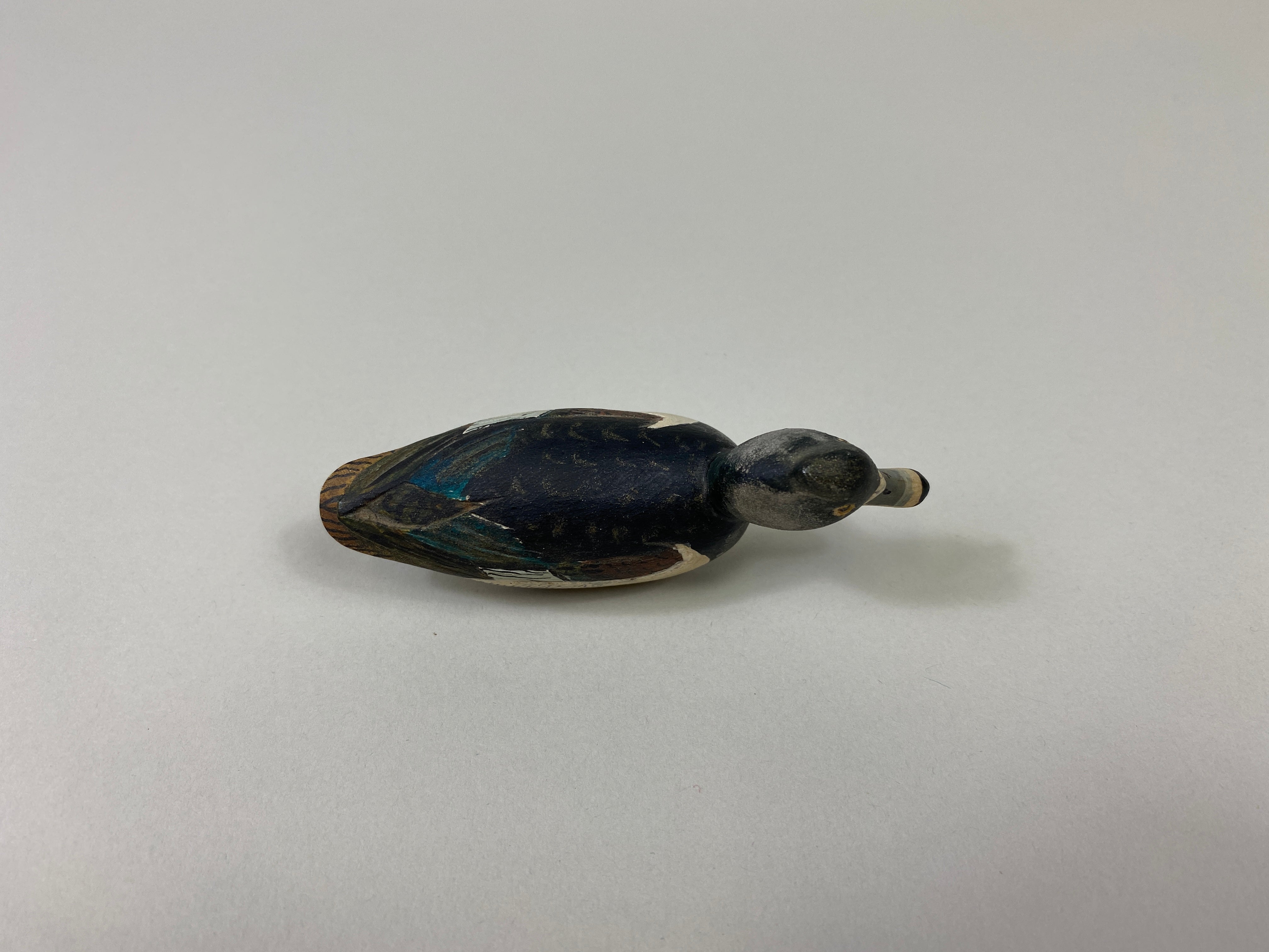 Unknown Mini Pintail Drake. Midwest region, circa 1940's-50's, glass eyes, solid body, original paint, nicely made. Measures 6-1/2" long, 1-1/2" wide, and 3-1/2" tall.