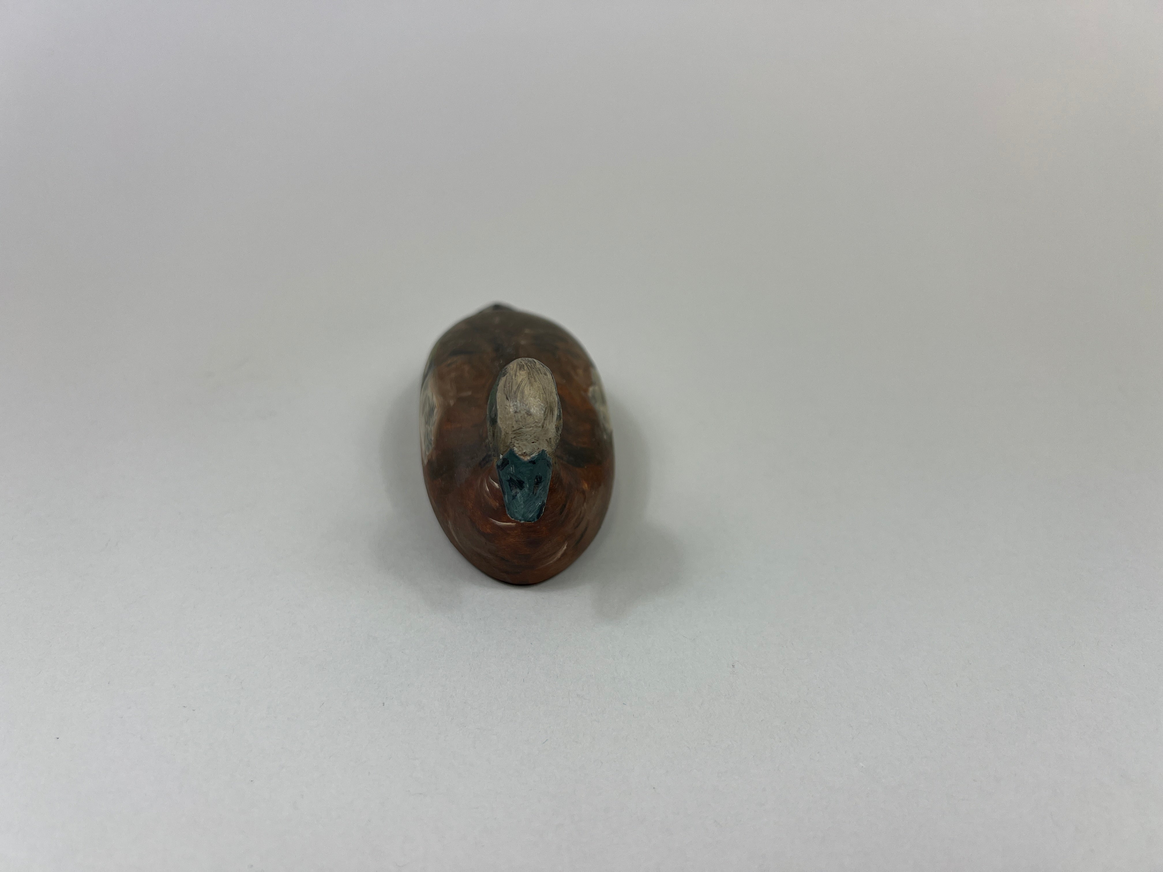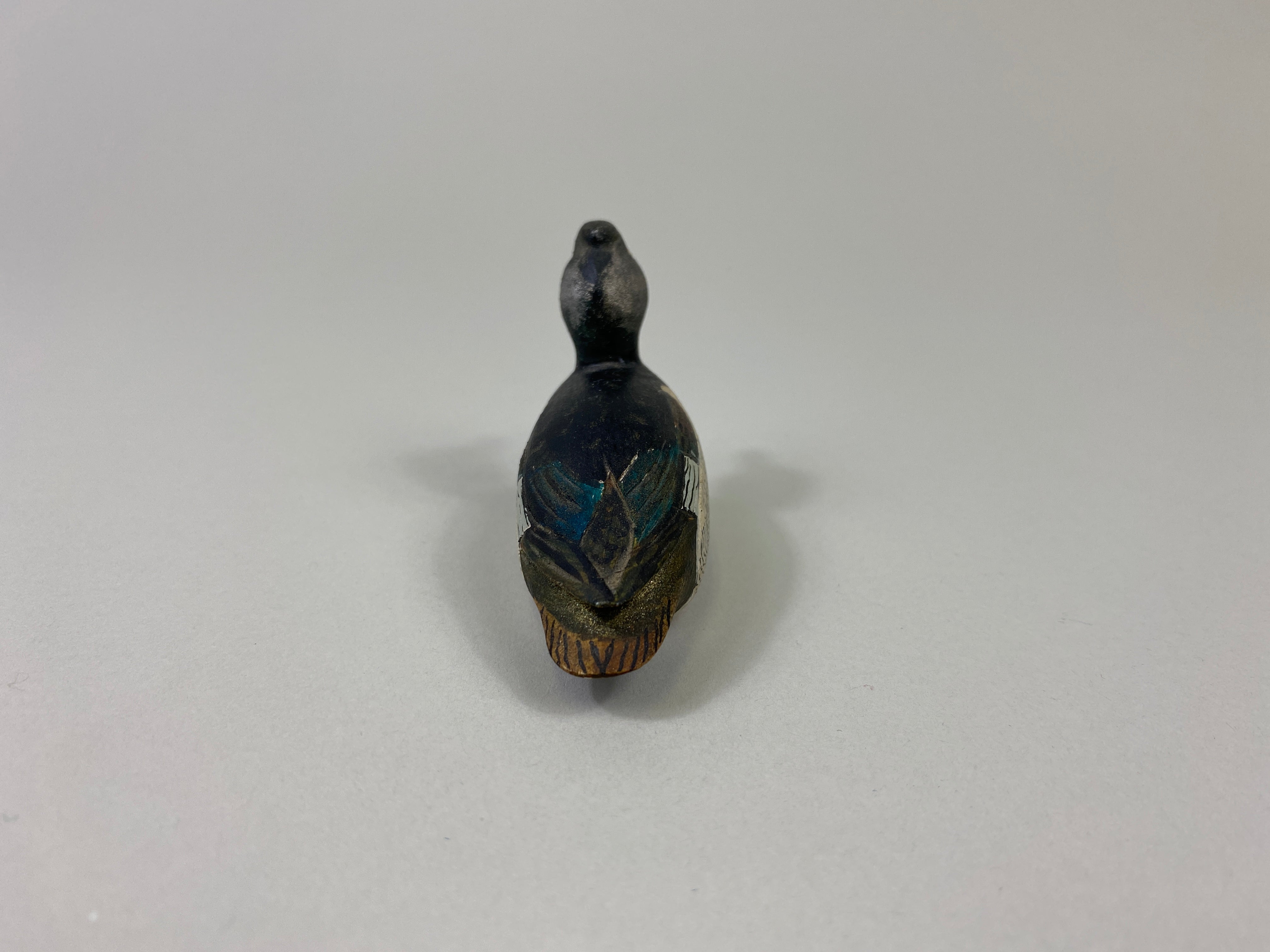 Miniature Wigeon Drake by unknown carver. Original with painted eyes, chip on underside of bill, otherwise in good condition. Measures 5" long, 2" wide, and 2" tall.
