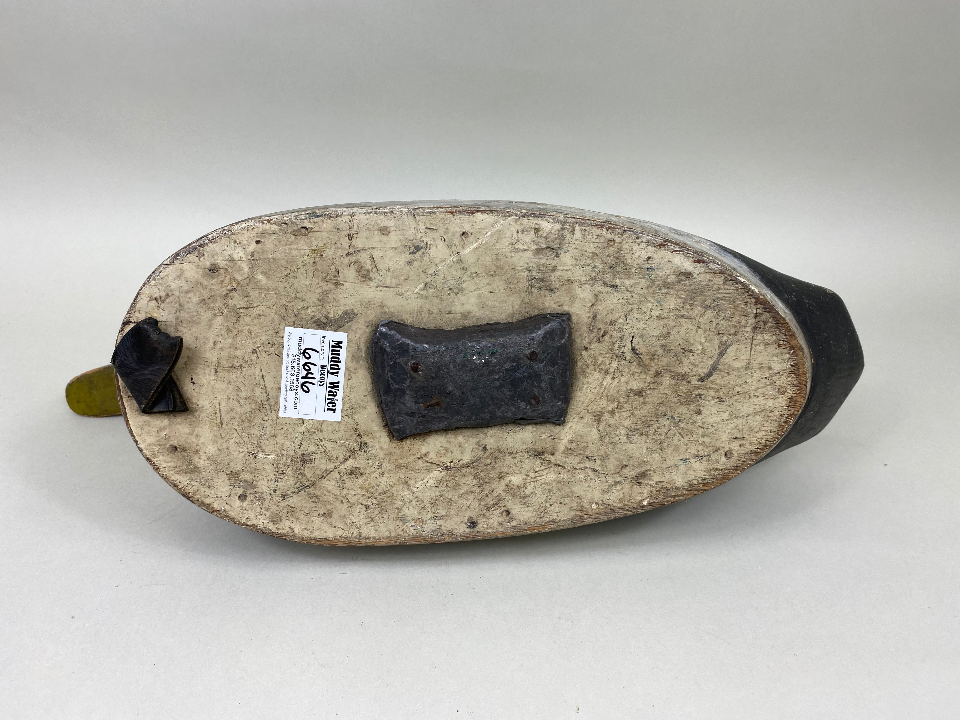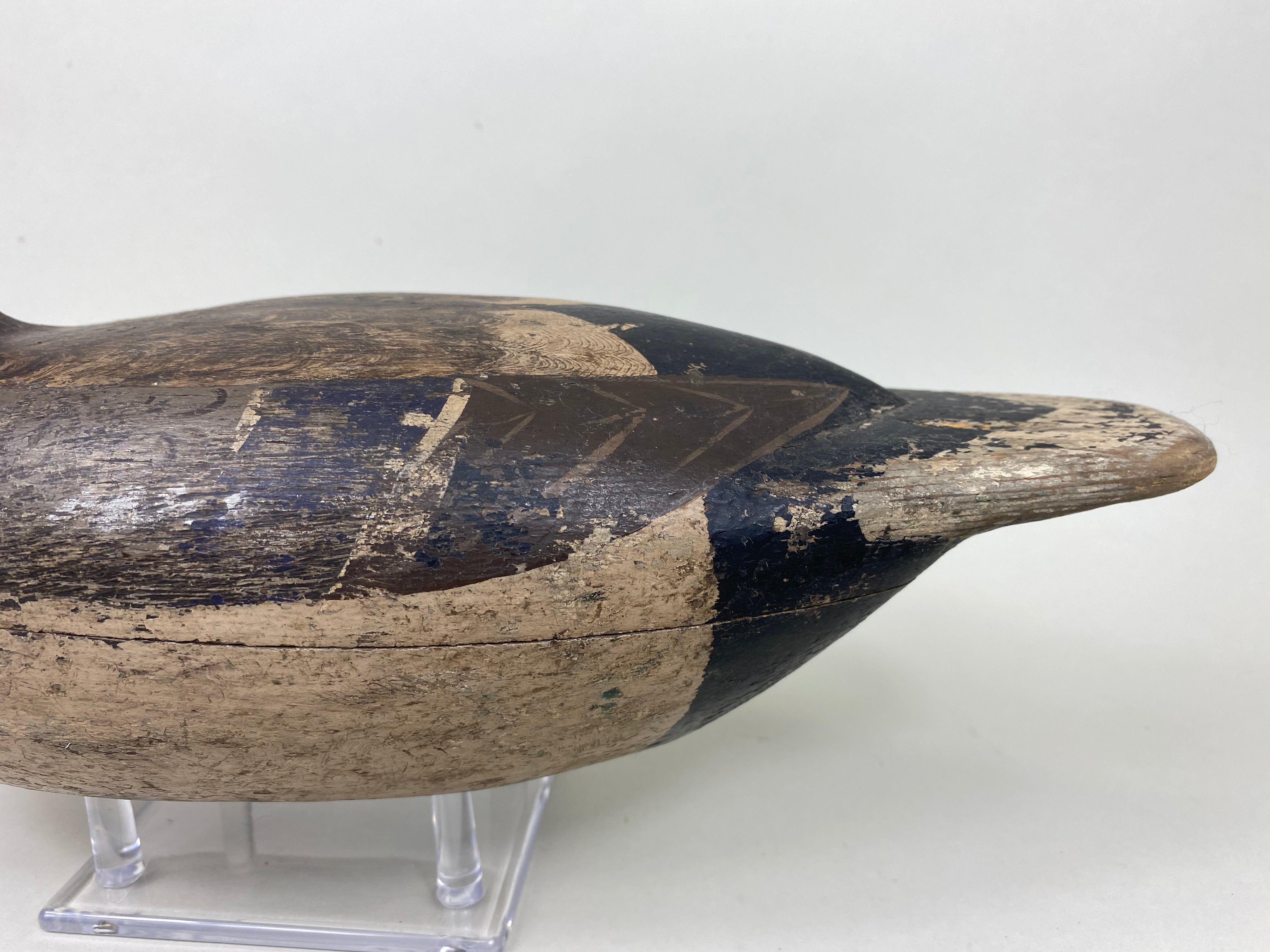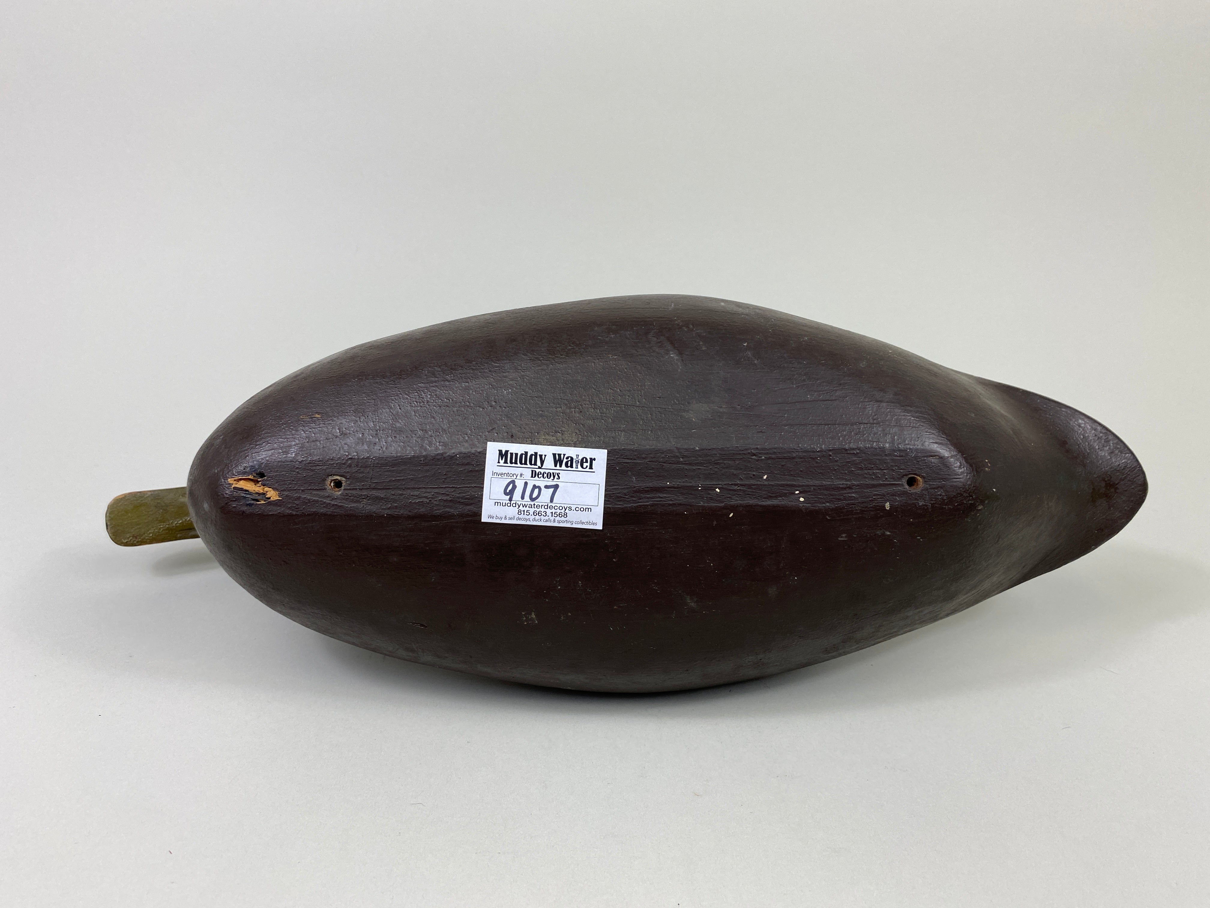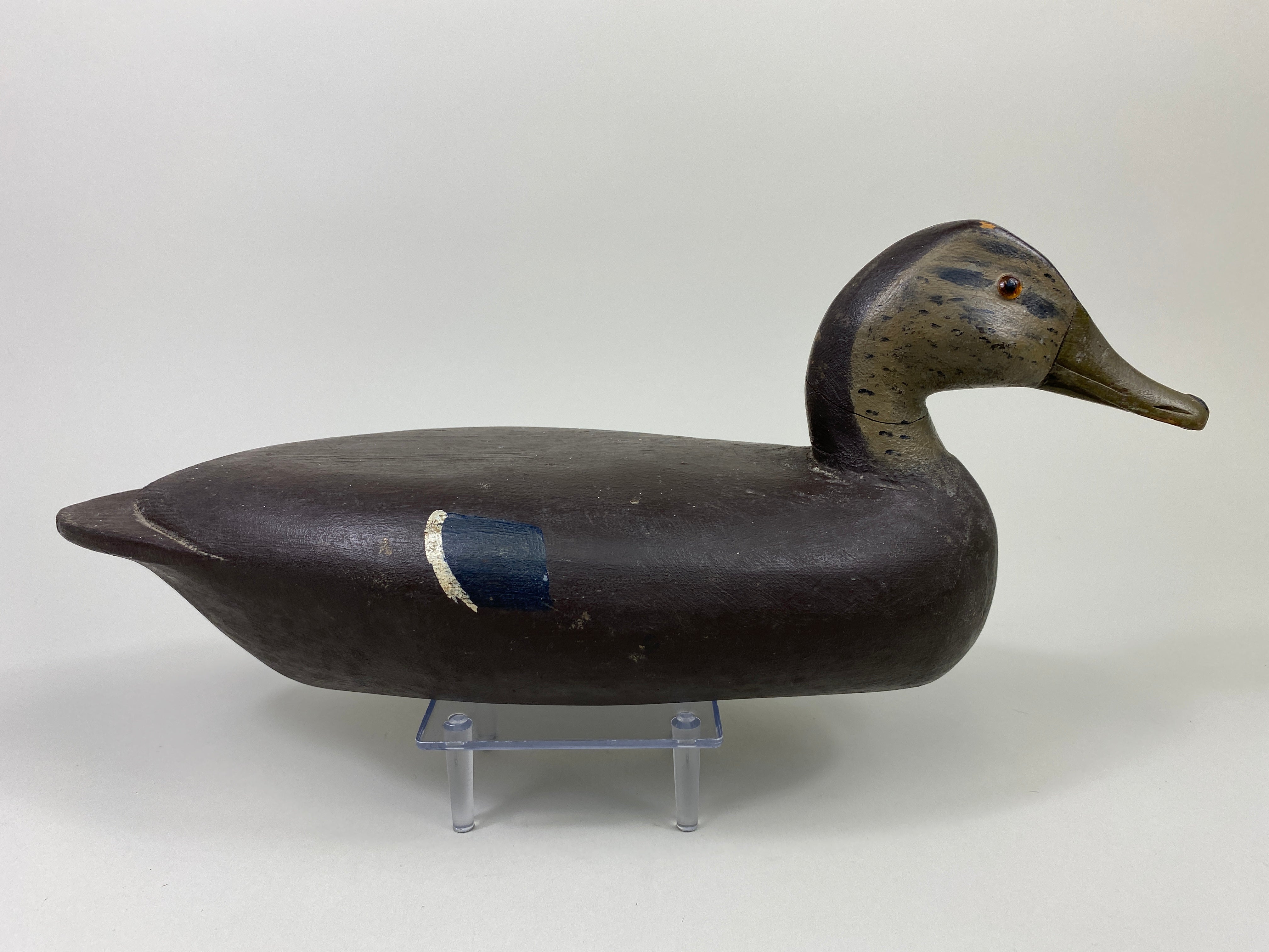 George "Skippy" Barto Black Duck, Tiskilwa, Illinois. Glass eyes, hollow body, original paint, BB marks, hunting wear, hairline neck crack on one side, rare species for this carver. Decoy measures...