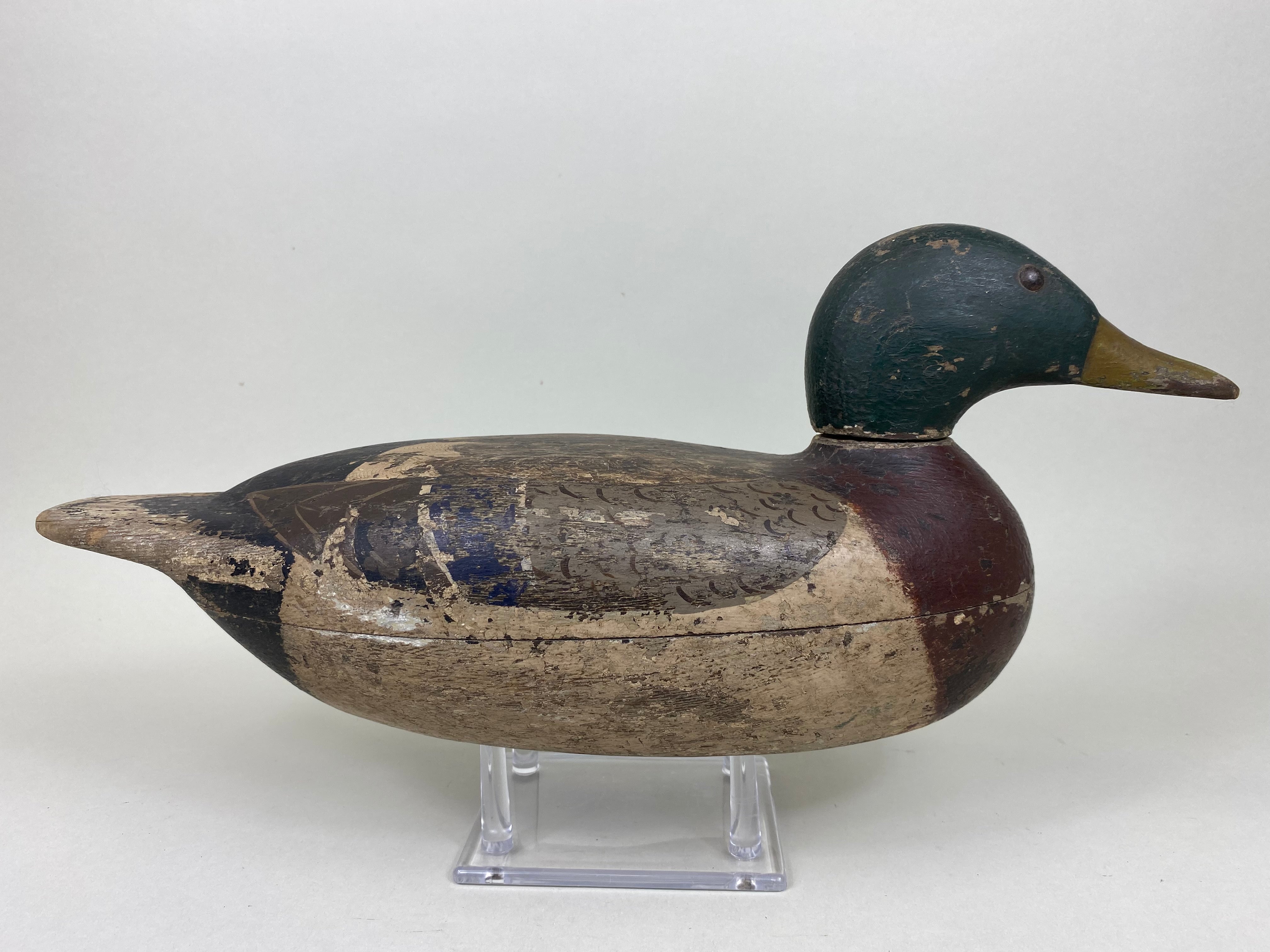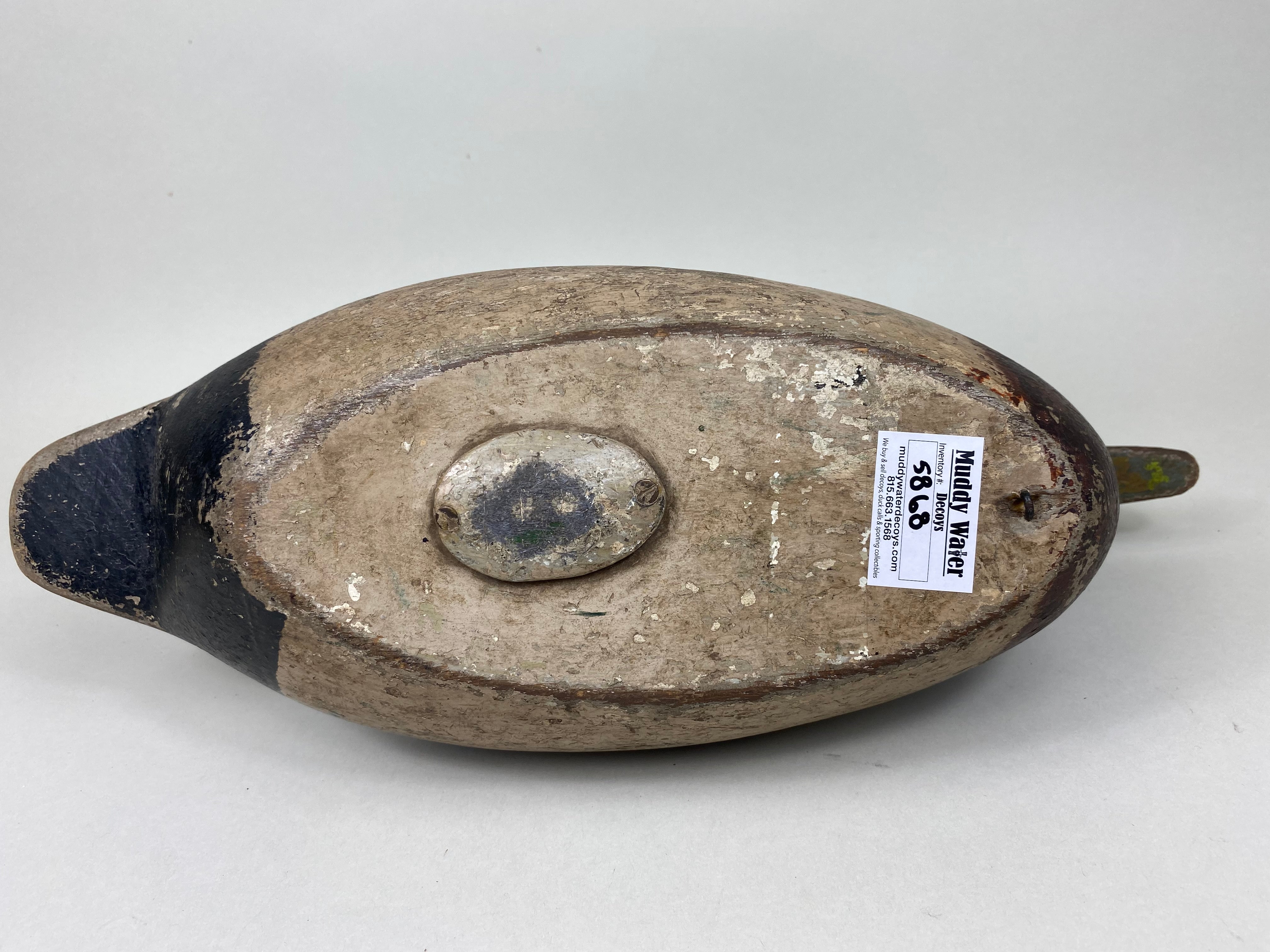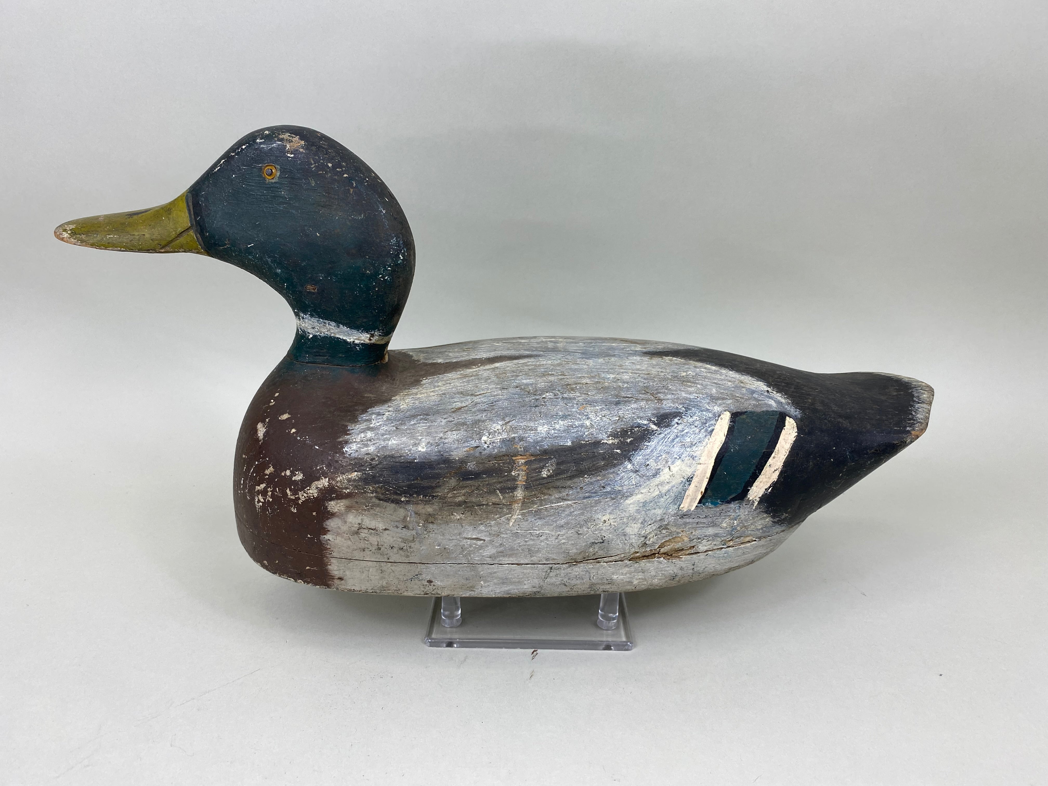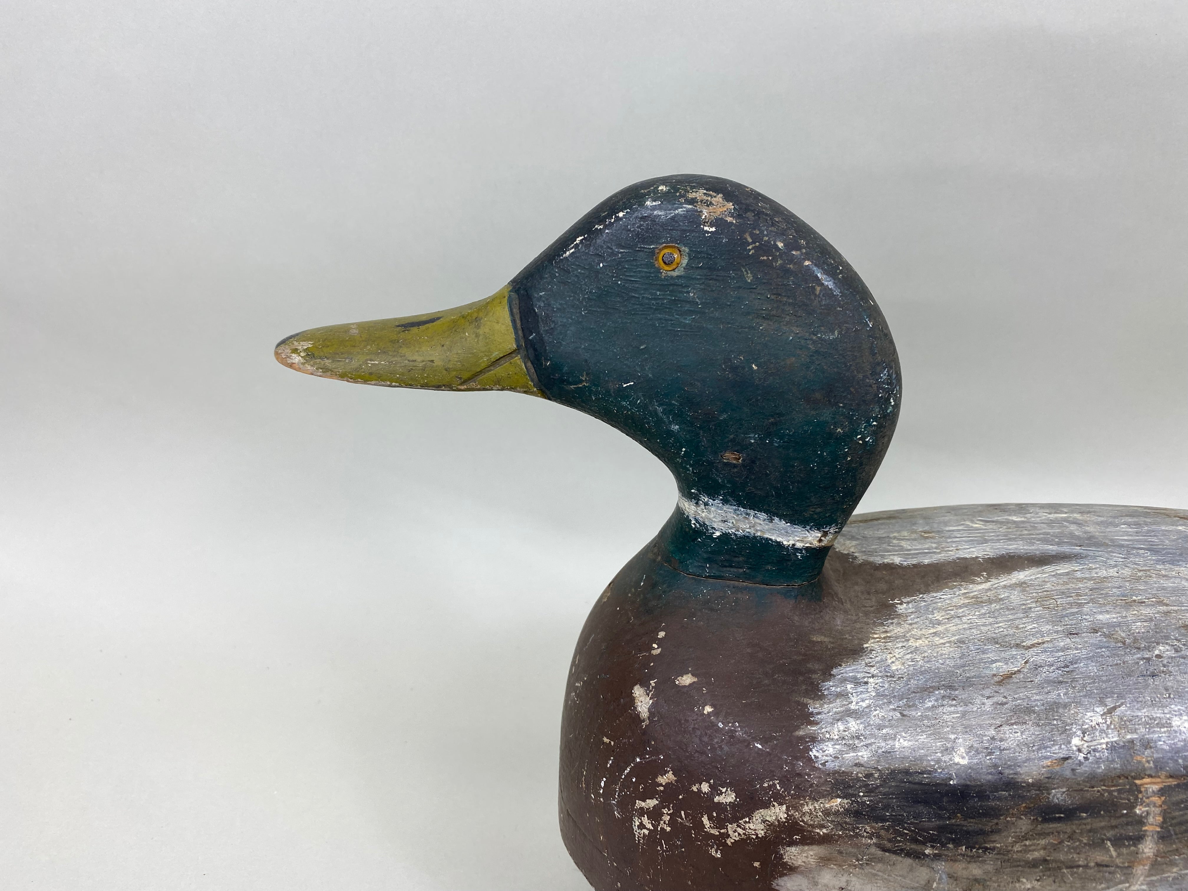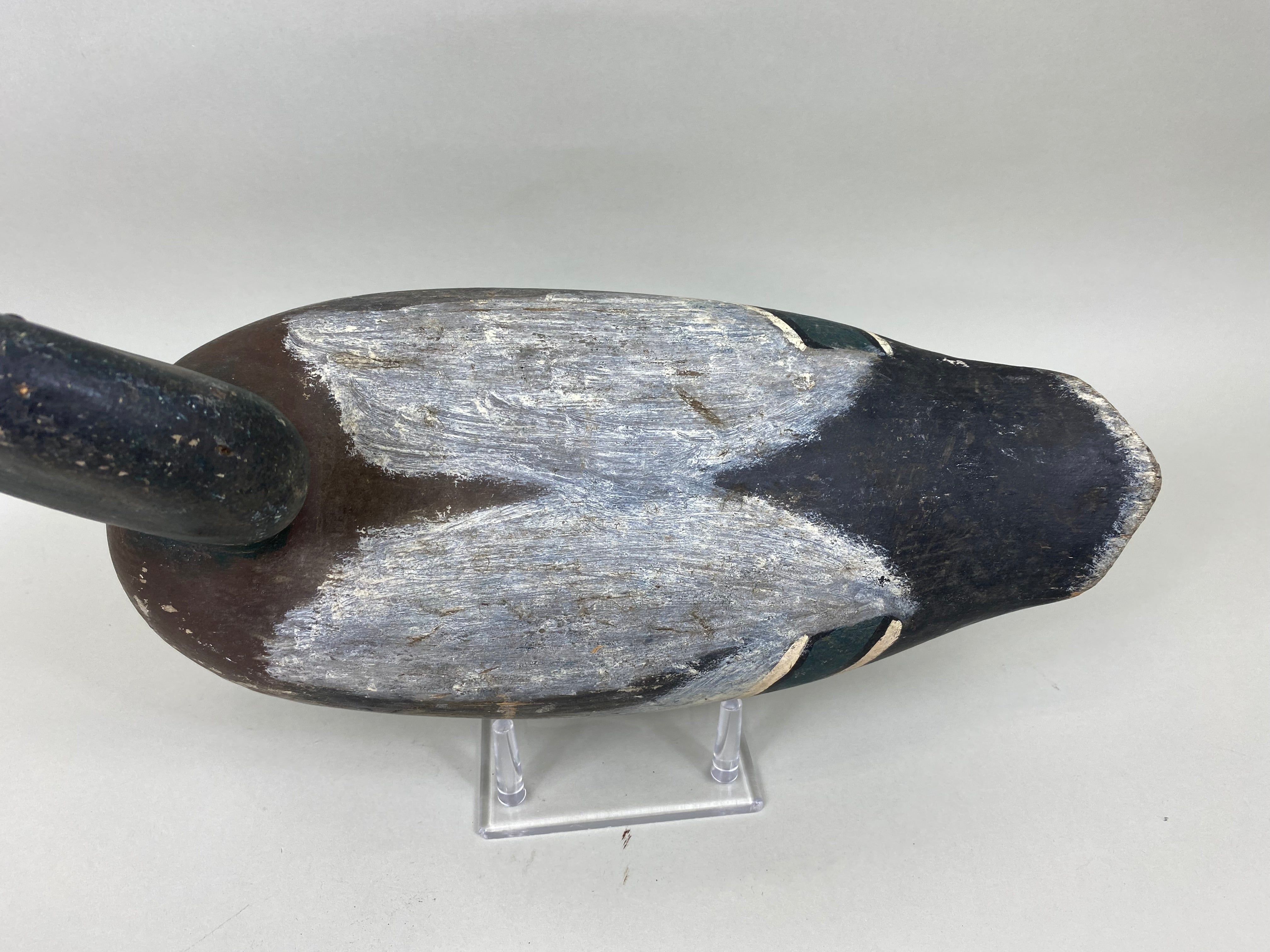 Unknown Wisconsin Mallard Drake. Slightly oversized, glass eyes, mostly original paint, hollow with bottom board, lead weight and rigging strap on bottom. Decoy has BB marks, hunting wear and measures...