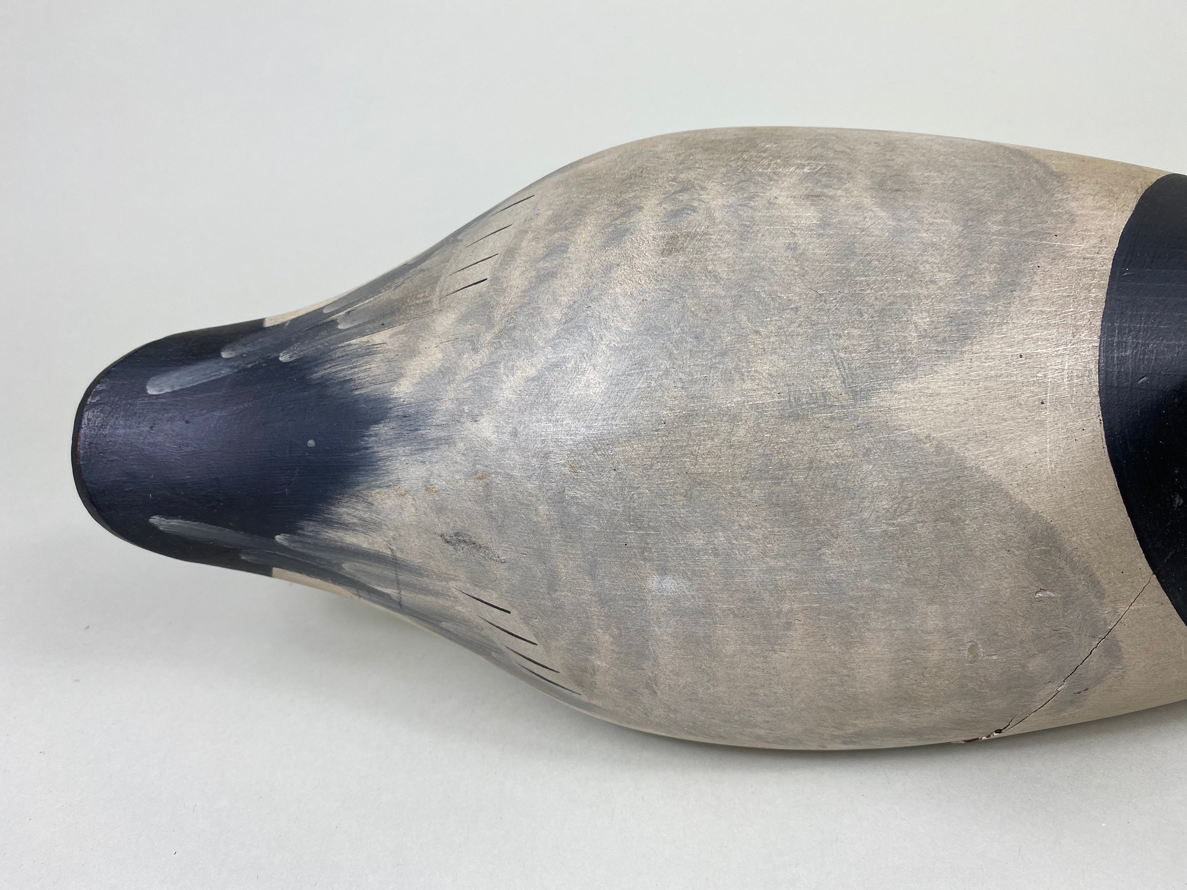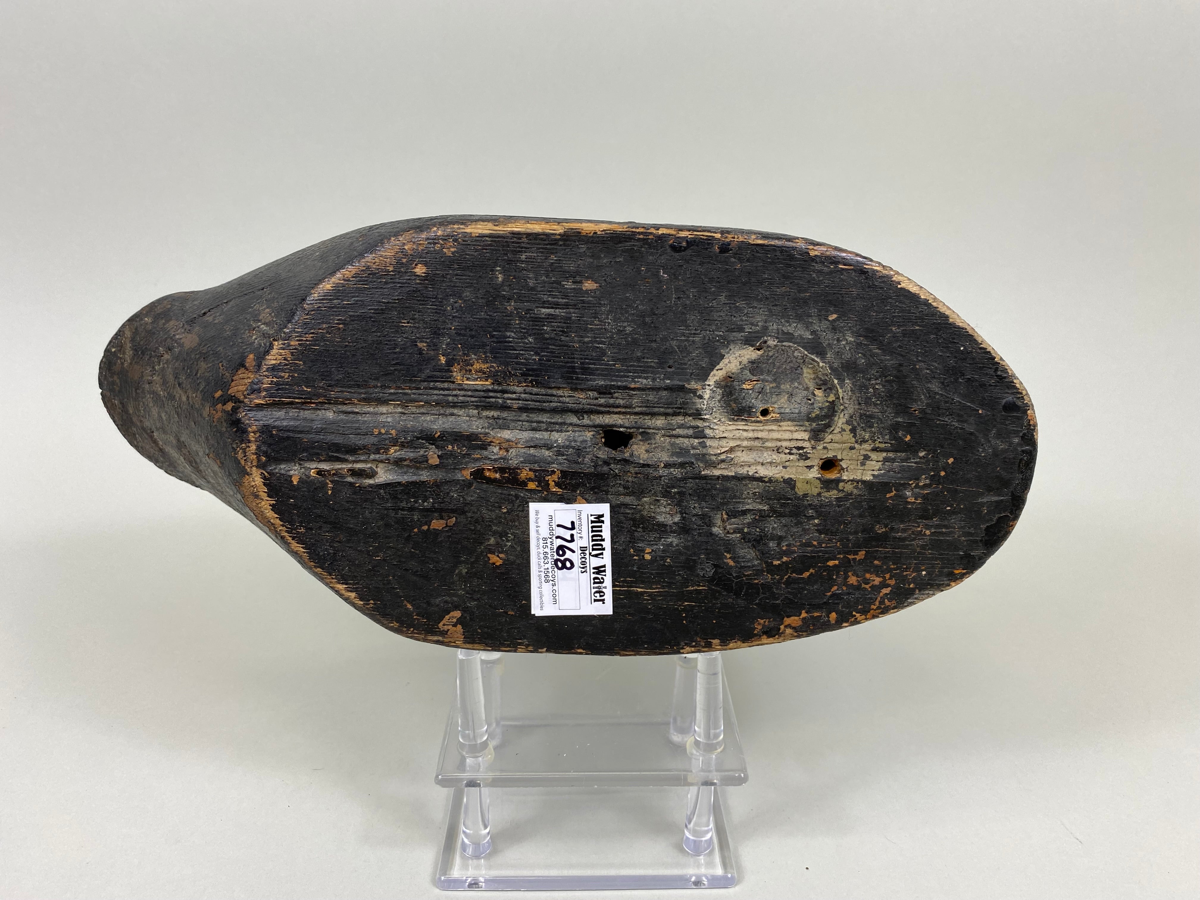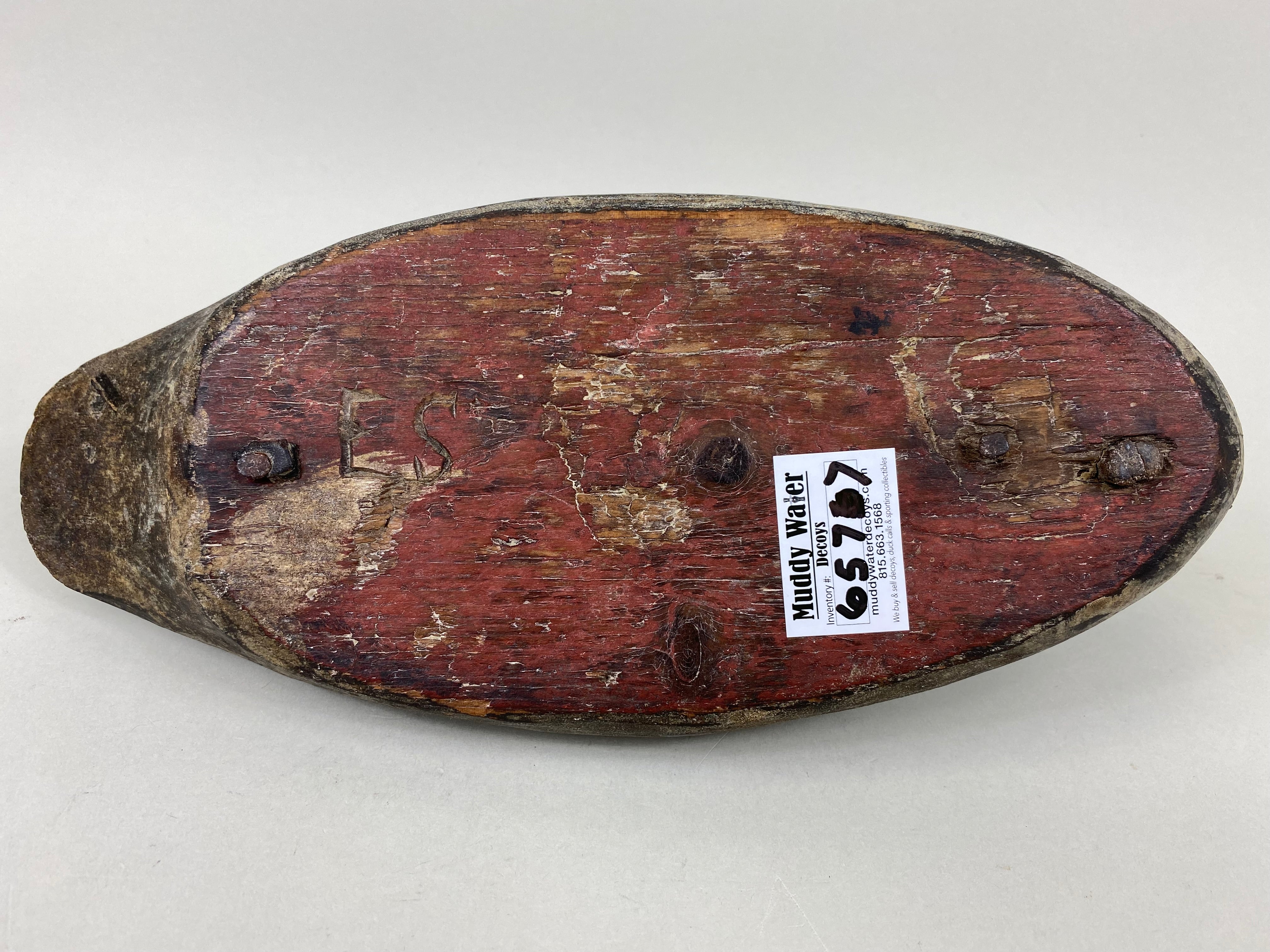 Unknown Long Island Duck Decoy. Painted eyes, chip carved solid body, "ES" carved in bottom, has some original paint and hunting wear. Measures 13" long, 4-1/2" wide, and 5" tall.