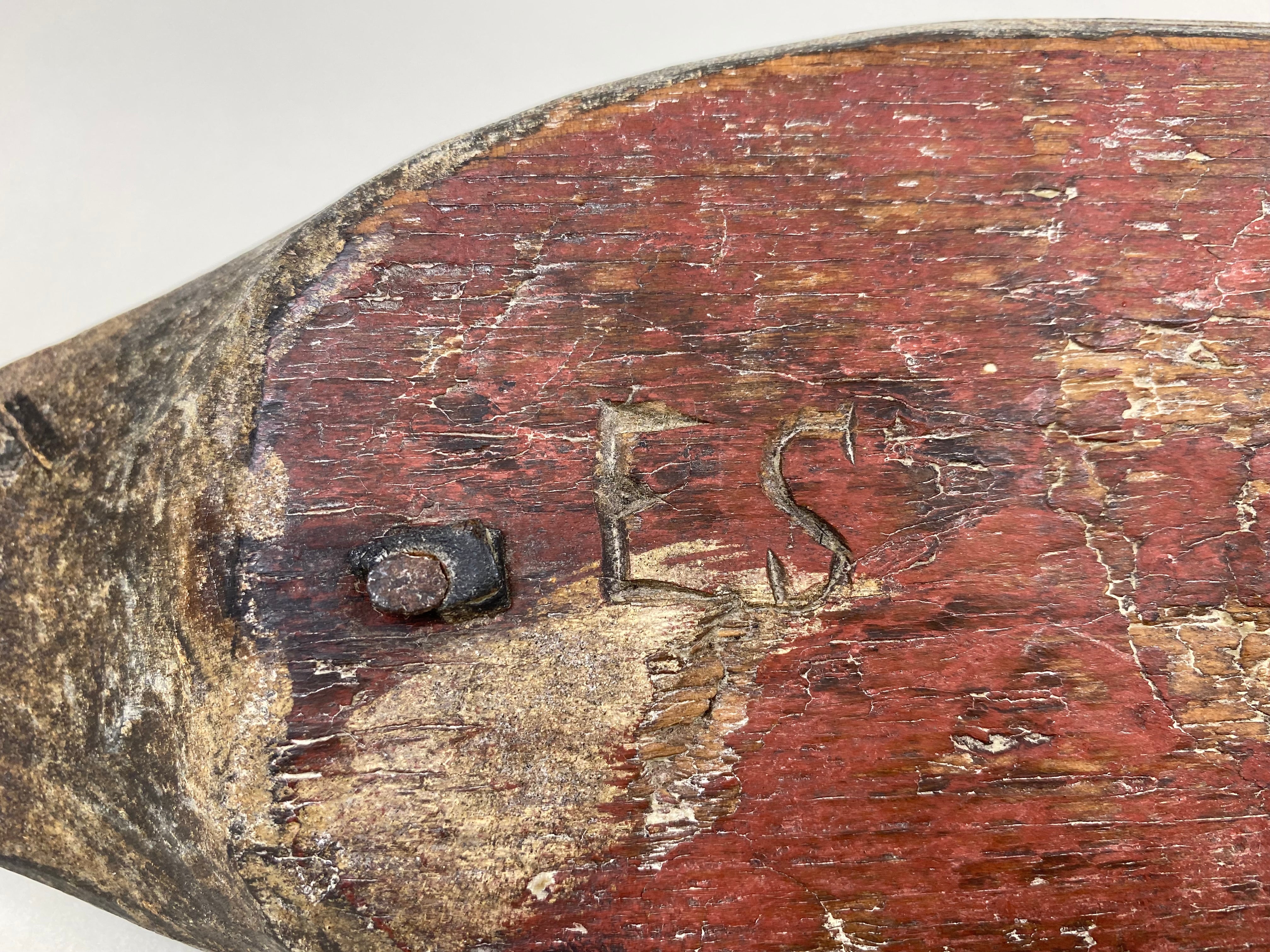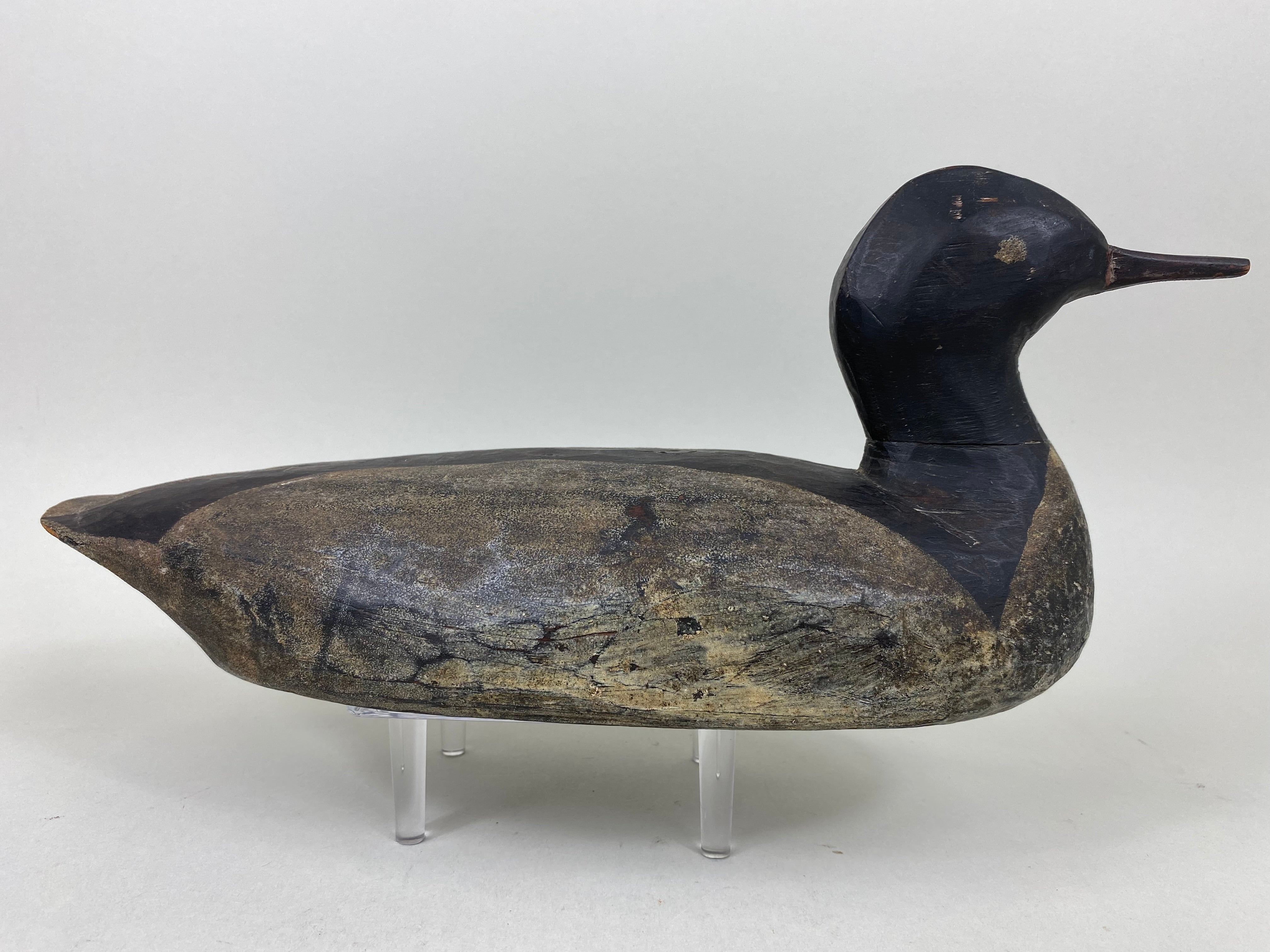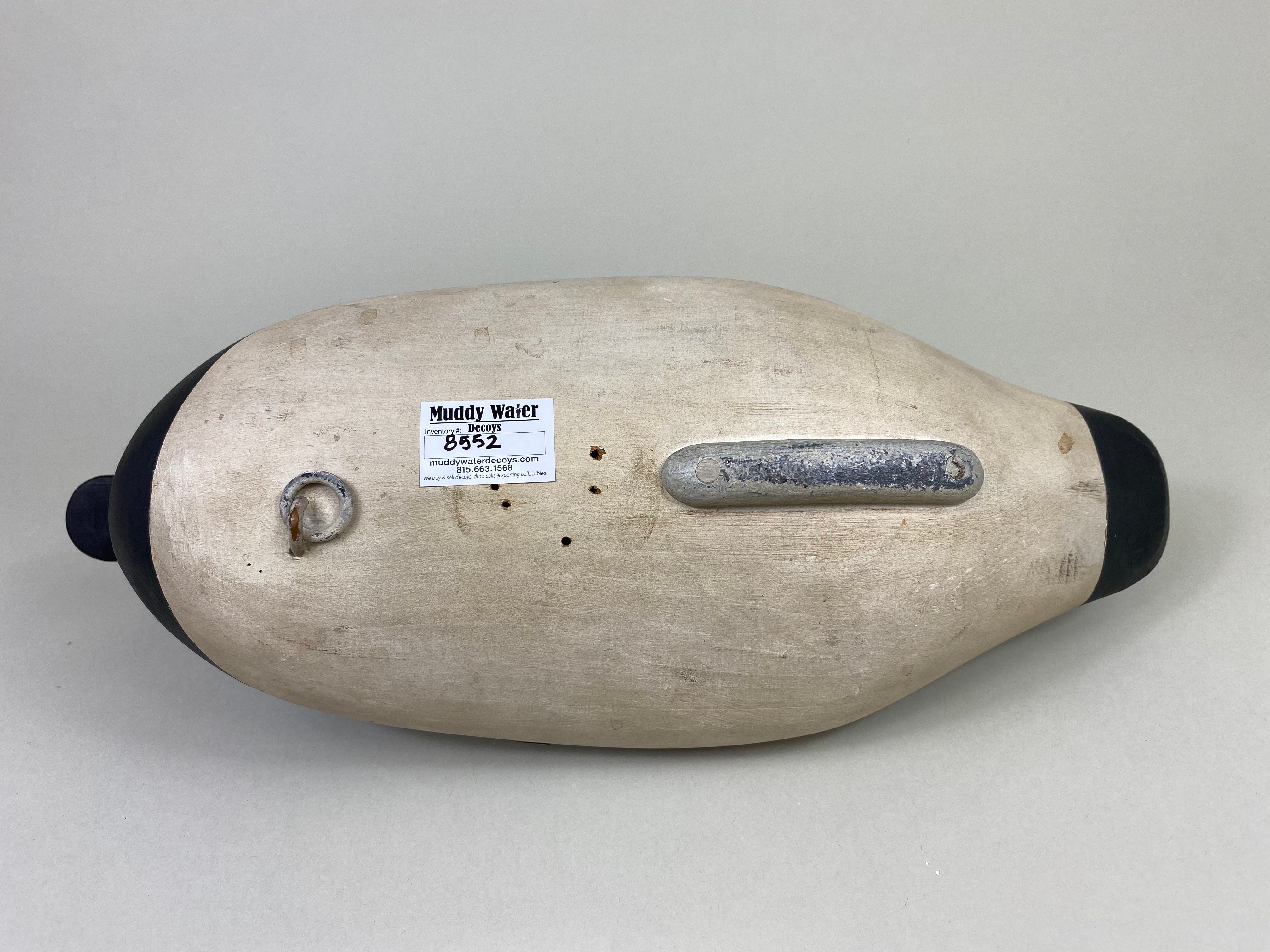 Unknown Long Island Duck Decoy. Painted eyes, chip carved solid body, "ES" carved in bottom, has some original paint and hunting wear. Measures 13" long, 4-1/2" wide, and 5" tall.