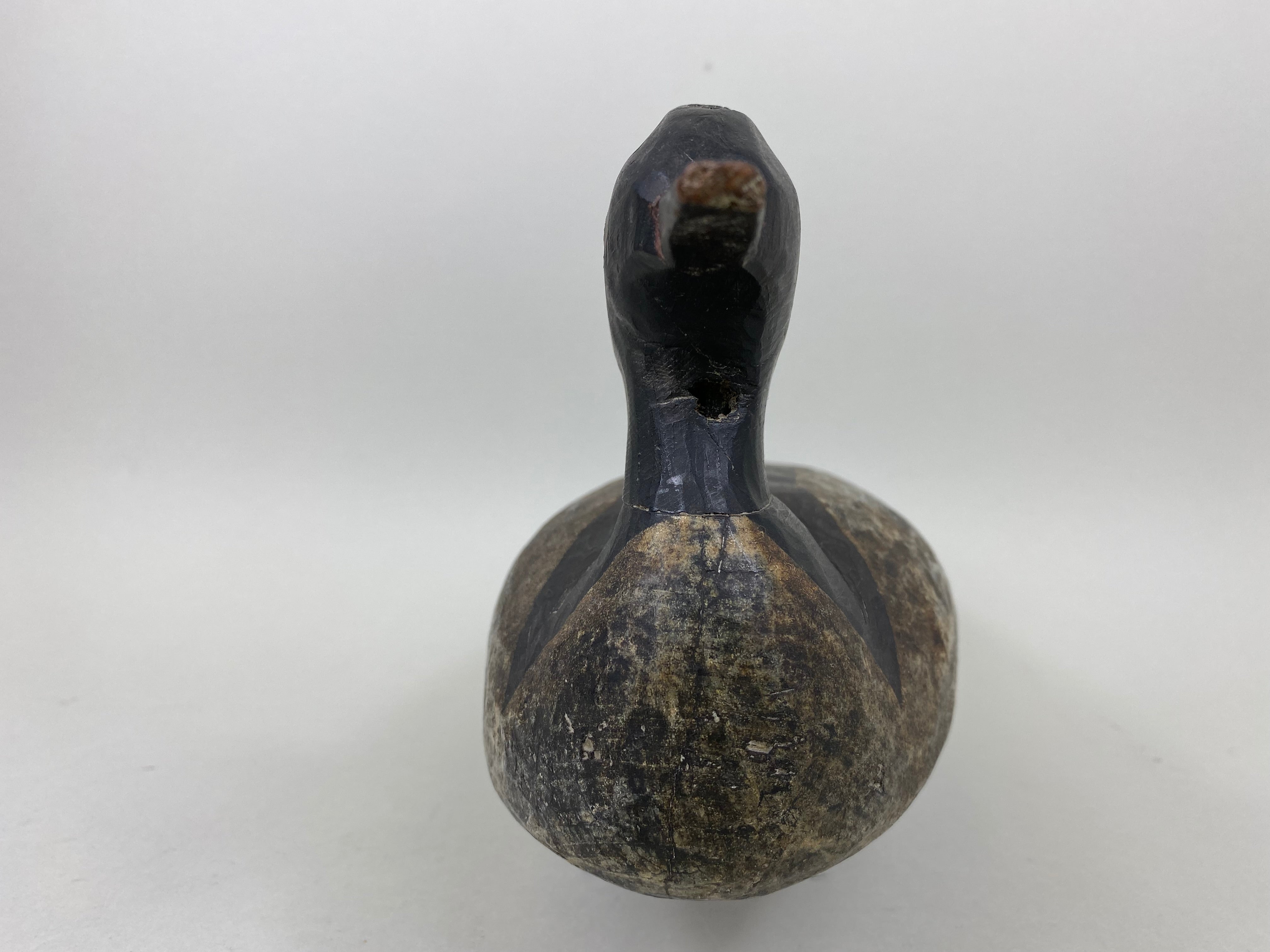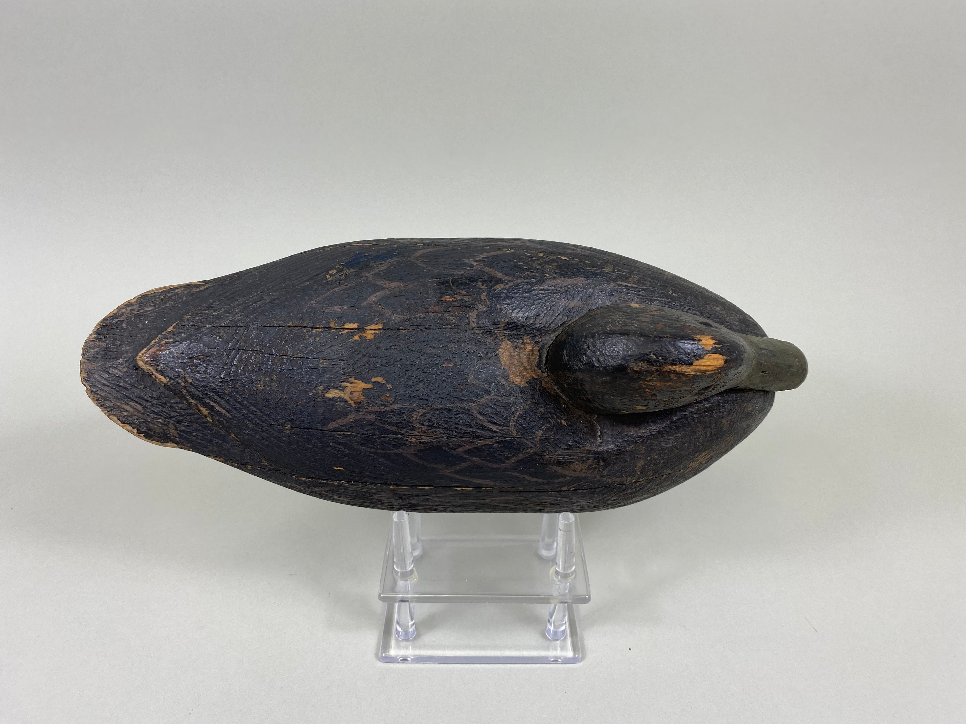 Unknown Michigan Black Duck. Circa 1930's, original paint, solid body, glass eyes, nestled head, age cracks, hunting wear, carved split tail. Measures 14" long, 5-1/2" wide, and 5" tall.