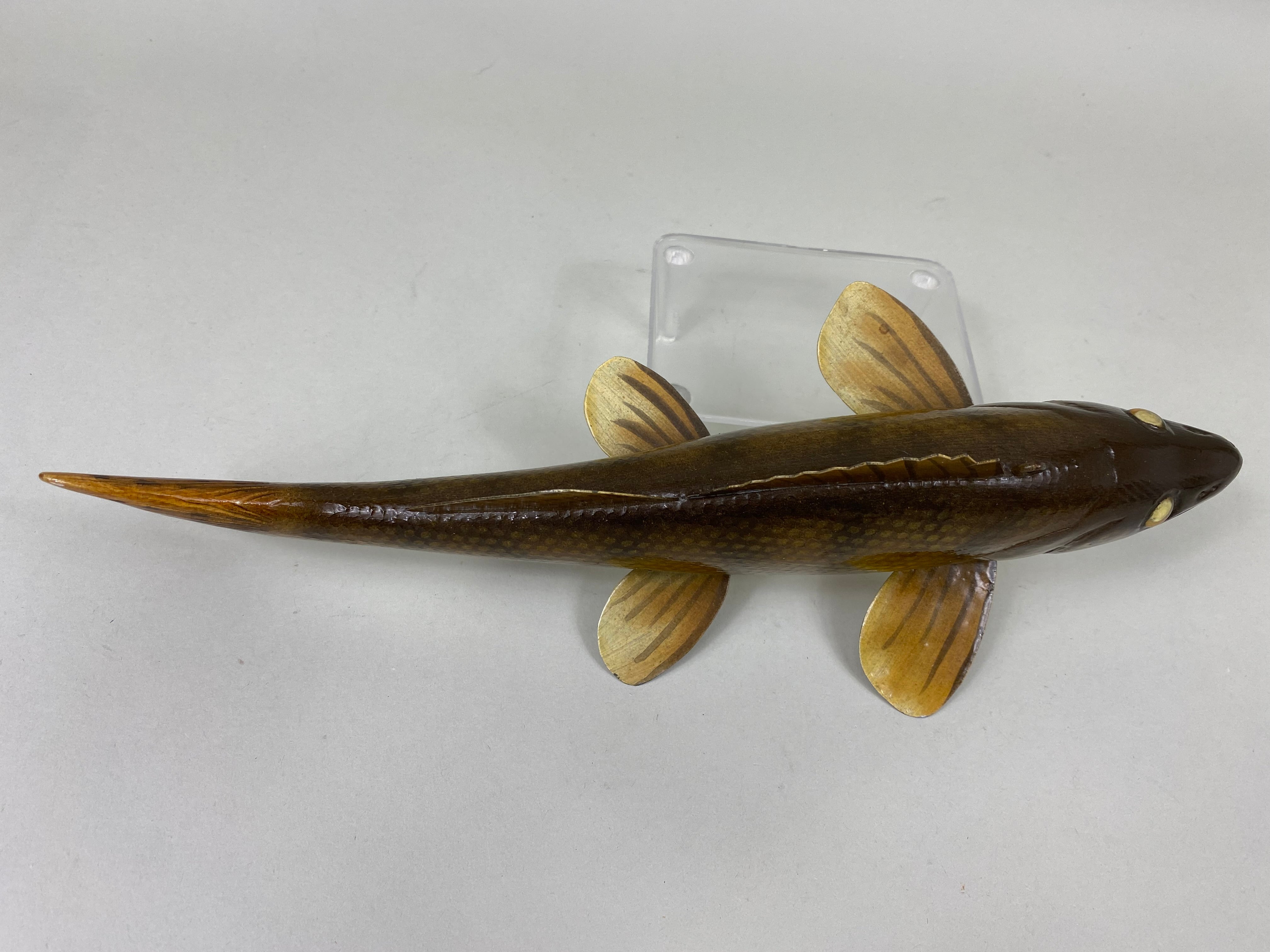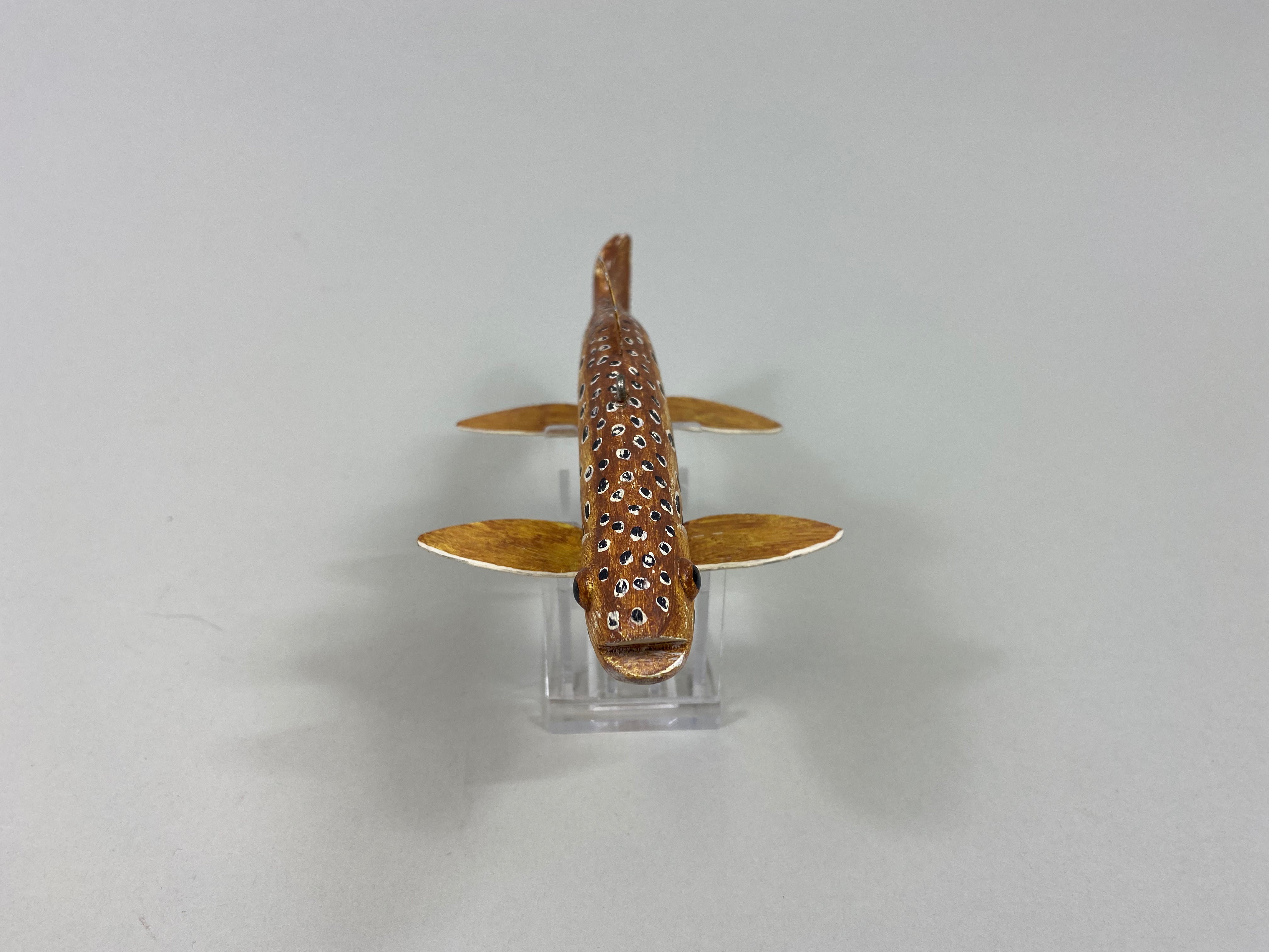 Carved pike by unknown maker. Has relief carved eyes, wooden carved fins, appears to have been carved out of one piece of wood, carved gills, open mouth, very nicely done. ...