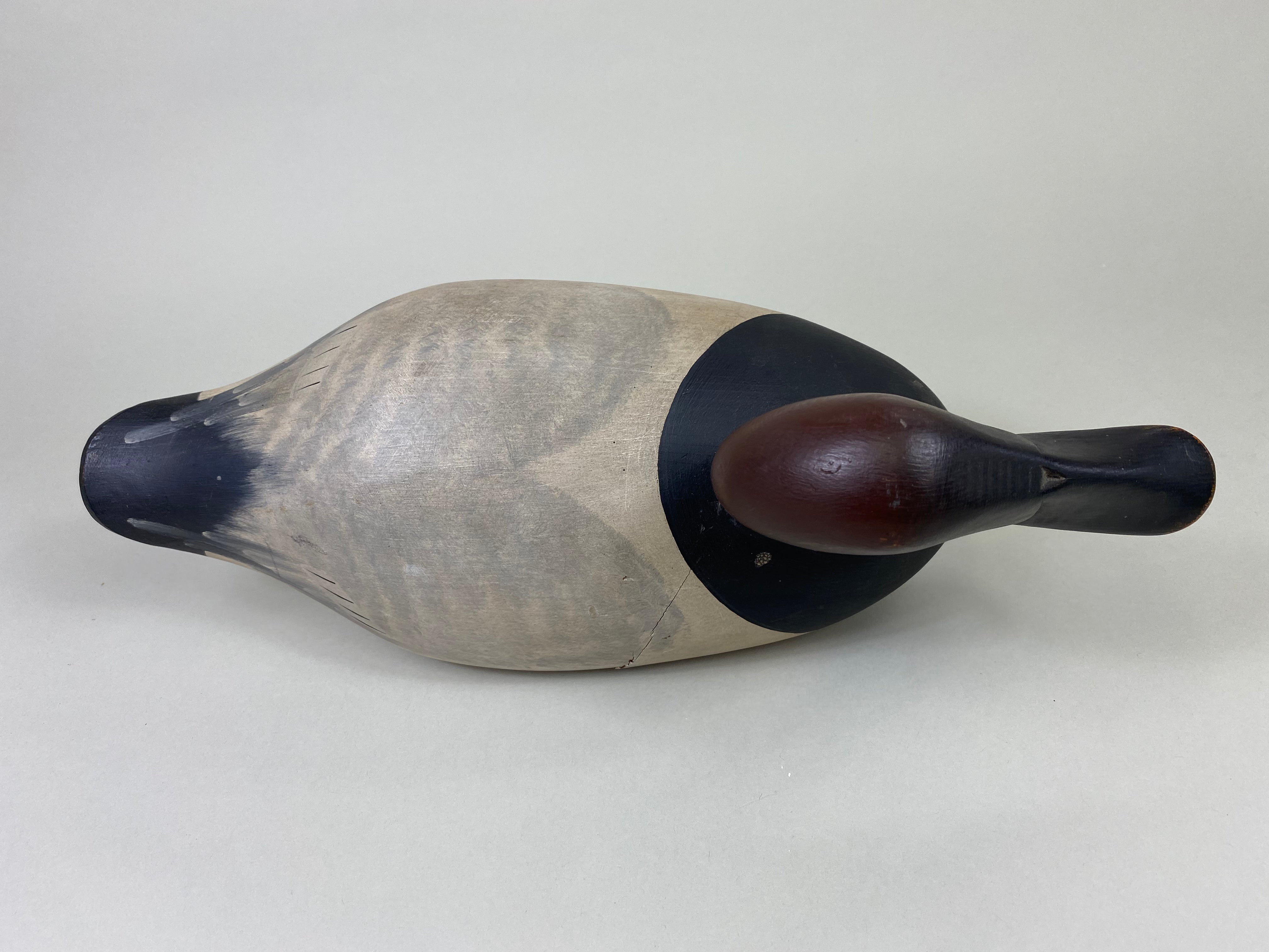 Captain Harry Jobes Canvasback Drake, Havre de Grace, Maryland. Original paint, solid body, painted eyes, wood crack on right side, lead weight and rigging hook on bottom, minor hunting wear. ...