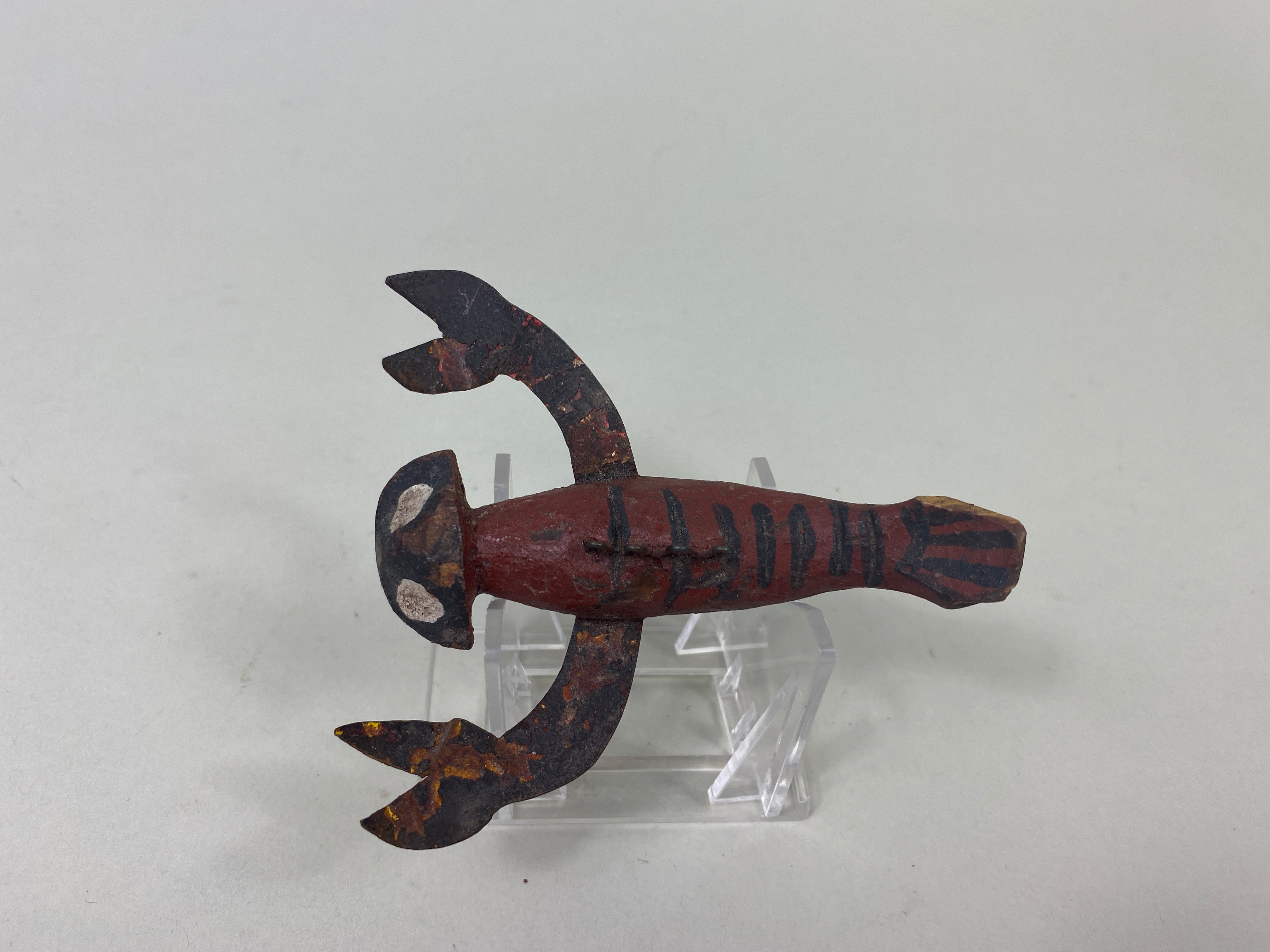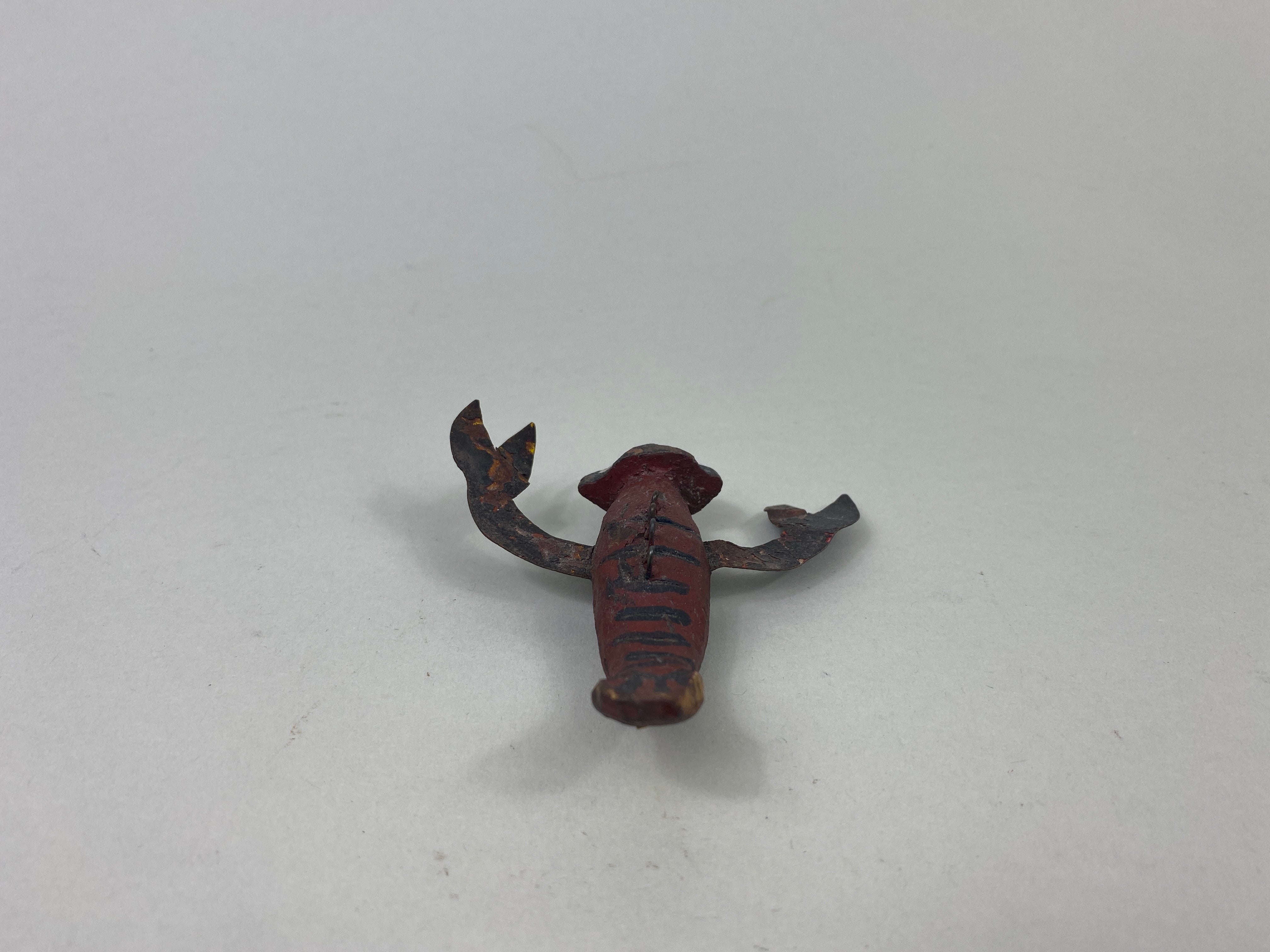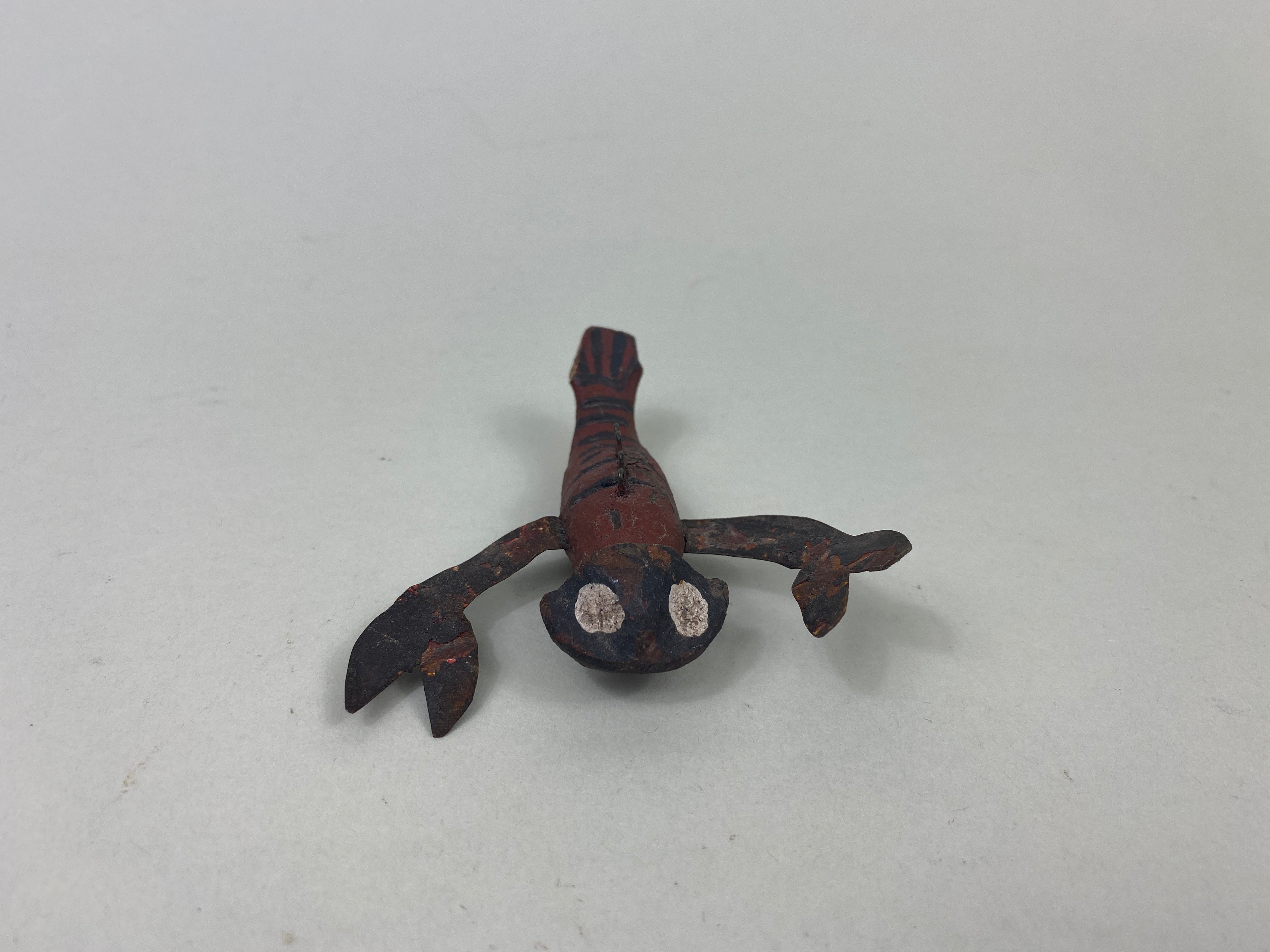 Crawdad Fish Spearing Decoy, unknown maker. All original, metal arms, inletted lead weight on bottom, painted eyes, worn from use. Measures 3-1/2" long, 3-1/2" wide, and 1/2" tall.