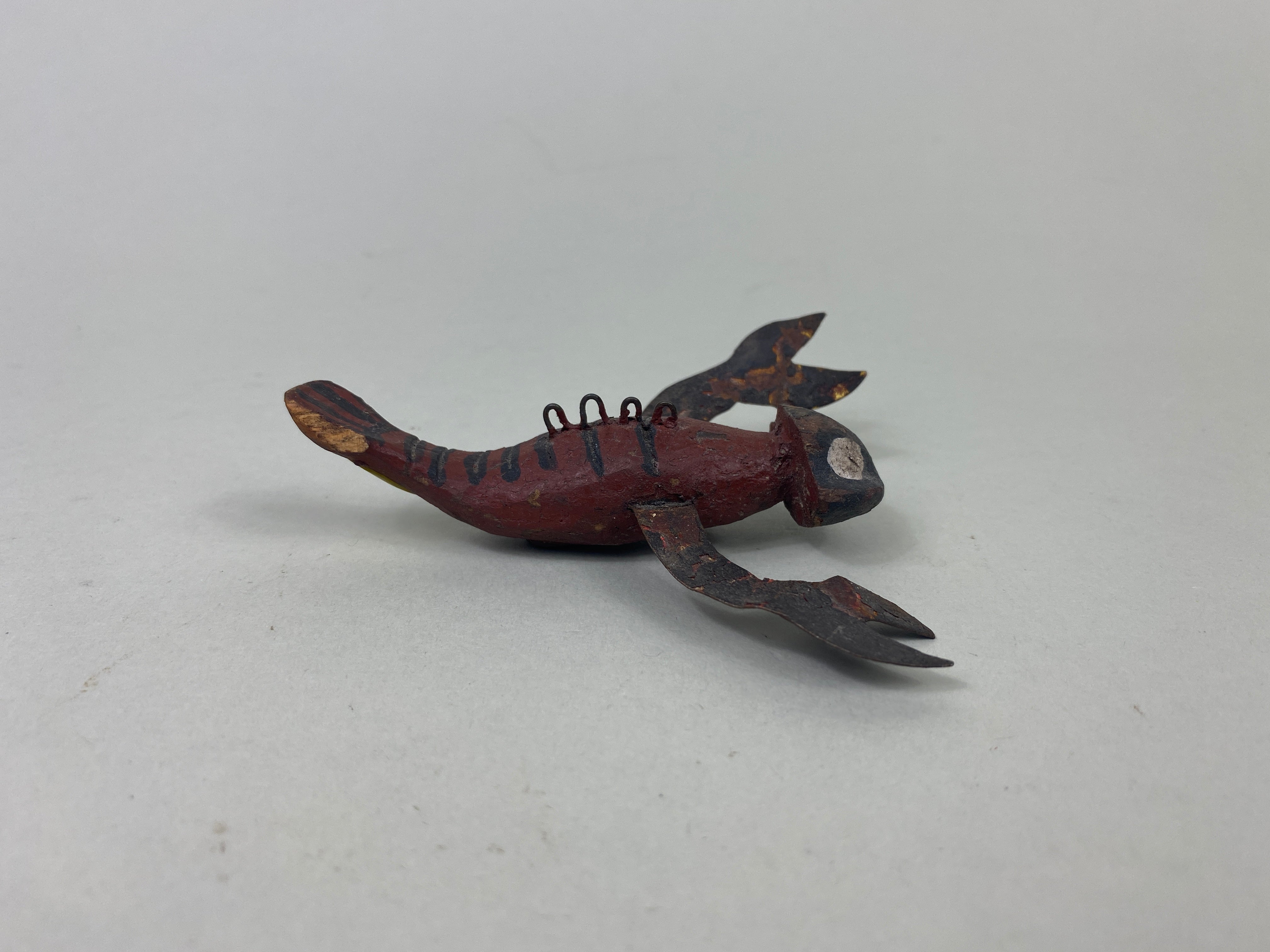Unknown fish spearing decoy from the 1940's. Painted eyes, inletted lead weight, metal fins and tail. Has some wear to it, nice old fish. Measures 6-1/2" long, 1-3/4" wide, and...