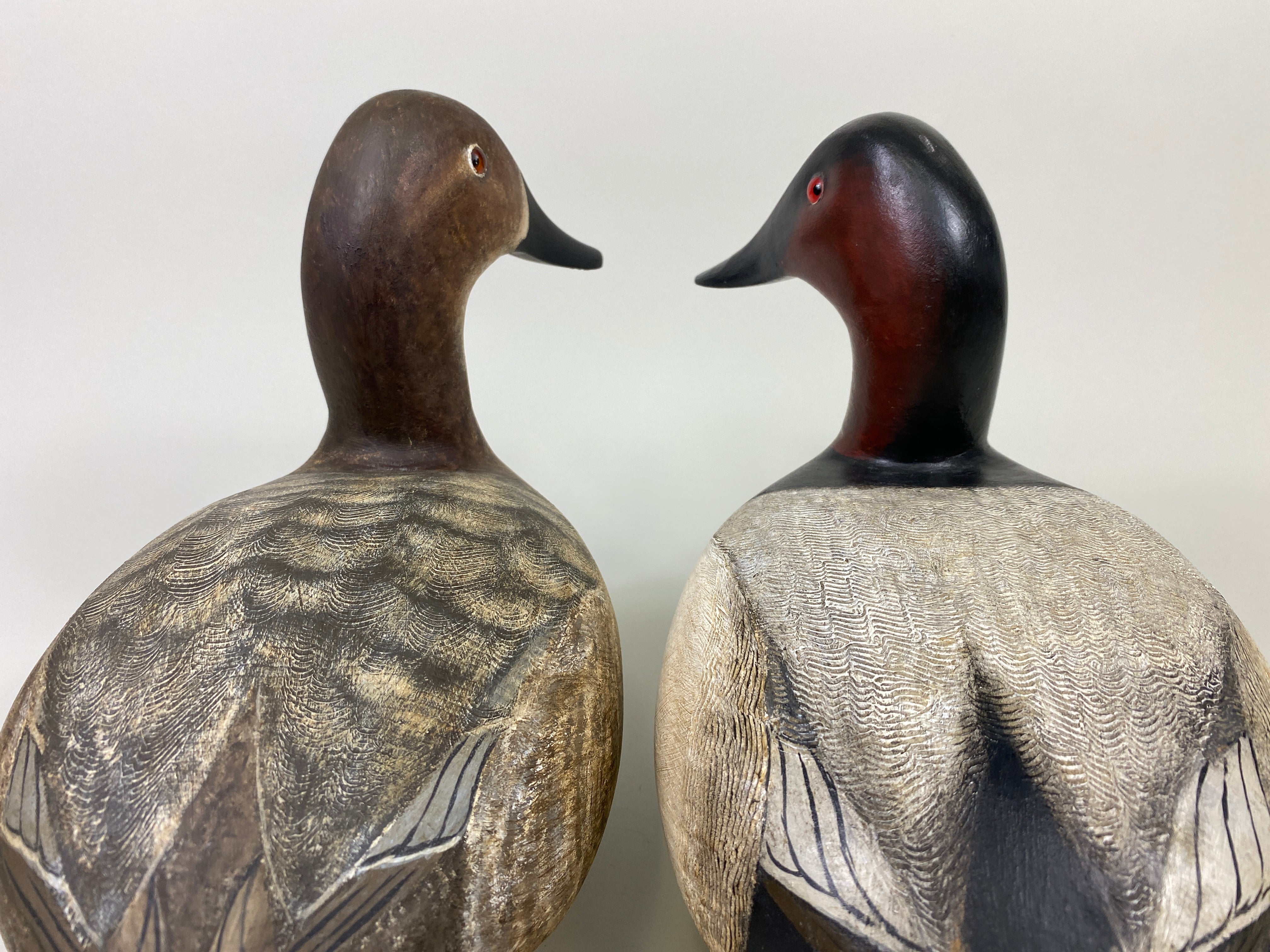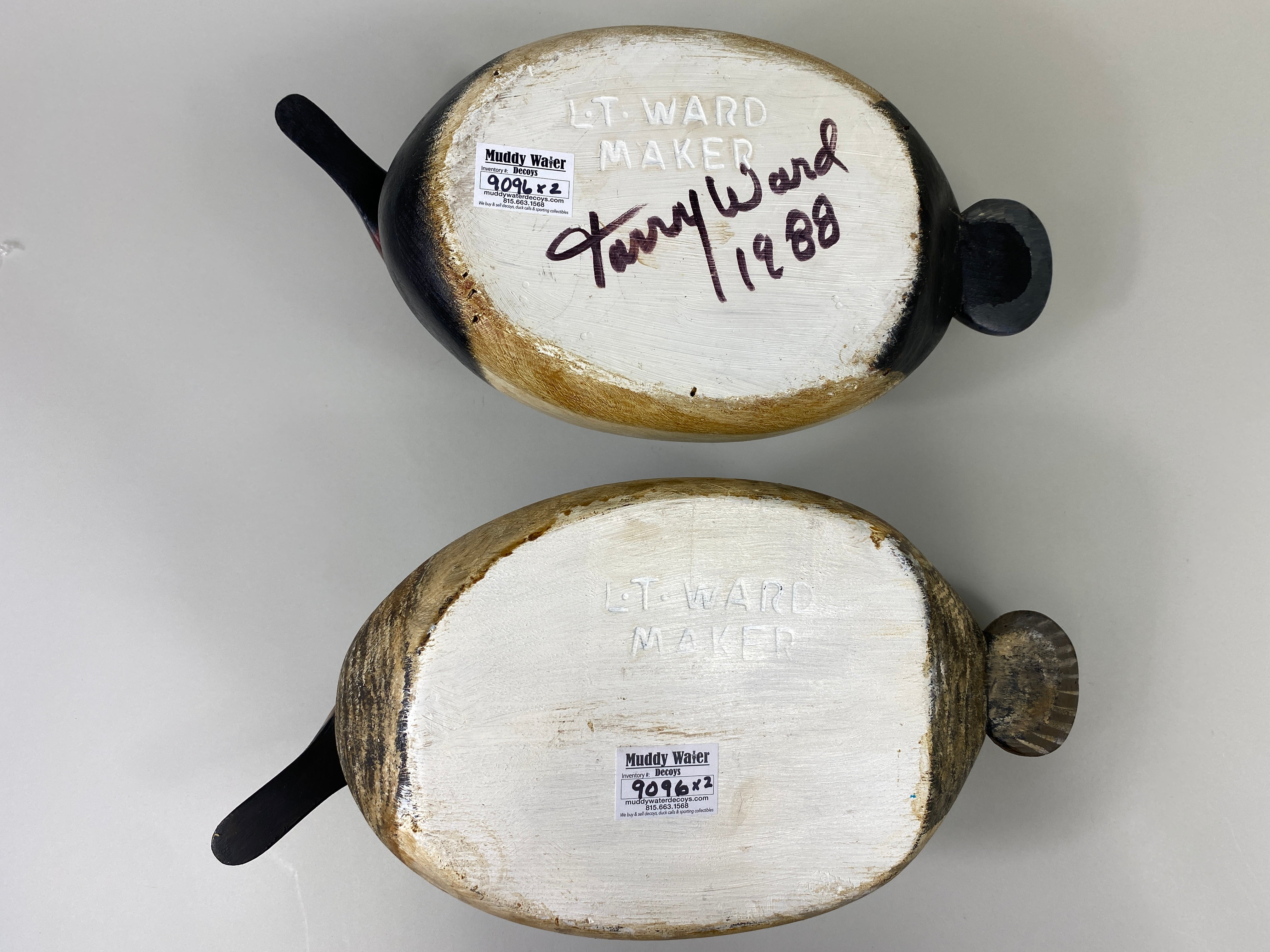 Pair of Torry Ward Canvasbacks, Manitoba, Canada. Glass eyes, hollow bodies, very nice original paint, slightly turned heads, comb painting on the backs, and very detailed. Bottoms have "L.T. WARD...