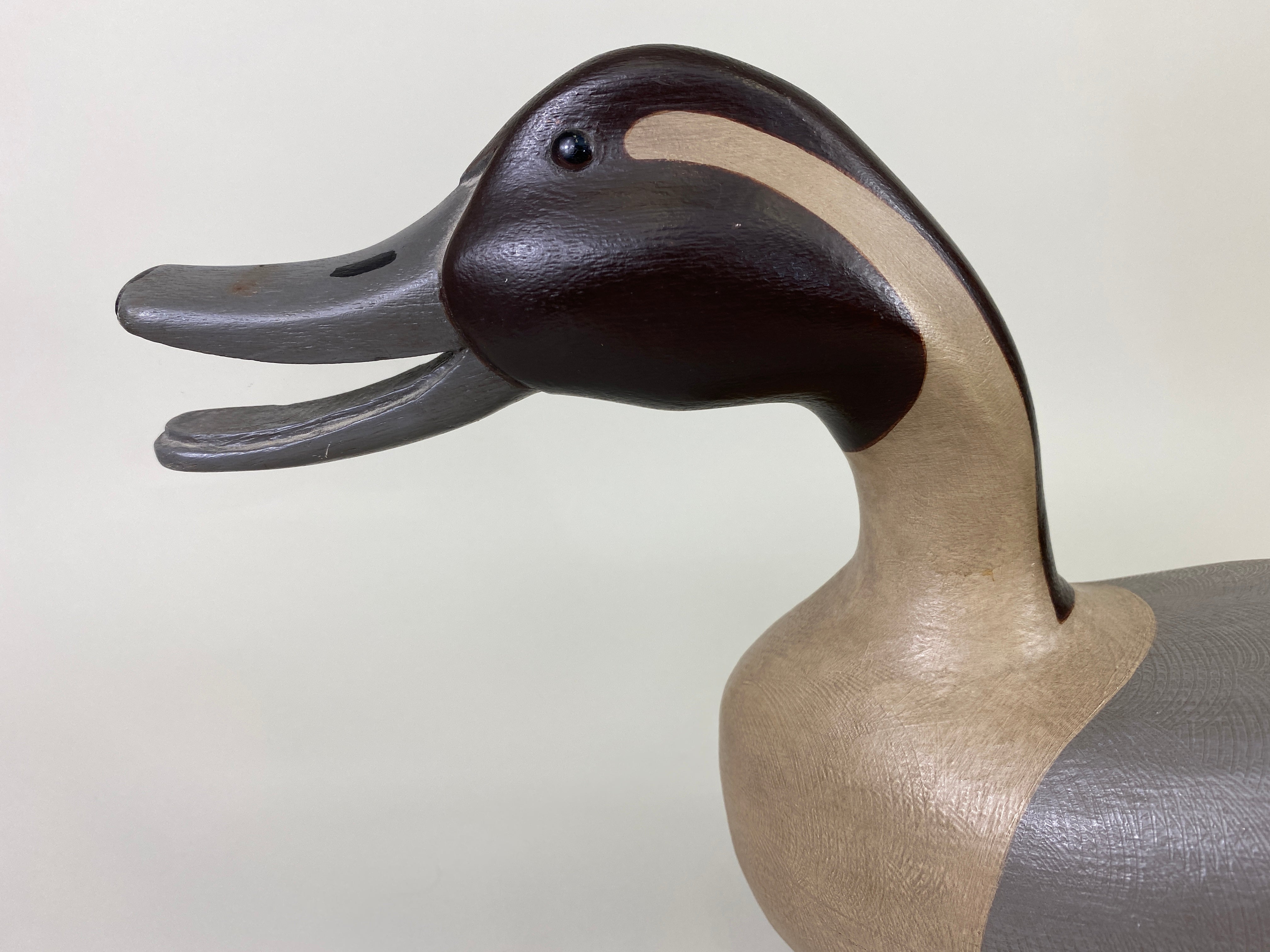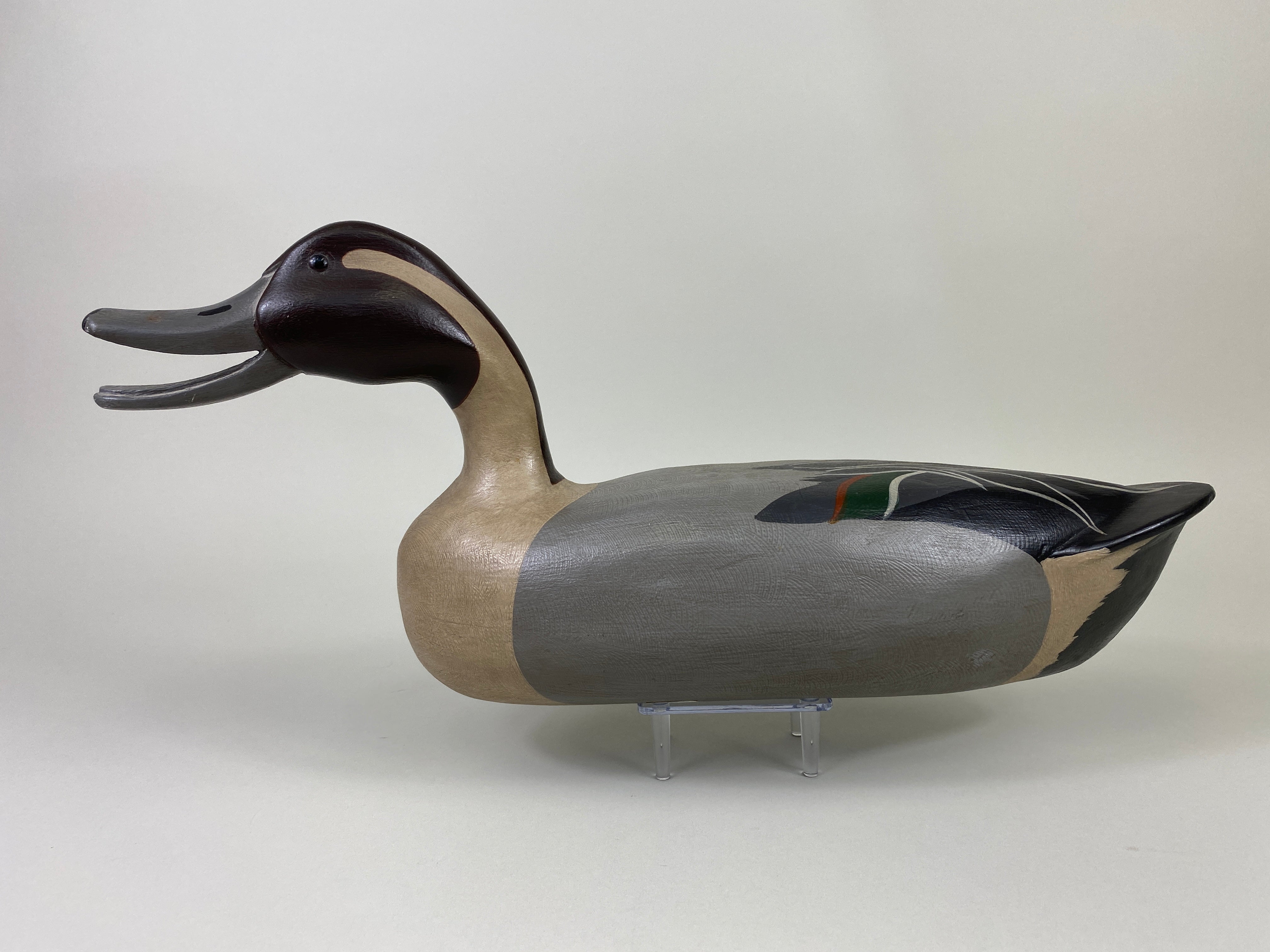 Virgil Hodge pintail drake, Williamsfield, Illinois. Calling position, glass eyes, repaint by Dave Frier in 1975, hollow body, comb painting, nicely done. Decoy is in good condition with minor wear...