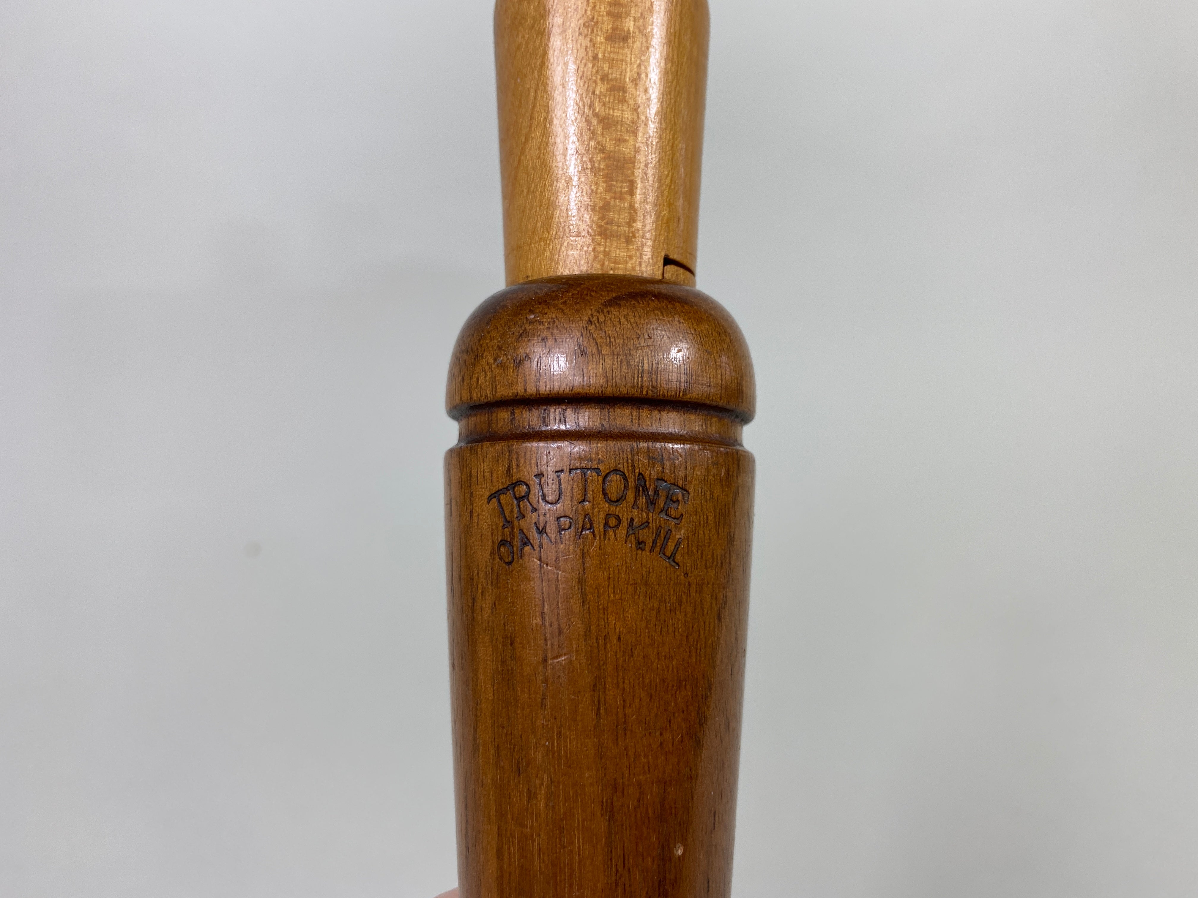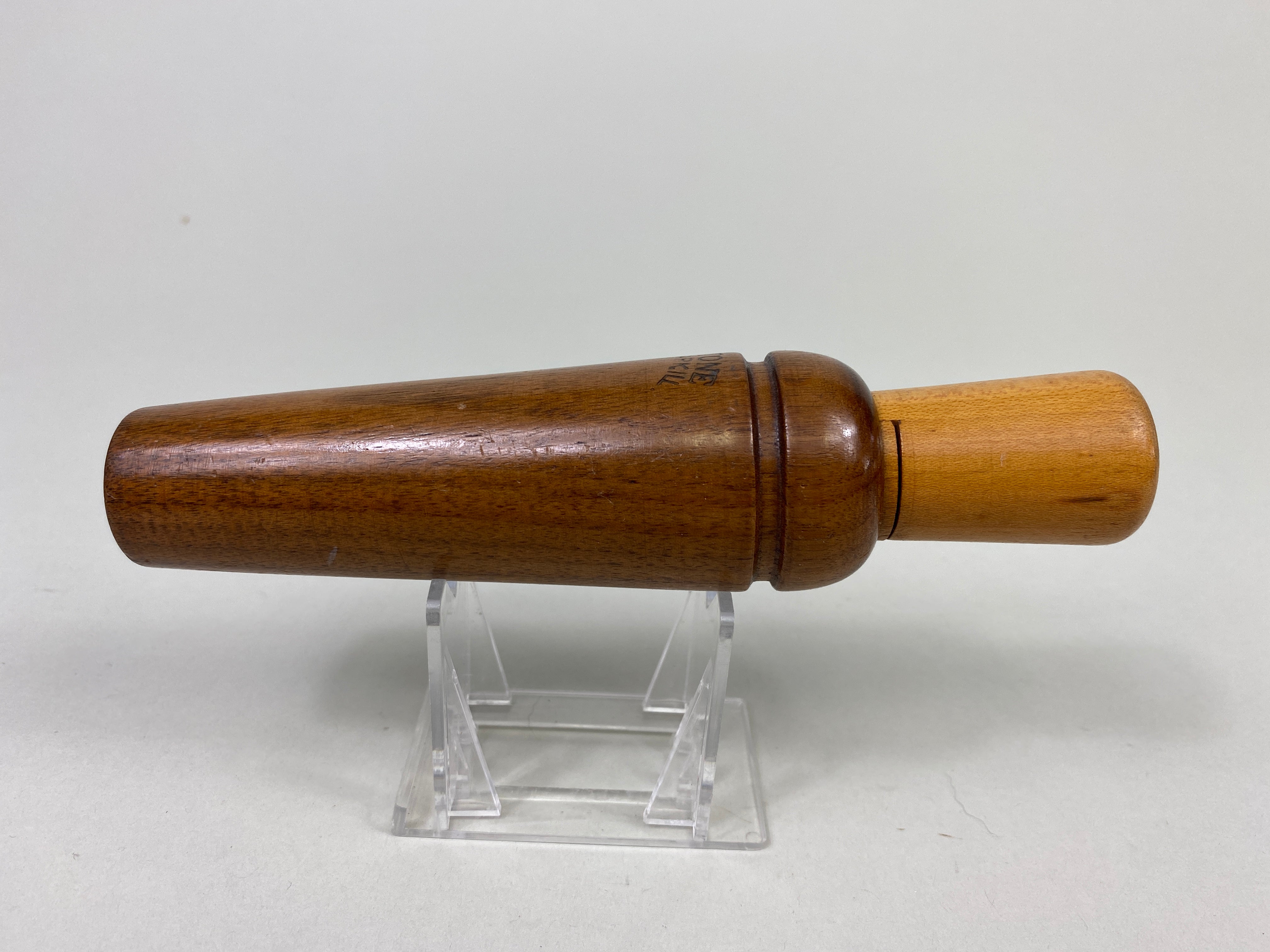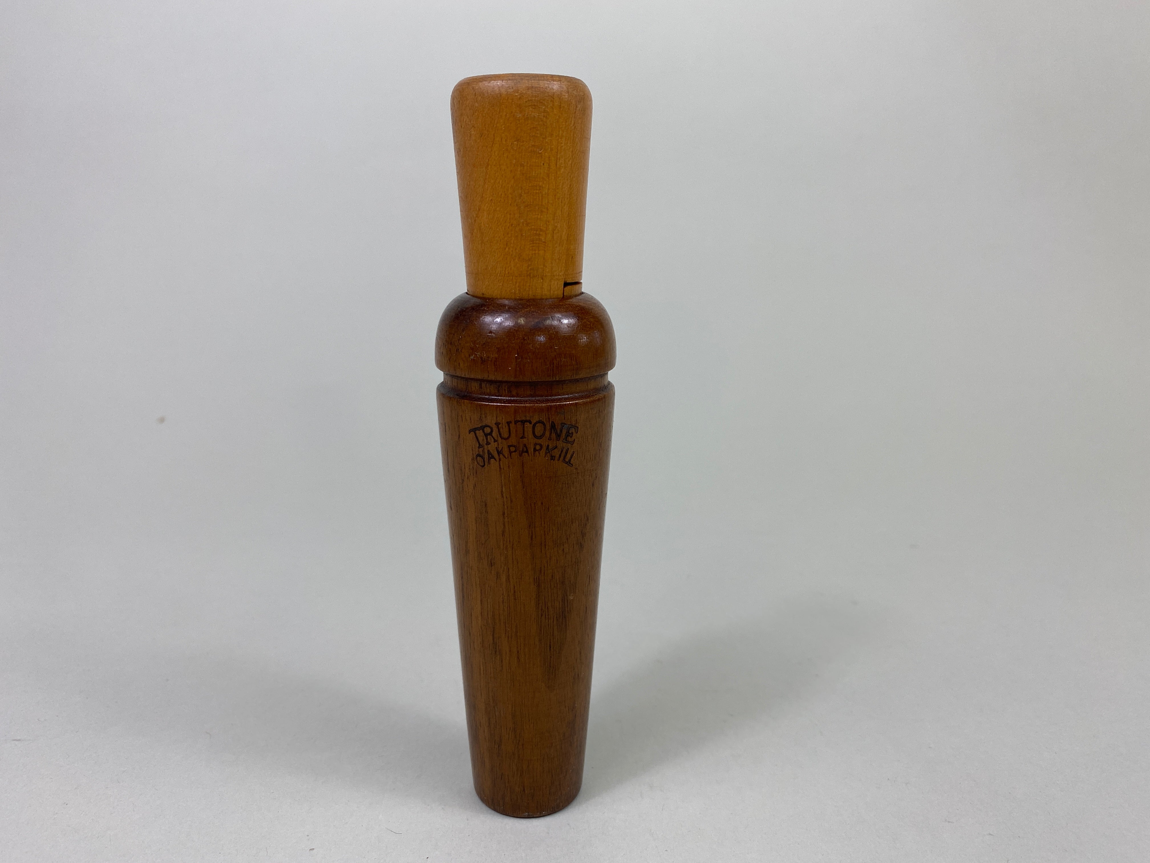 TruTone Wooden Duck Call, Oak Park, Illinois. Call works, has minor wear from use, single metal reed, has the Tru Tone stamp on barrel. Measures 6-1/2" long.