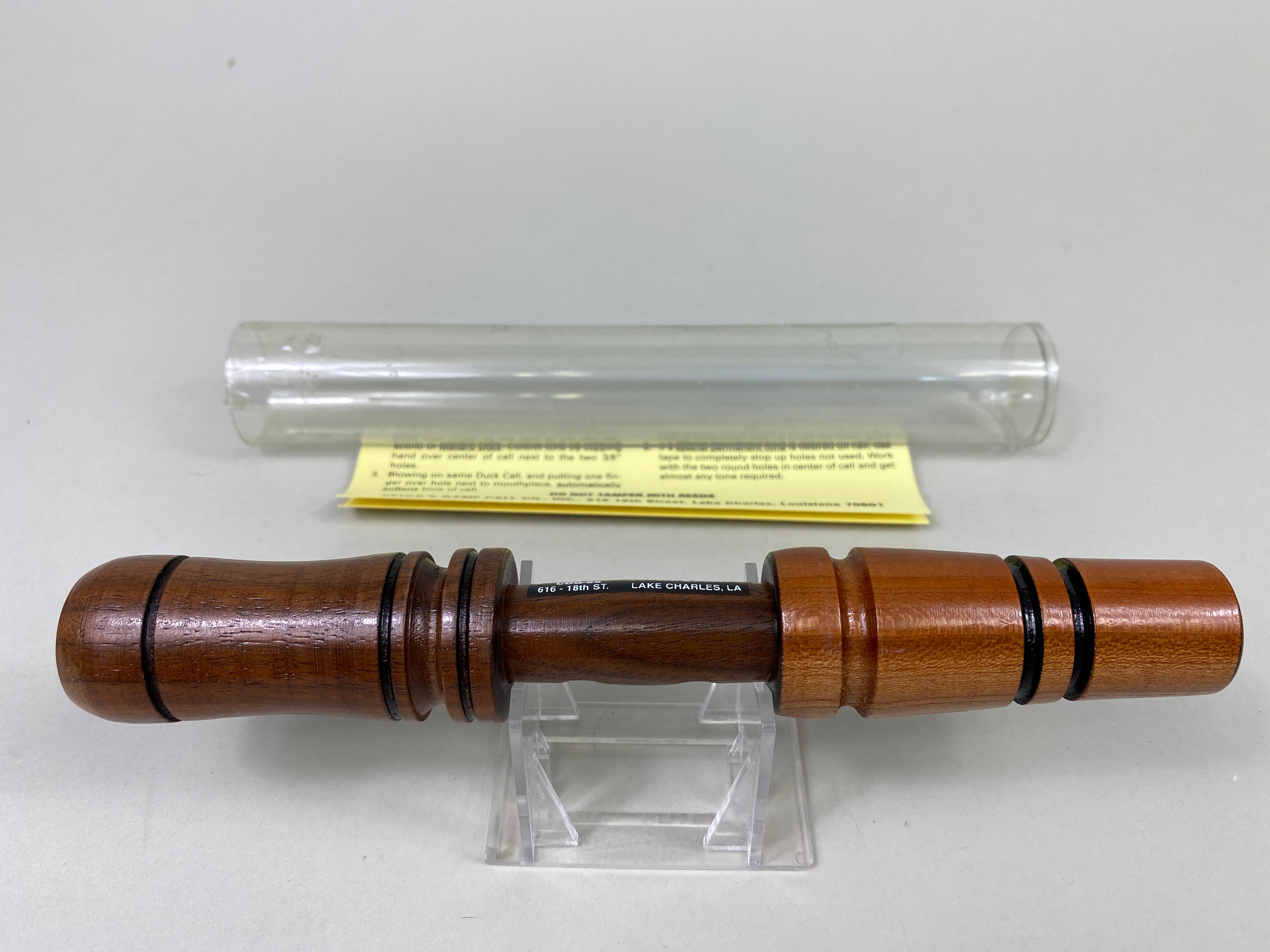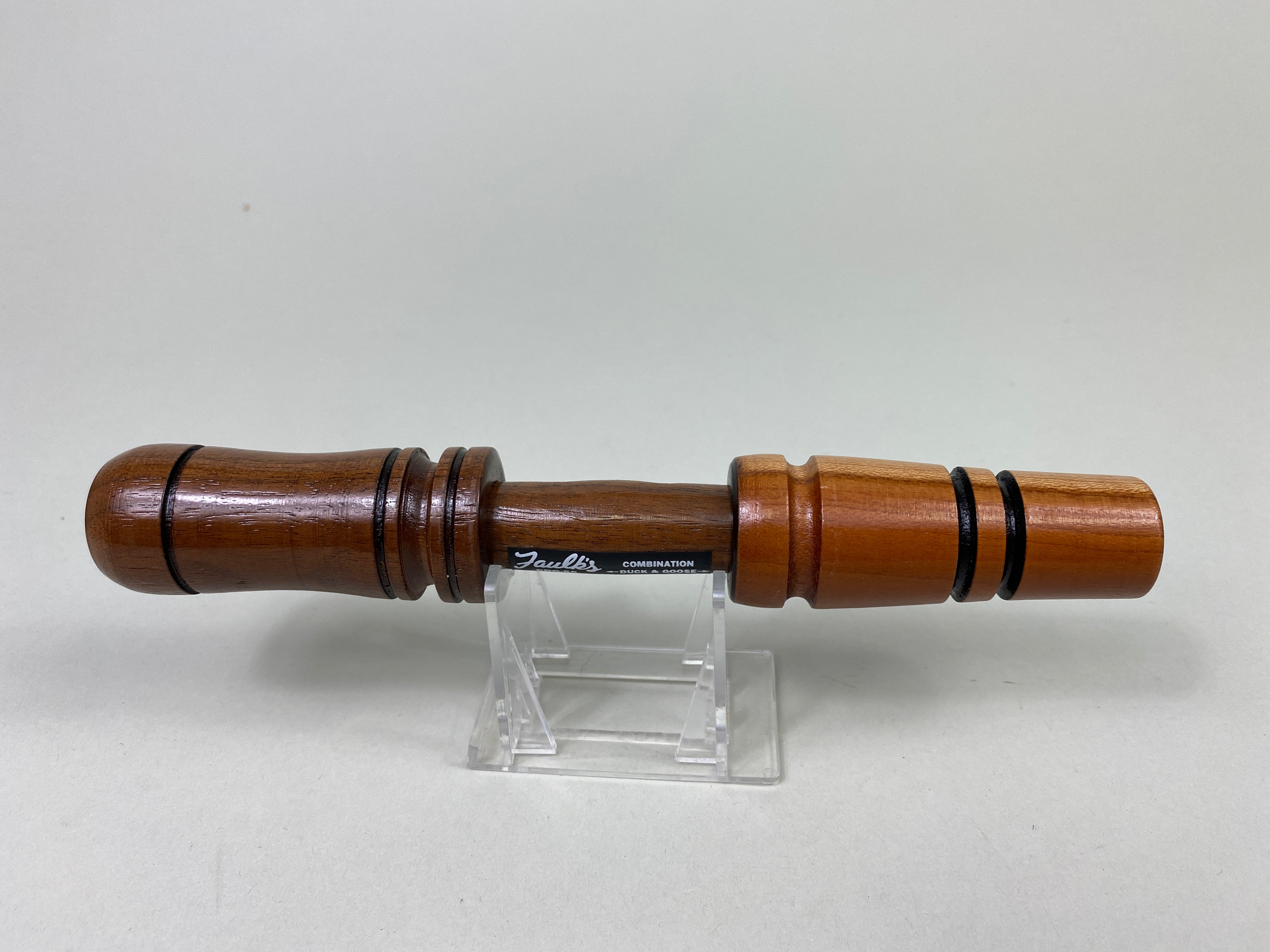 Faulk's Combination Duck & Goose Call in tube with paperwork, Lake Charles, Louisiana. This wooden call is in good condition with crisp label, and works. Tube has one end missing. ...