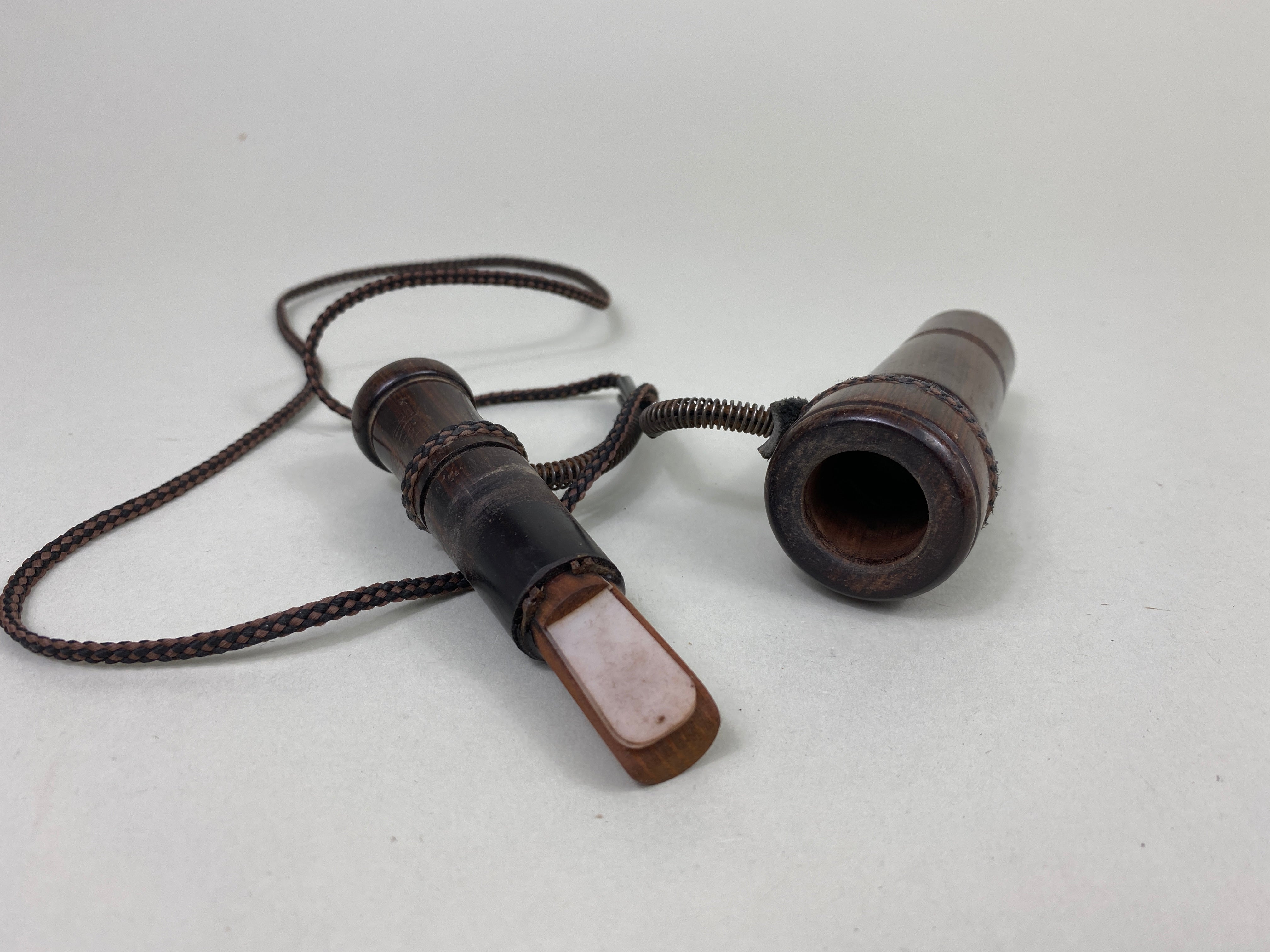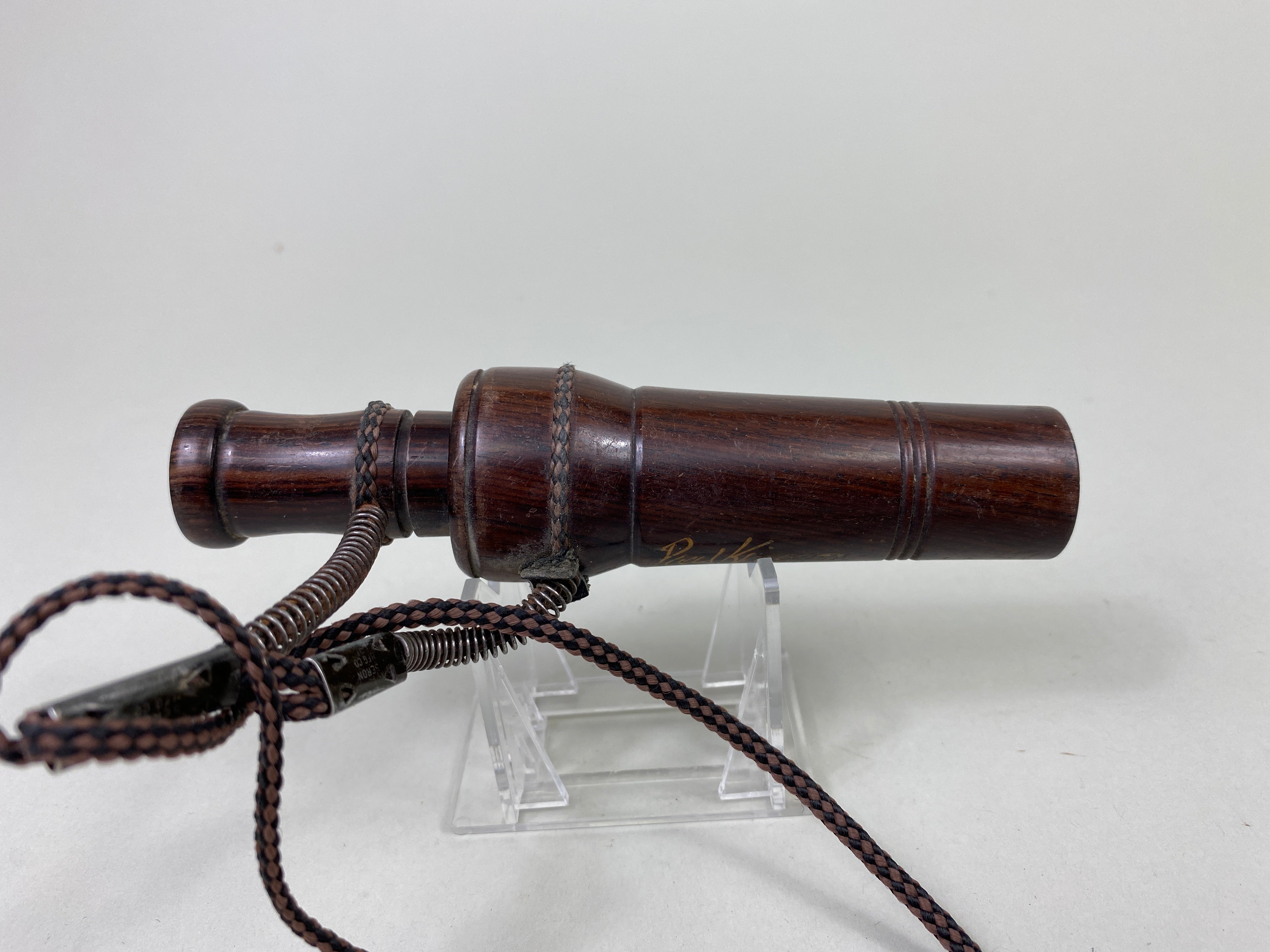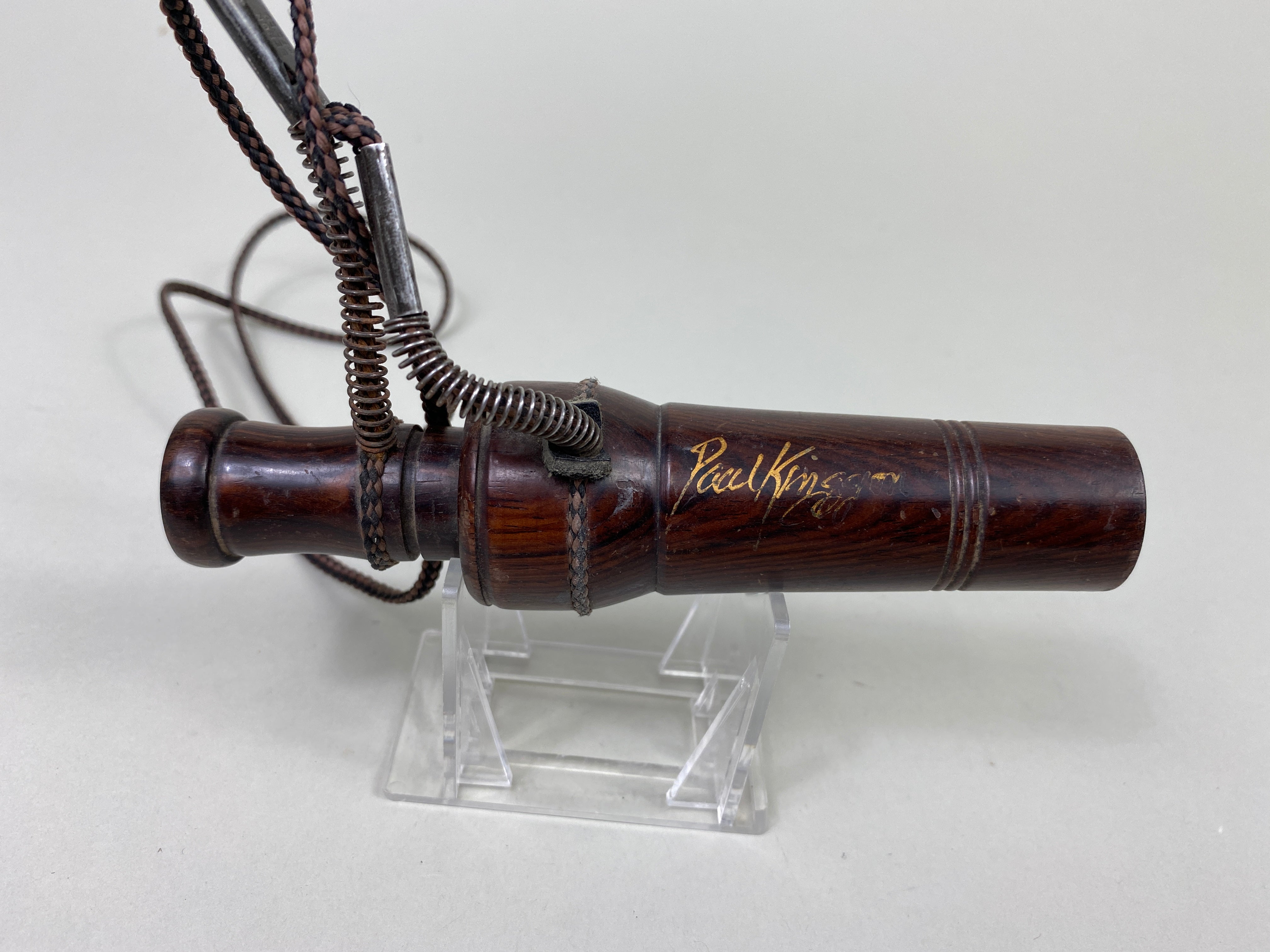 Paul Kingyon, Burlington, Iowa, Wooden Duck Call. Double plastic reed, signed on barrel, call works and has some minor wear from use. Measures 5-1/2" long, lanyard included.