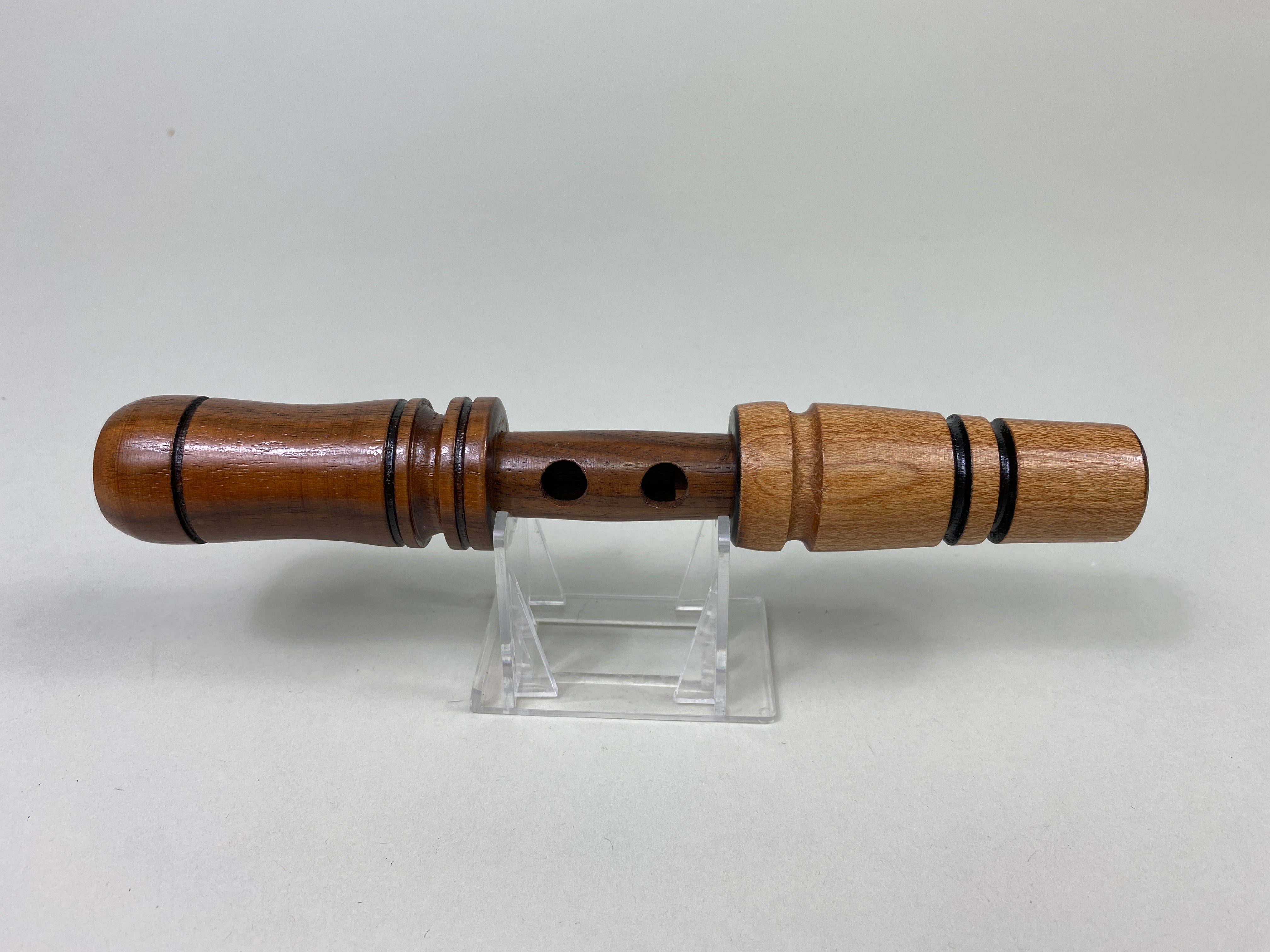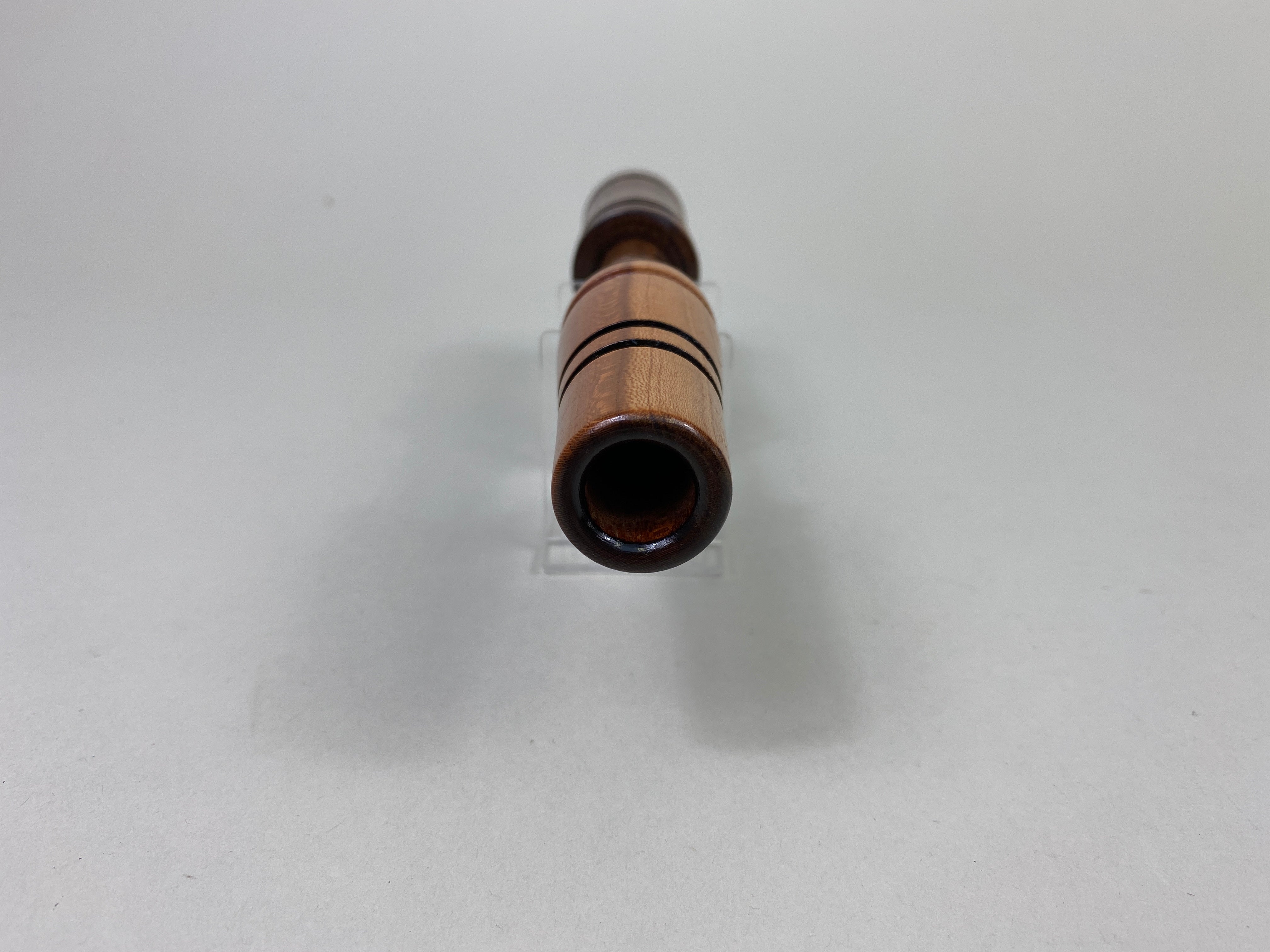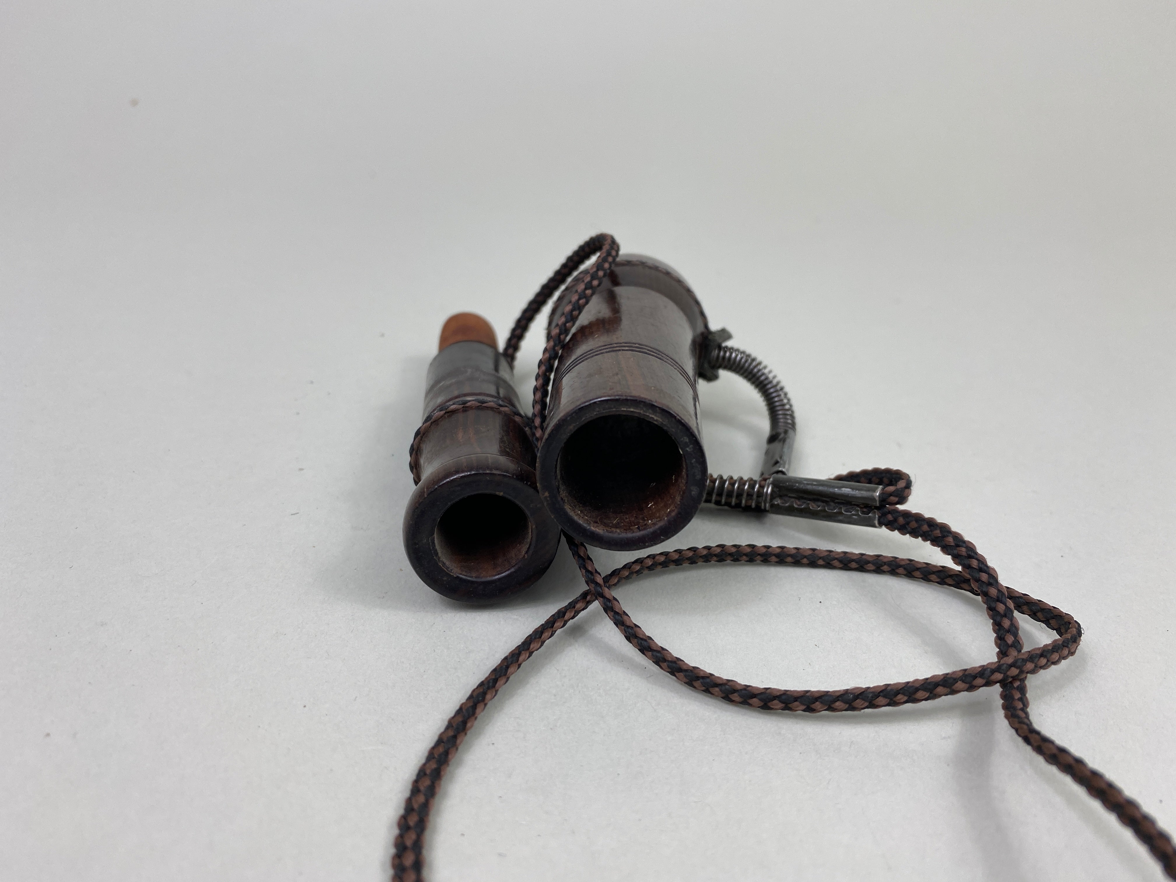Paul Kingyon, Burlington, Iowa, Wooden Duck Call. Double plastic reed, signed on barrel, call works and has some minor wear from use. Measures 5-1/2" long, lanyard included.