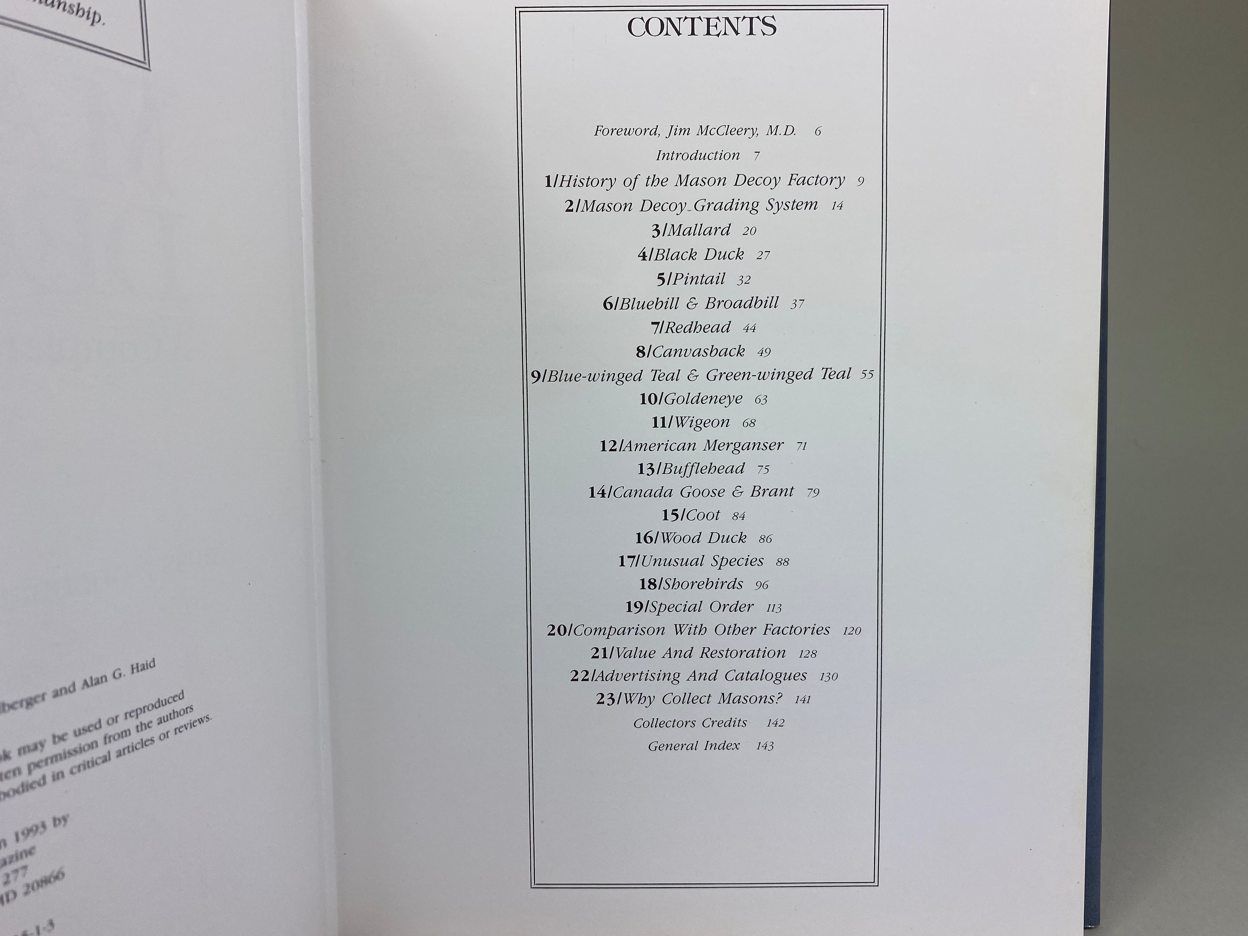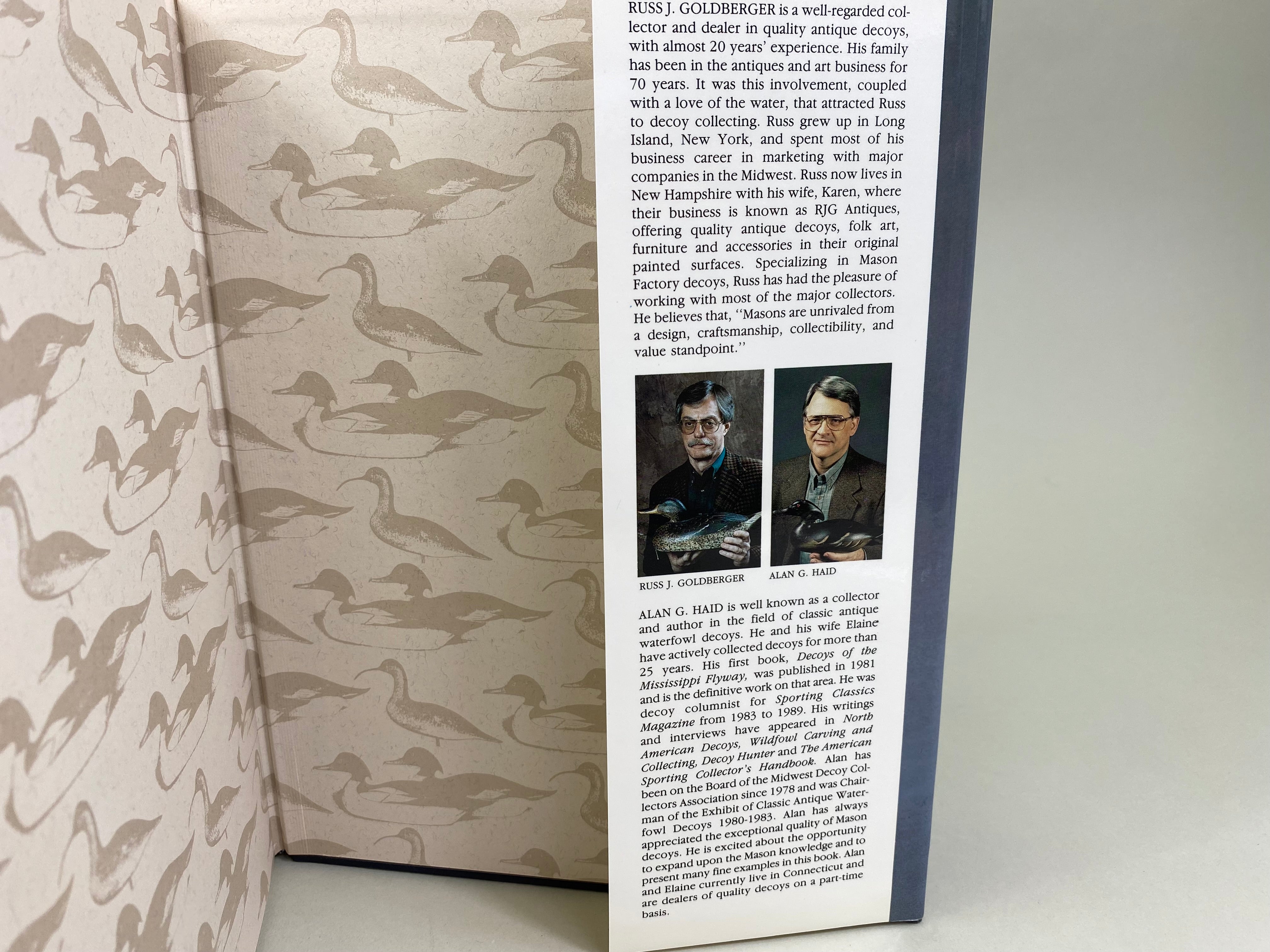 Mason Decoys A Complete Pictorial Guide by Russ J. Goldberger and Alan G. Haid. This 143 page hard cover book is filled with colored pictures of Mason decoys with descriptions...