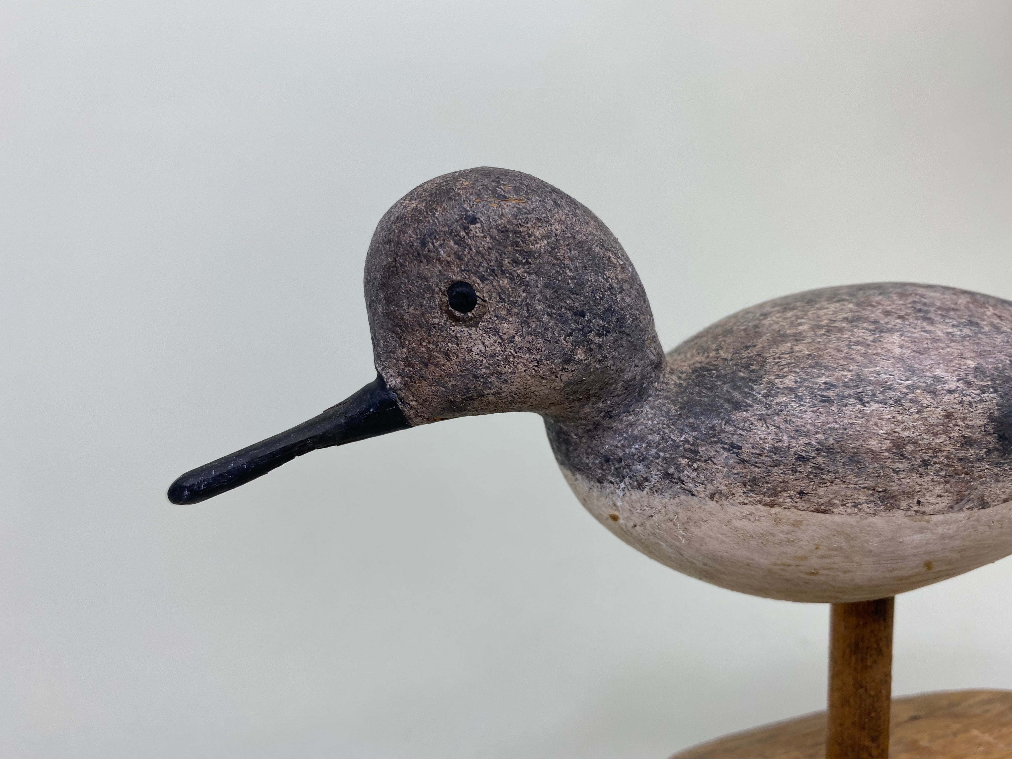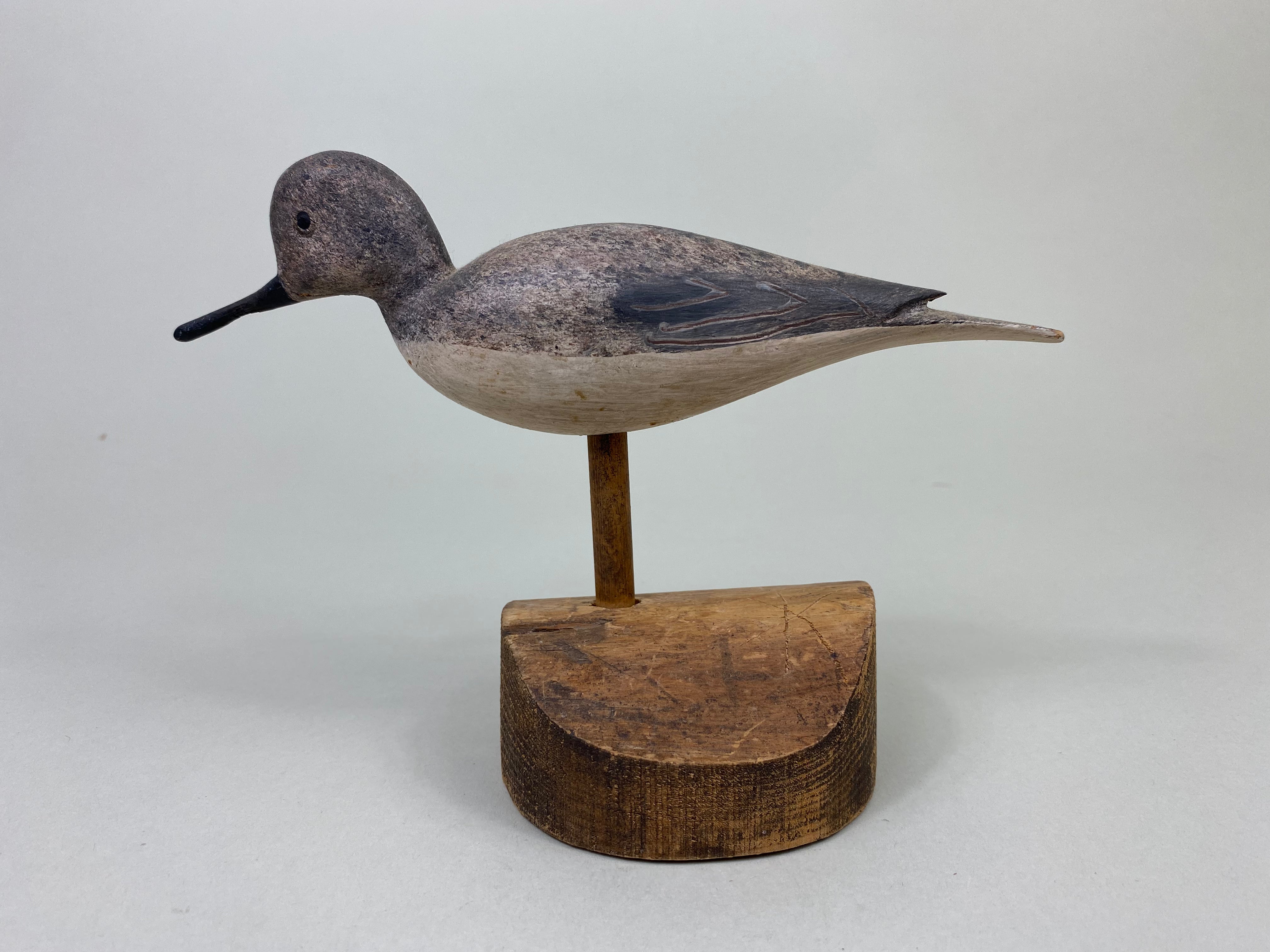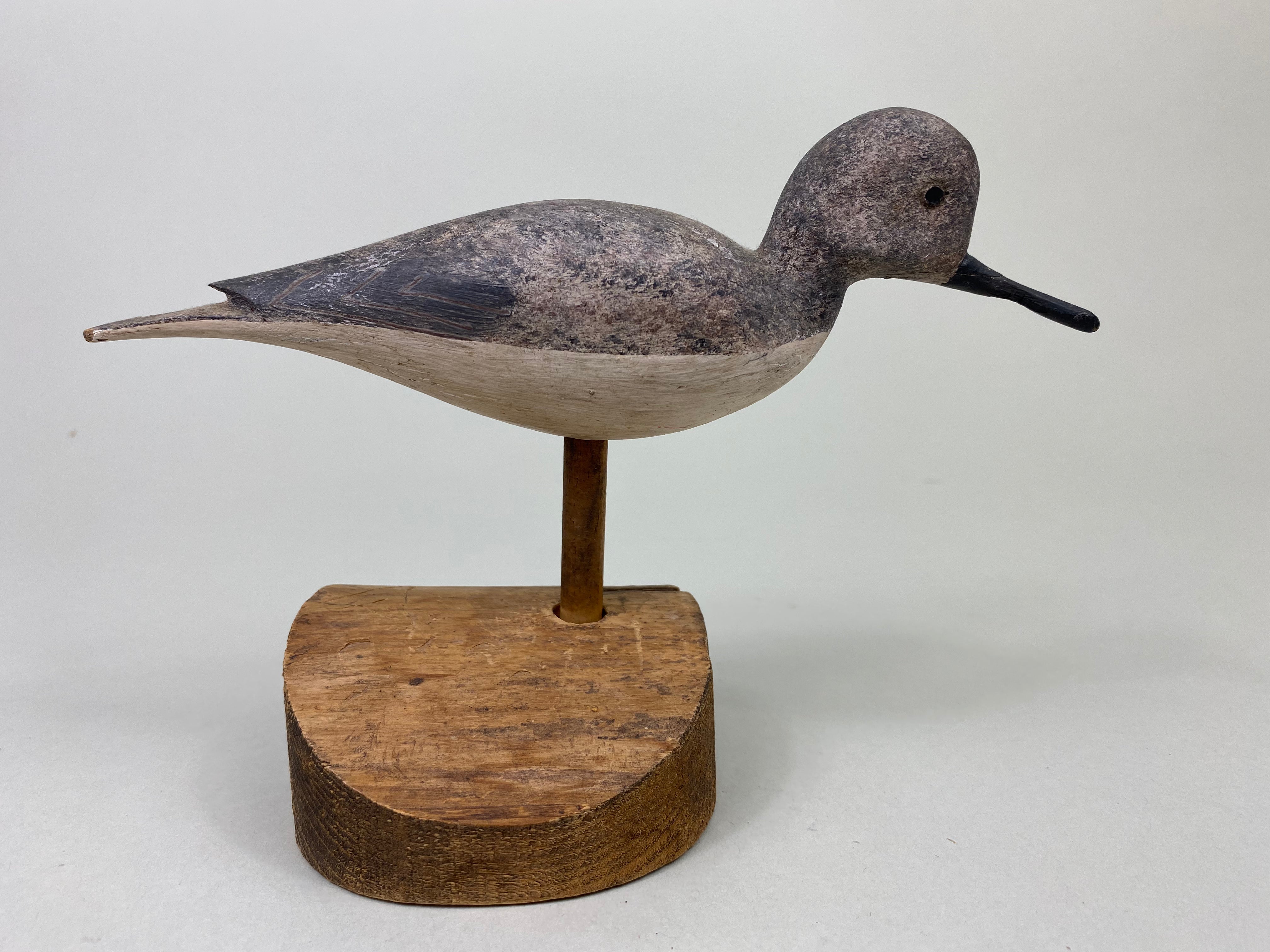Unknown New Jersey Shorebird, Circa 1890's. Mostly original paint, decoy has a metal bill, painted eyes, wood chip on tail and some hunting wear, wooden stand included. Decoy is 13"...