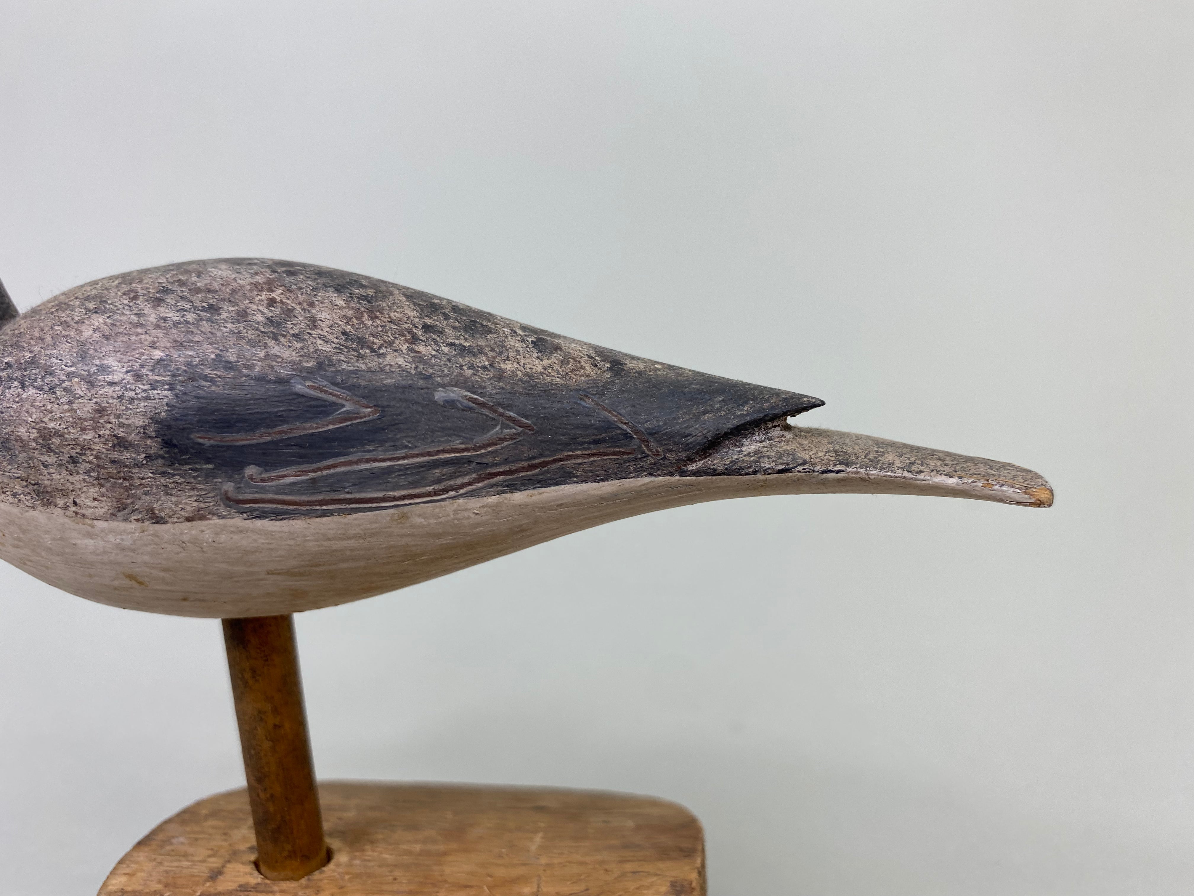 Unknown New Jersey Shorebird. Mostly original paint, circa 1890's, metal stand, has some bee-bee marks and some hunting wear, blunted bill, hole in body for carrying the rig, carved split...