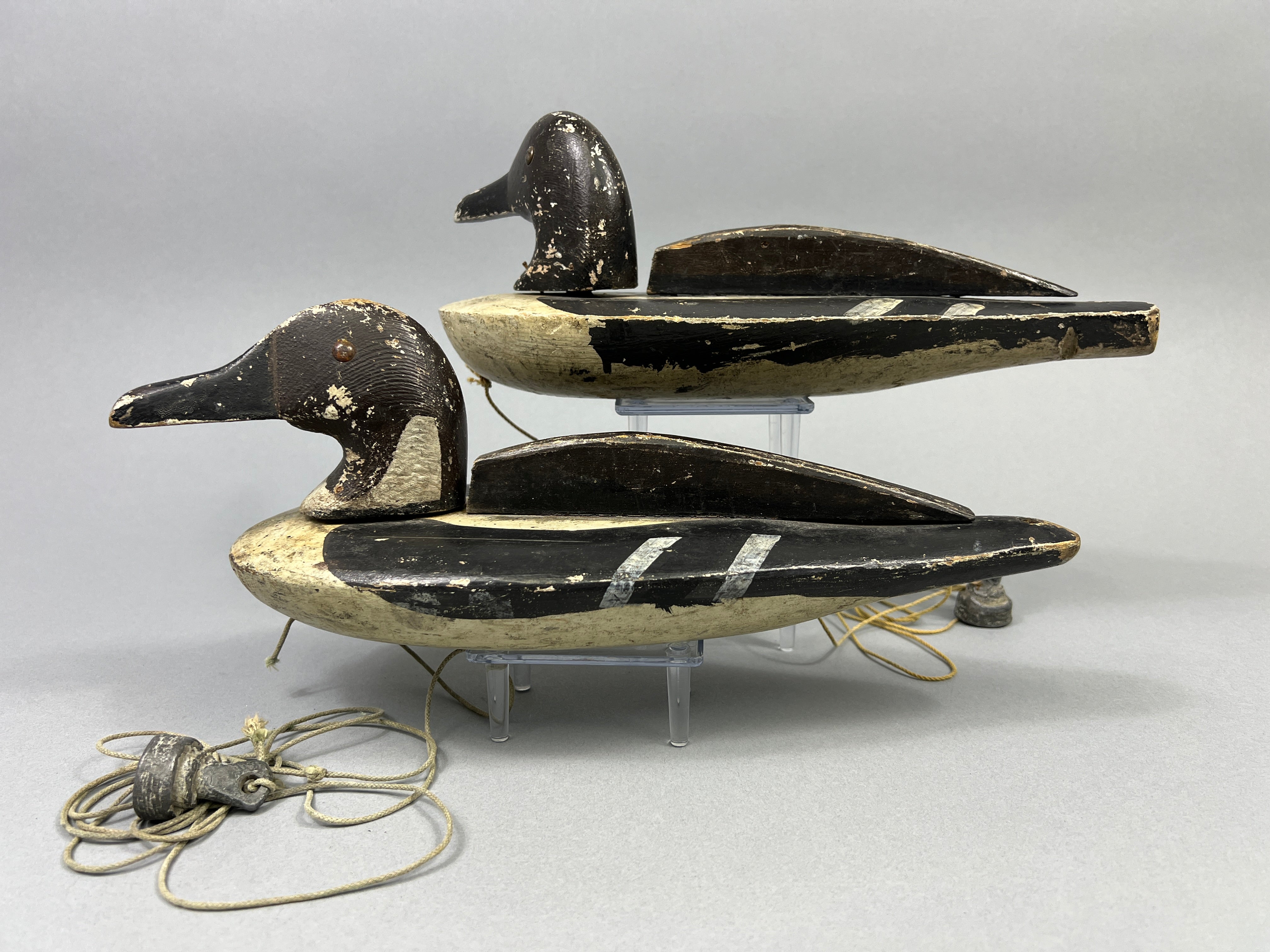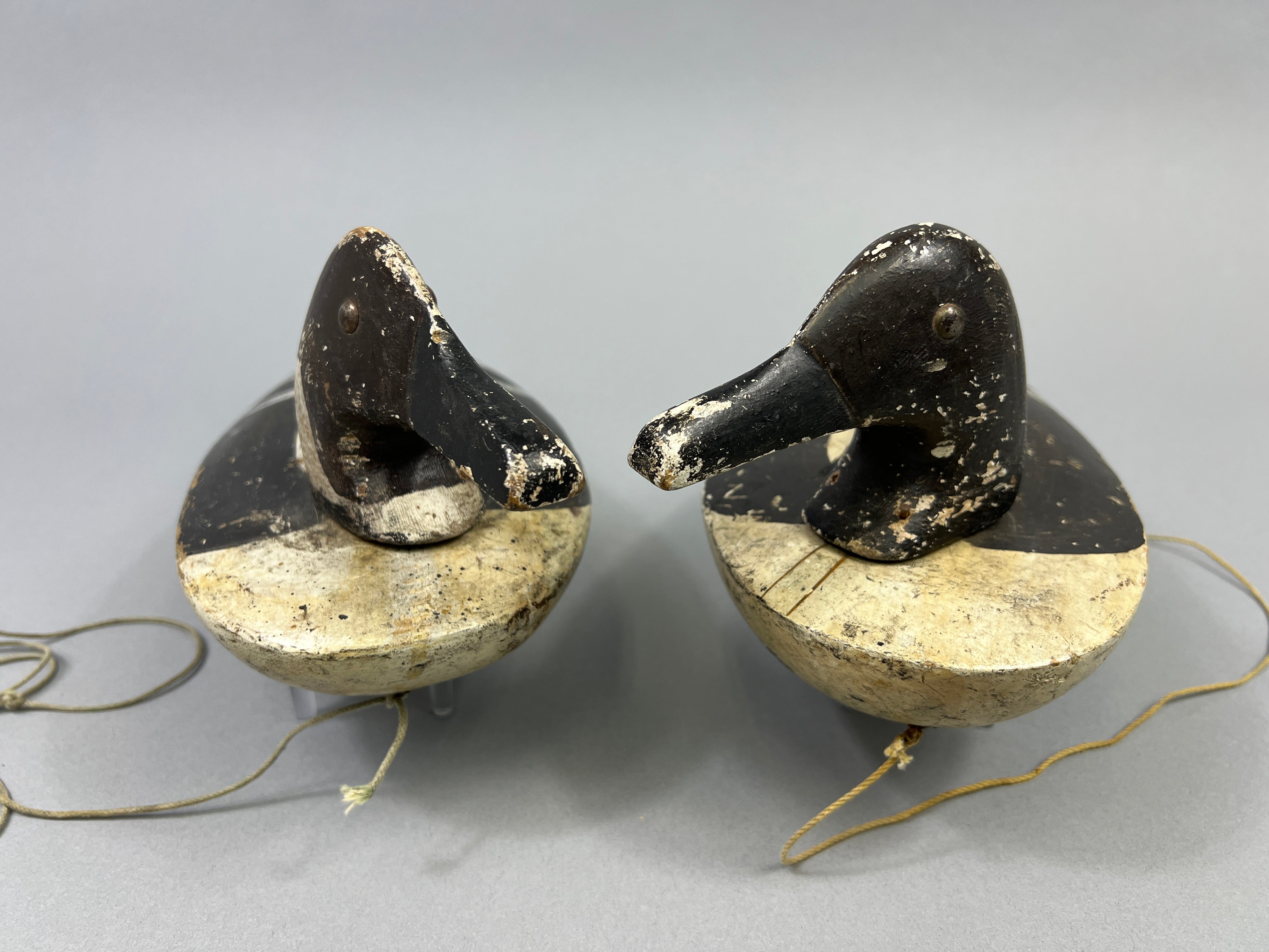Pair of Unknown Wisconsin Folky Pintails. Circa 1920's, tack eyes, original paint, solid bodies with unique design, hole in end of tail for carrying, lines and weights, hunting wear from...