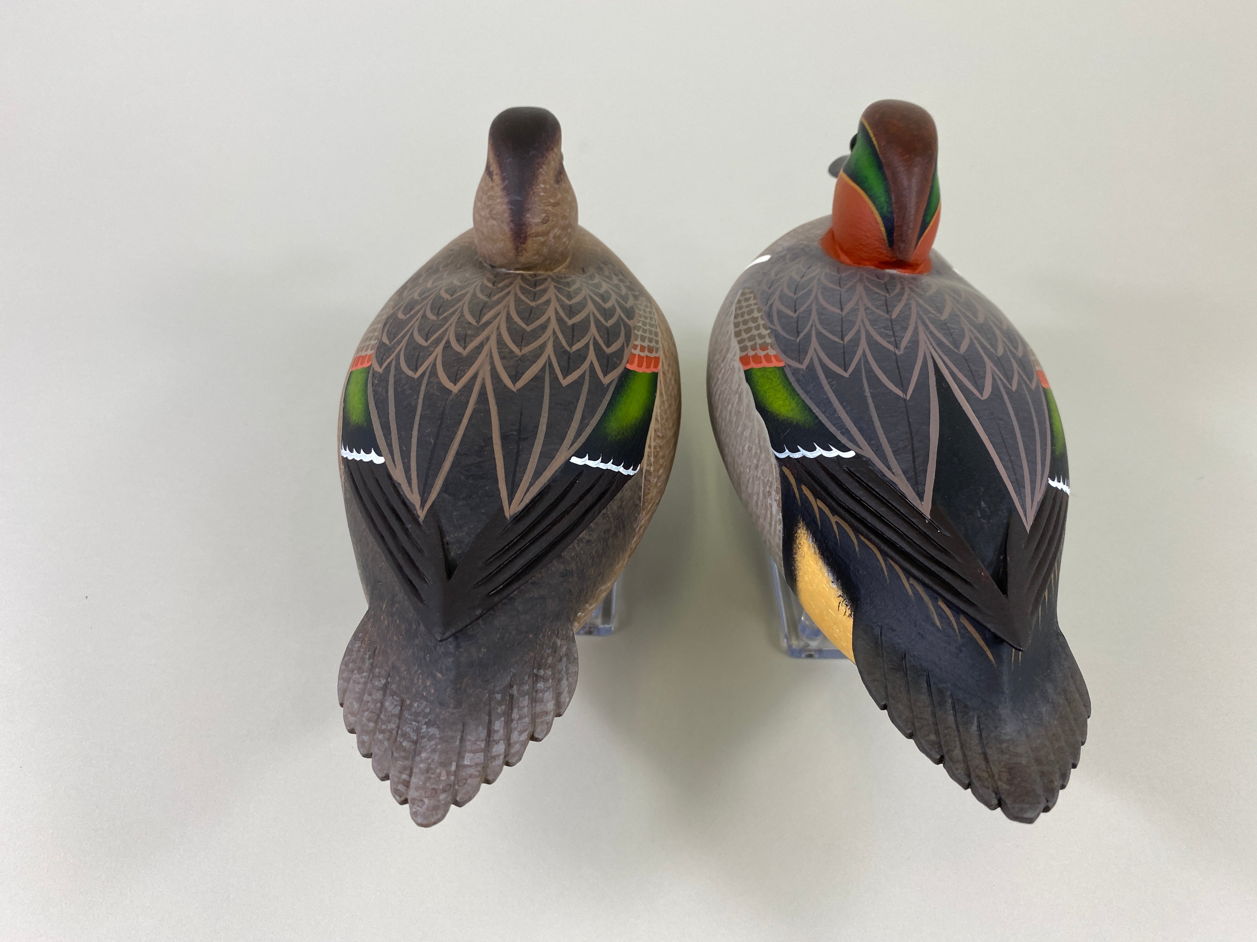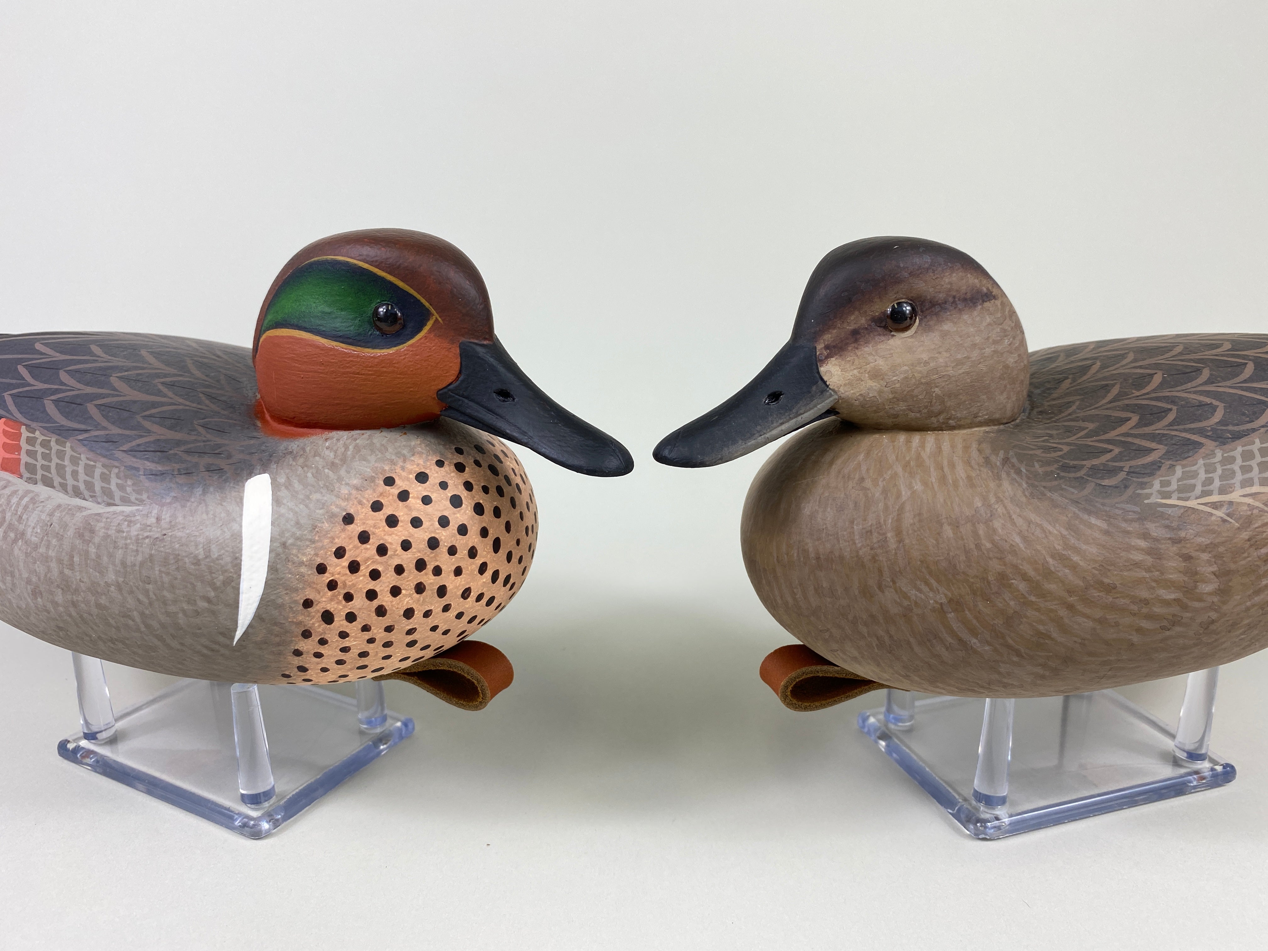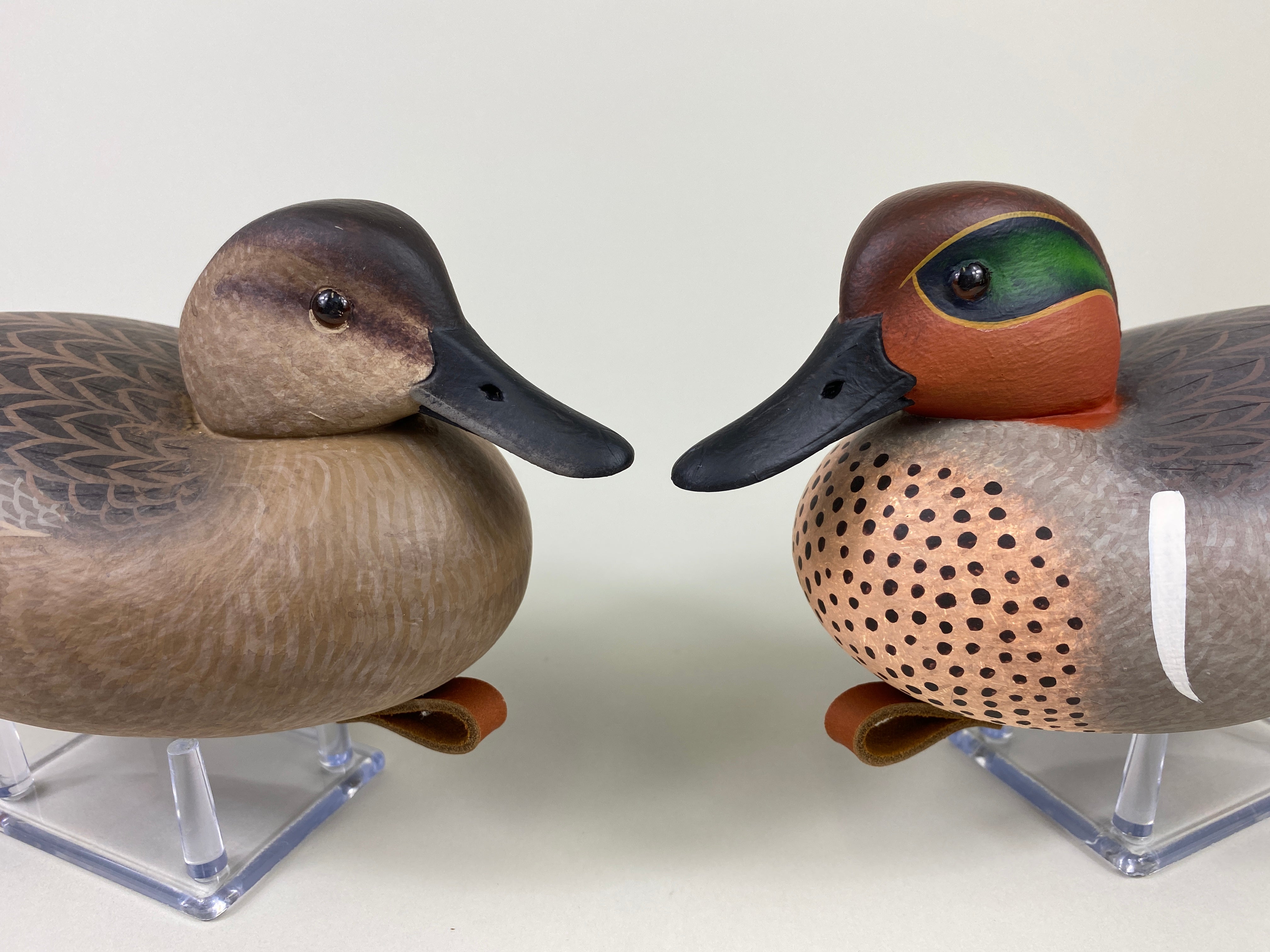 Frederick "Rick" Brown Pair of Green-Winged Teal, Ocean County New Jersey. All original, near mint, glass eyes, hollow body, very detailed painting with carved tail/feathers. Bottoms have pad weights, brass...