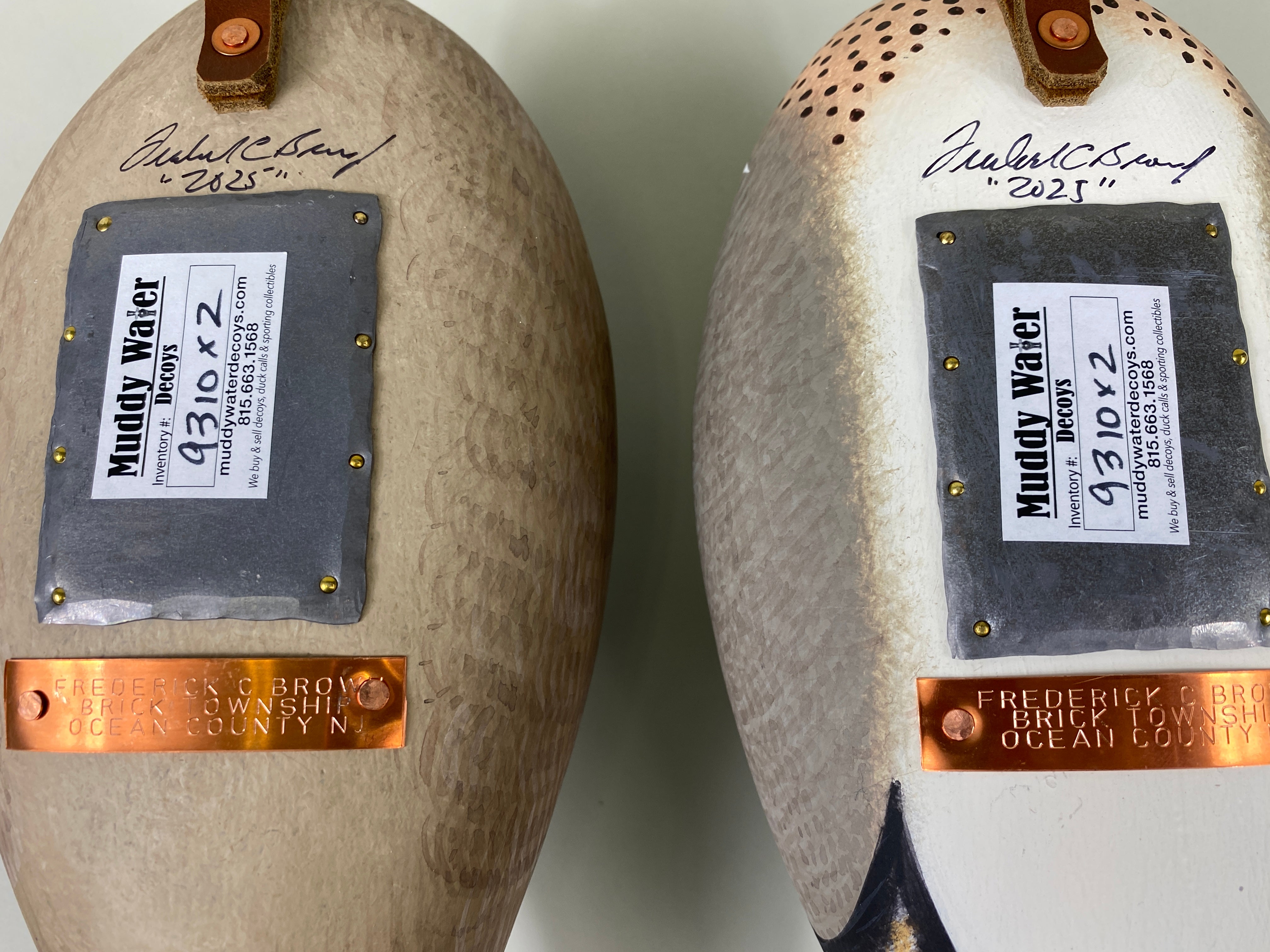 Frederick "Rick" Brown Brant, New Jersey. All original, near mint, glass eyes, very nicely done with detailed carving, pad lead weight, carver's brass tag, leather rigging strap, signed, dated "2025". ...