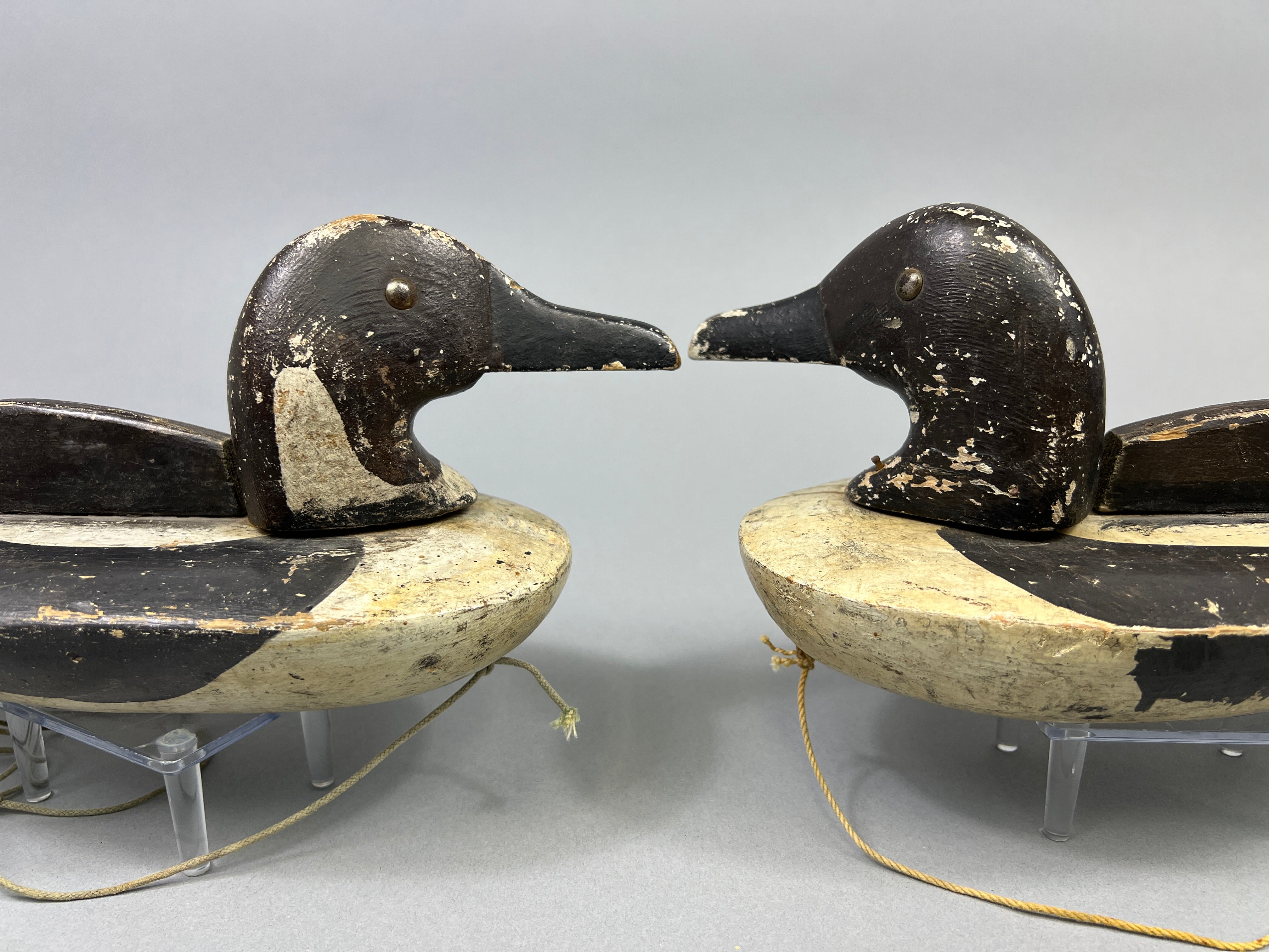 Rigmate pair of Canvasbacks by Wildfowler, Old Saybrook model, all original. Both have glass eyes, solid balsa bodies, original paint, and some hunting wear. Wooden keels on bottoms have lead...