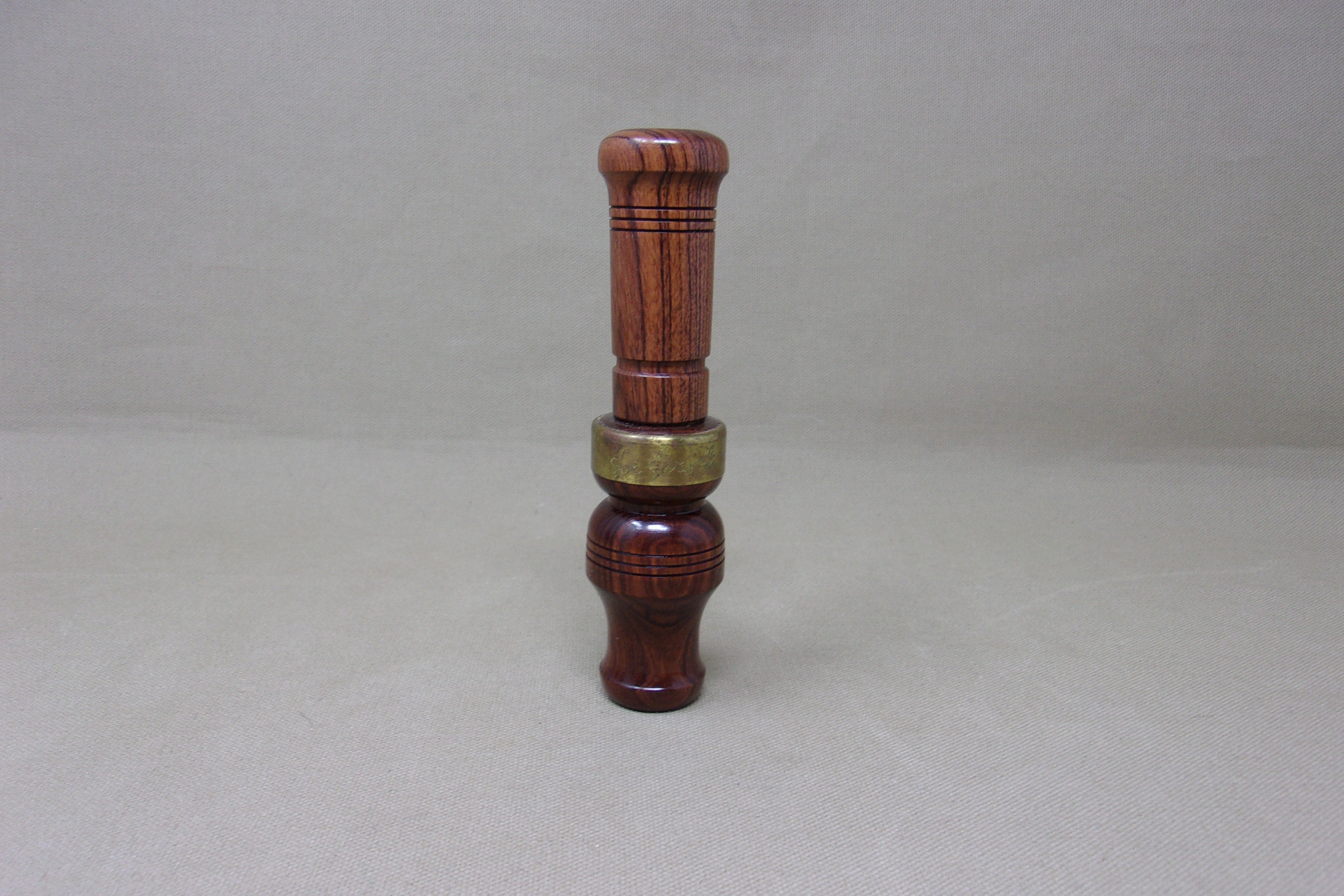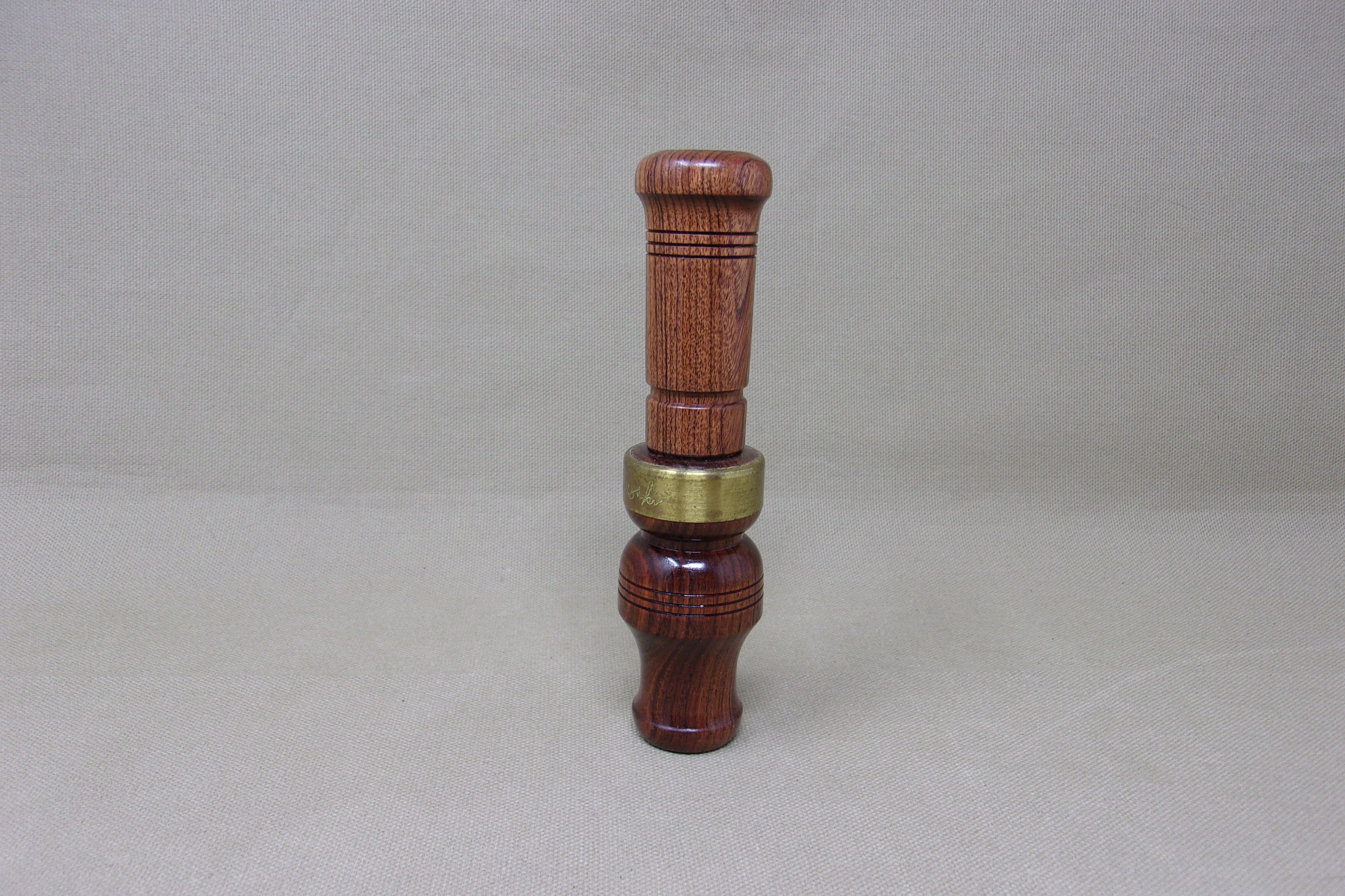 Dynze Calls Goose Call with box. Wooden barrel, brass band, acrylic stopper. Good sounding call, measures 4-1/2" long in very good condition.