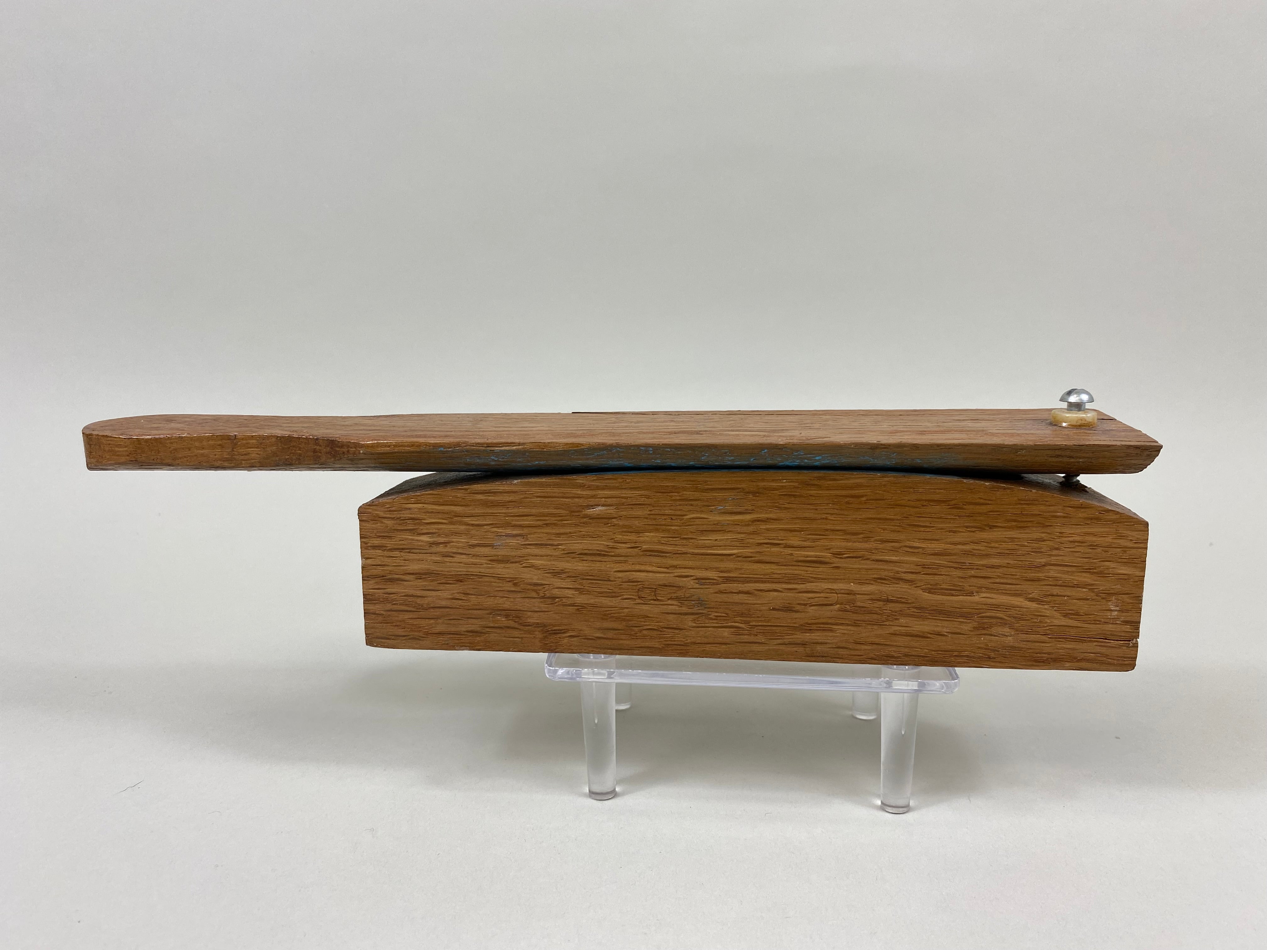 Wooden Turkey Call, unknown maker. Works and is in good condition. Measures 11-1/2" long, 2" wide, and 2-1/2" tall.