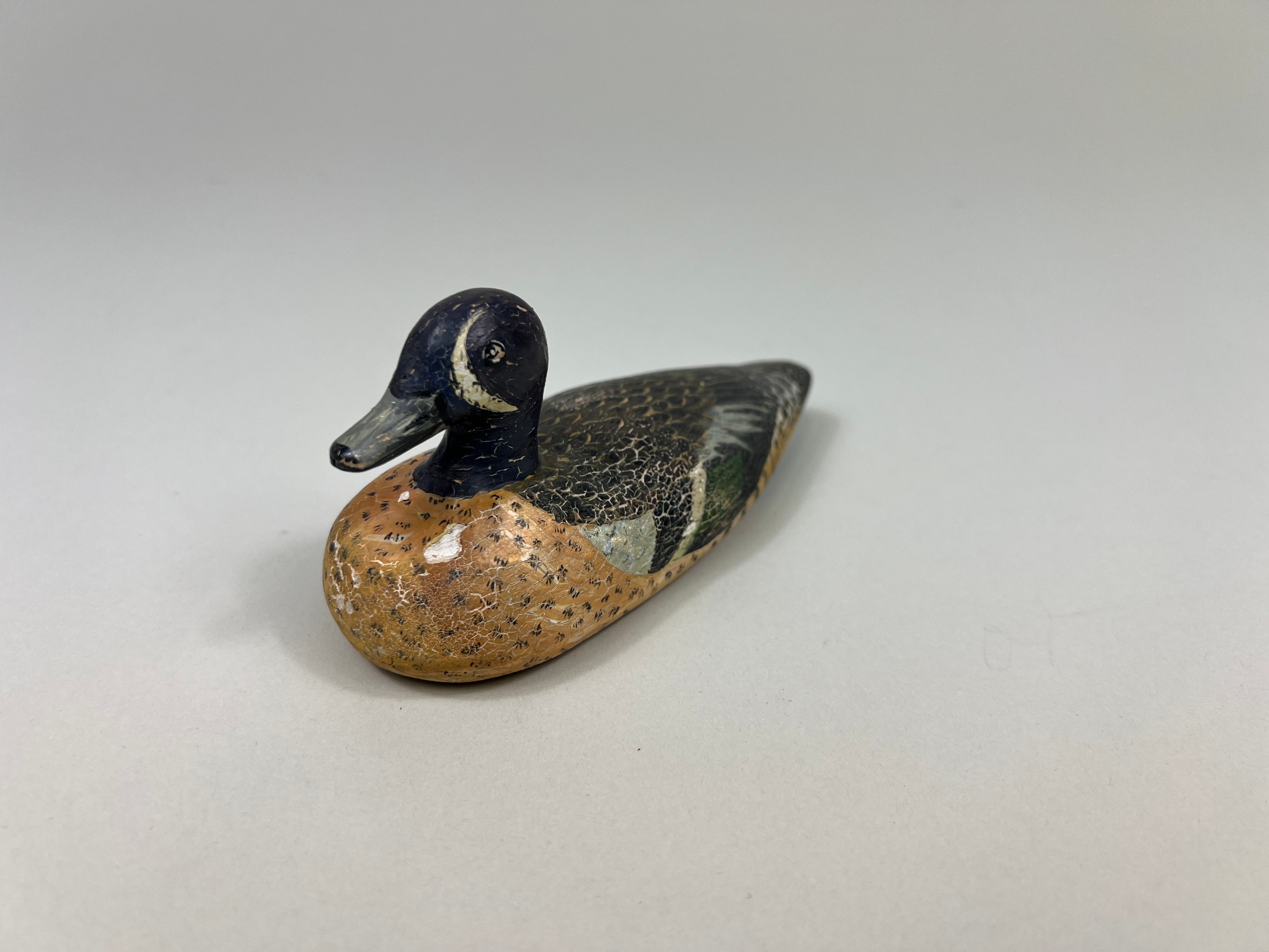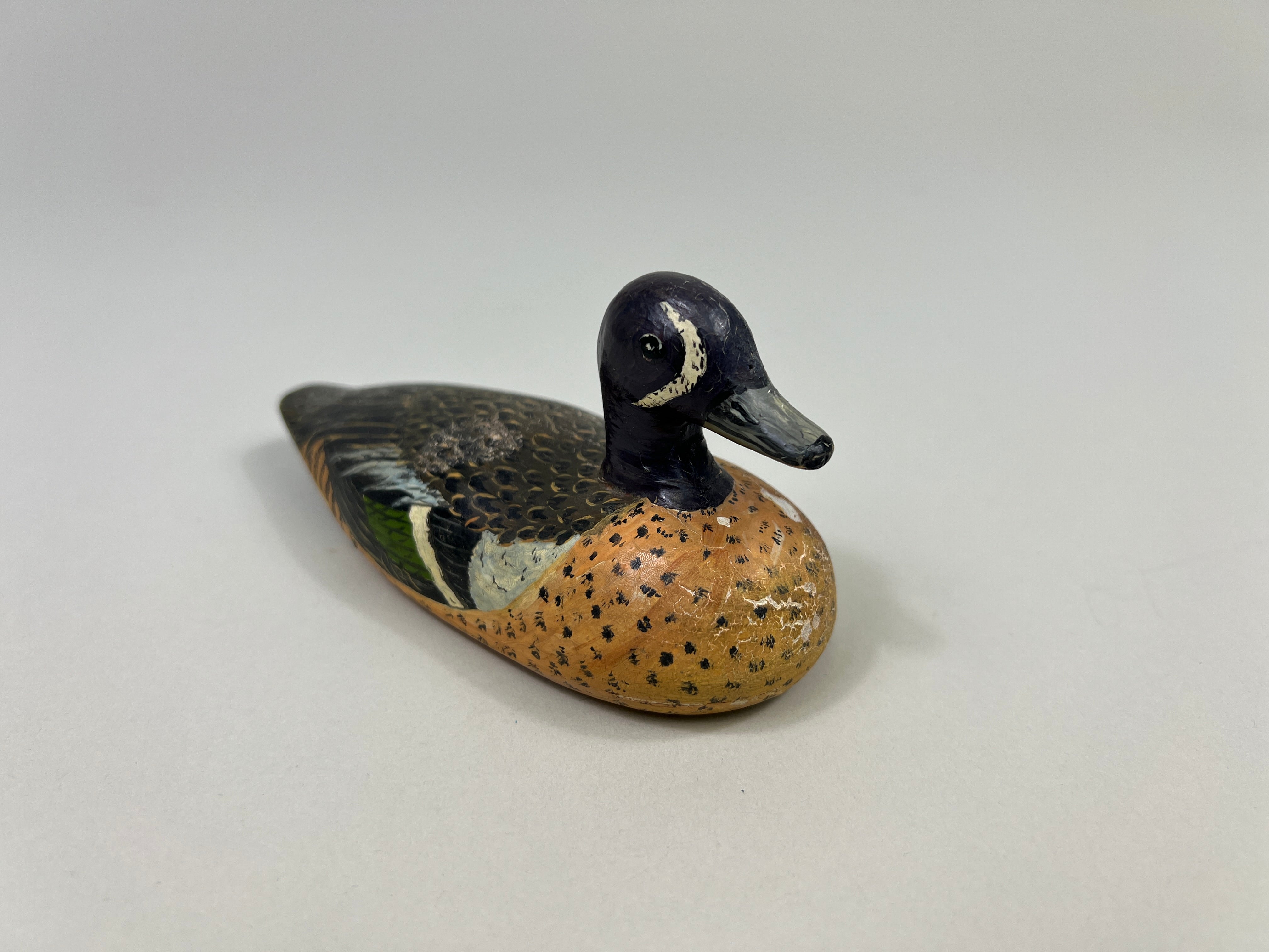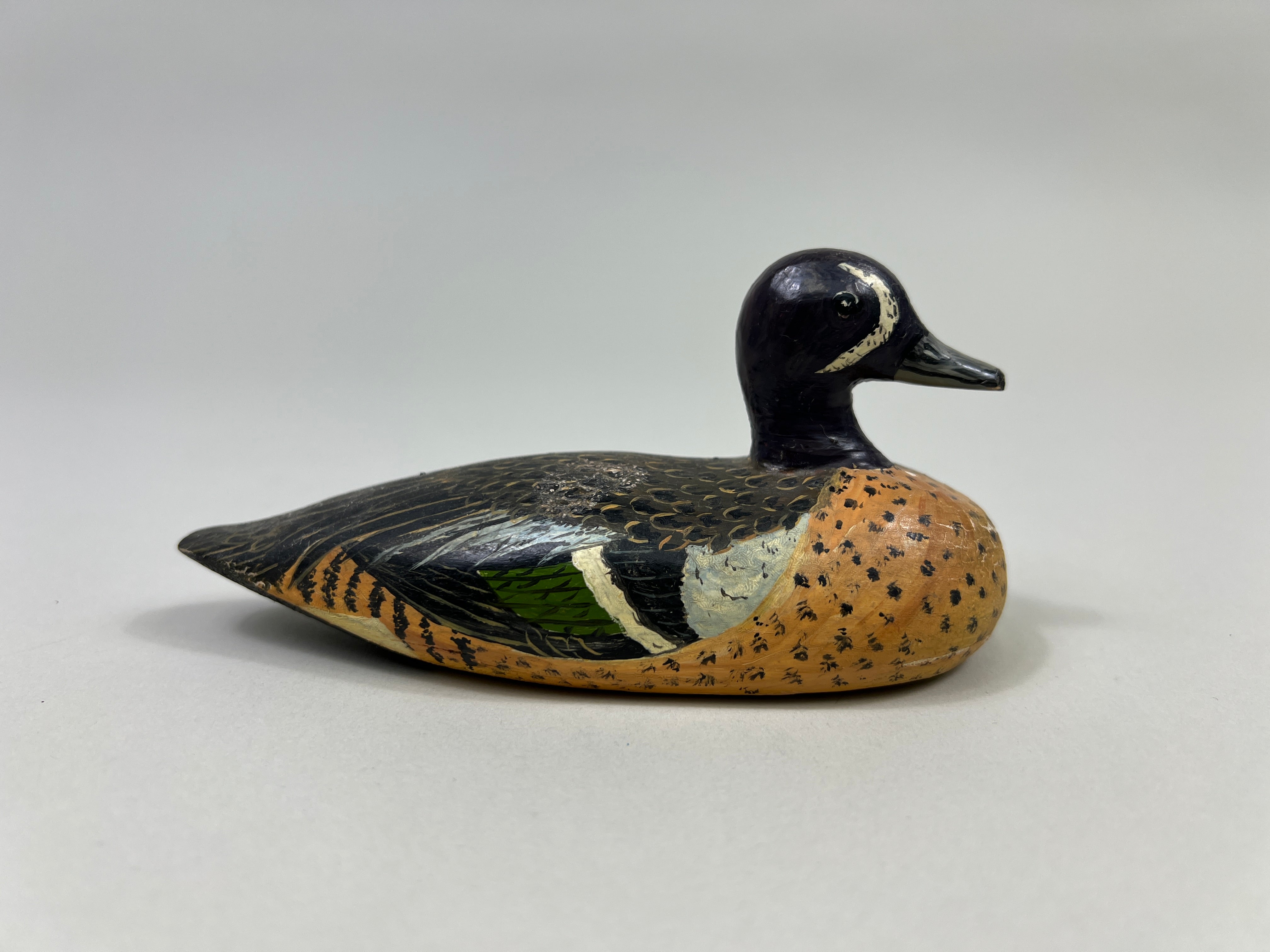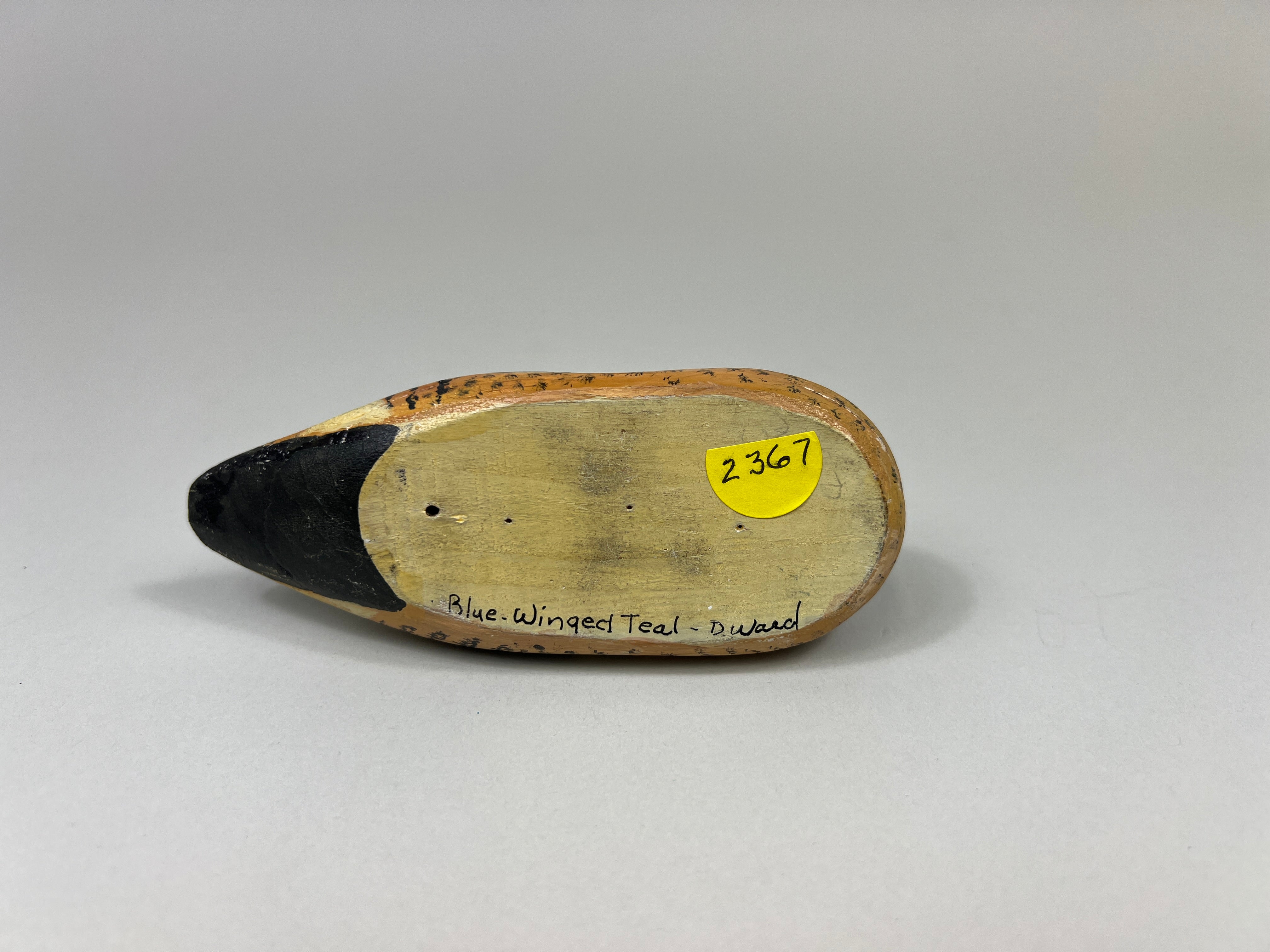 Third Size Blue Wing Teal by D. Ward. Painted eyes, detailed original paint with some crackling, very good condition, signed on bottom. Measures 5" long, 2" wide, 2-1/2" tall.