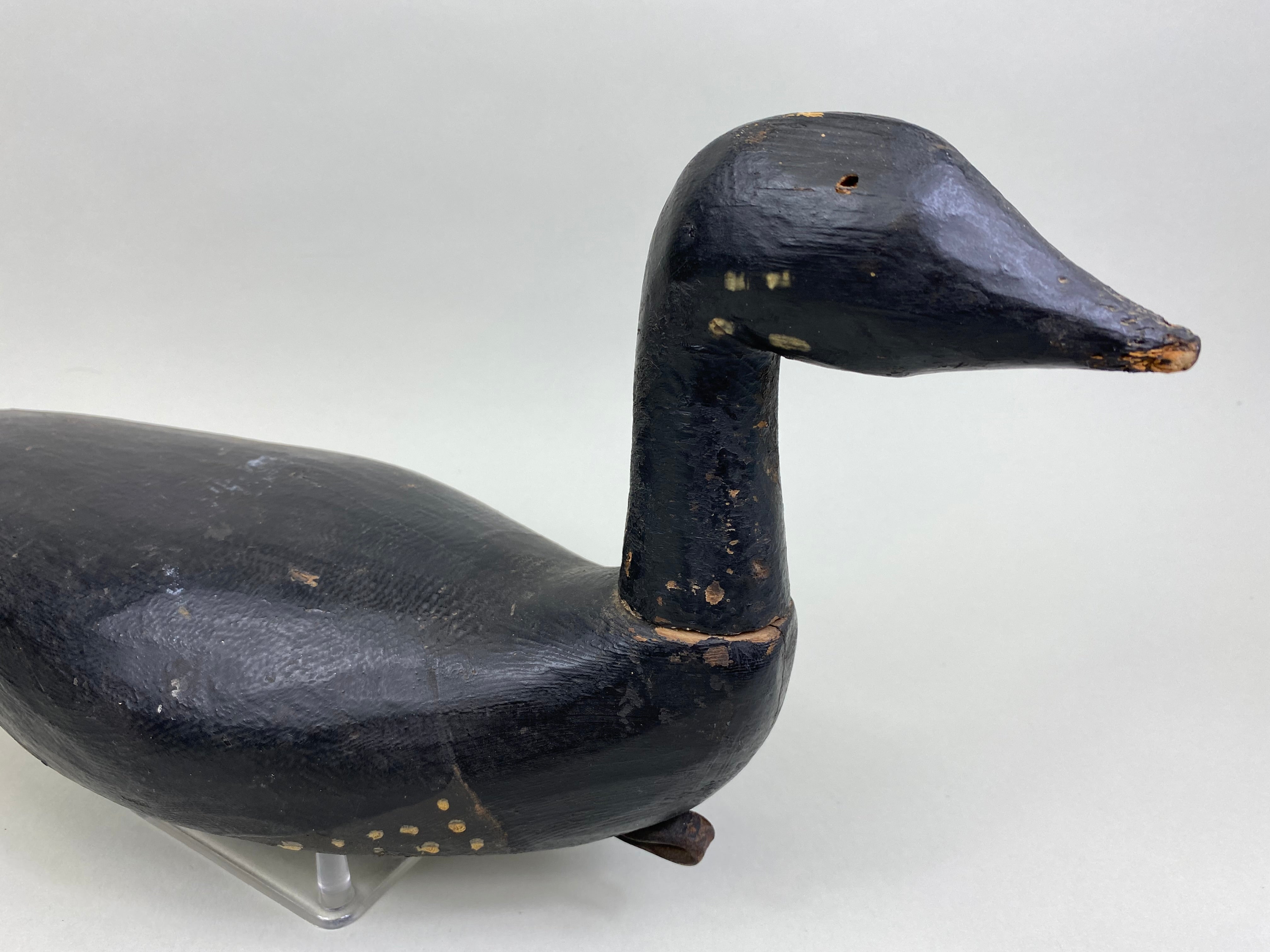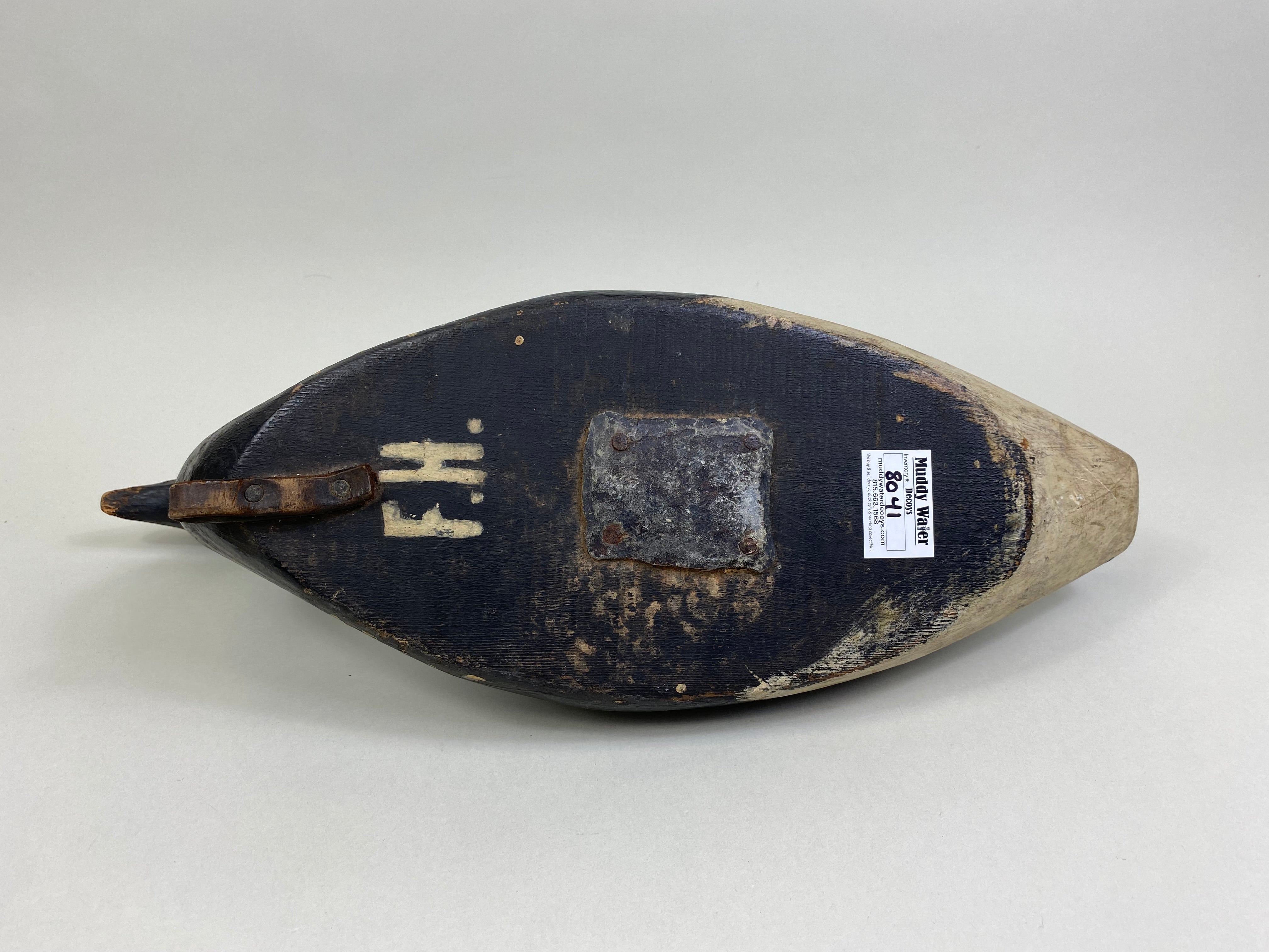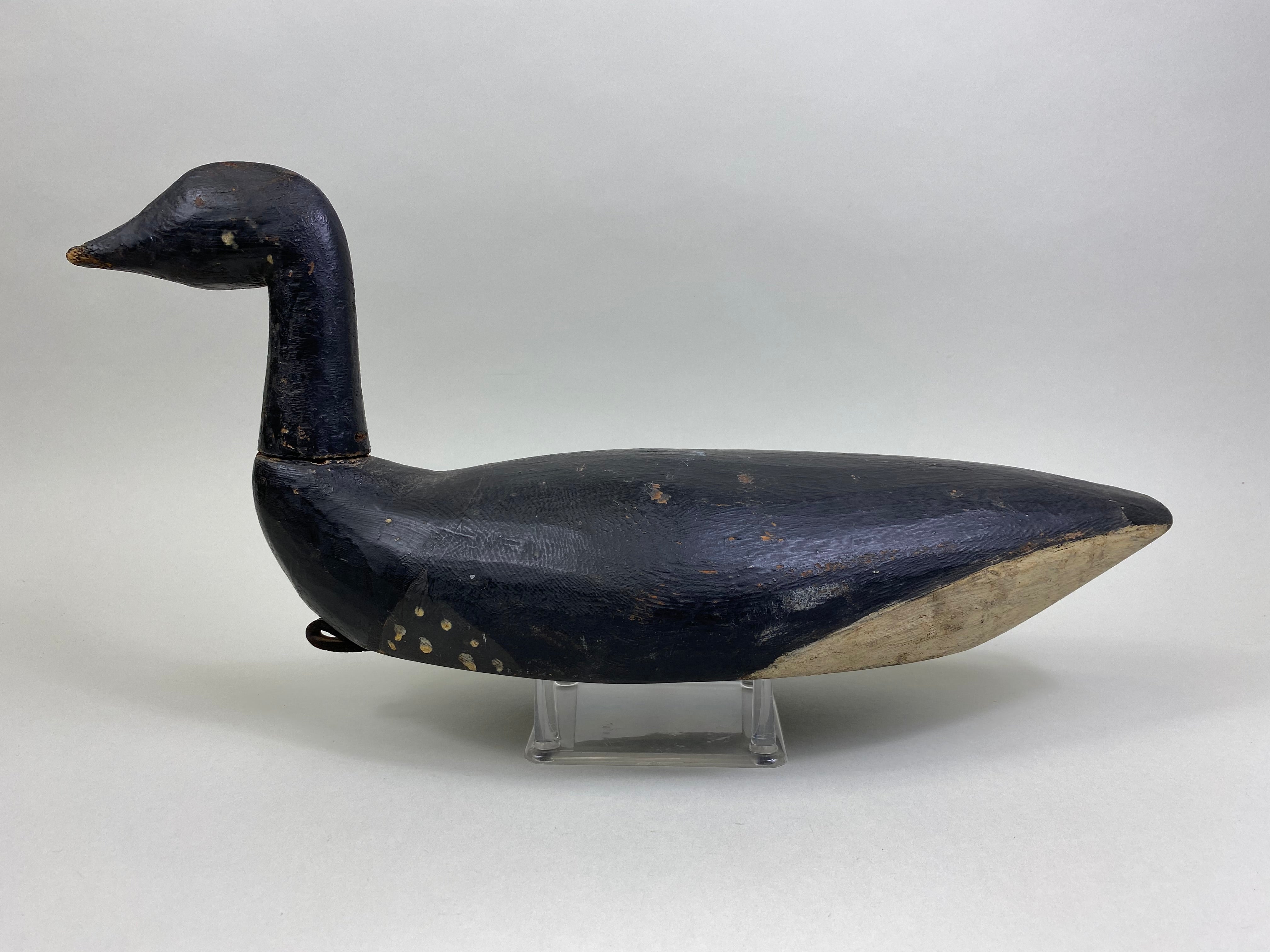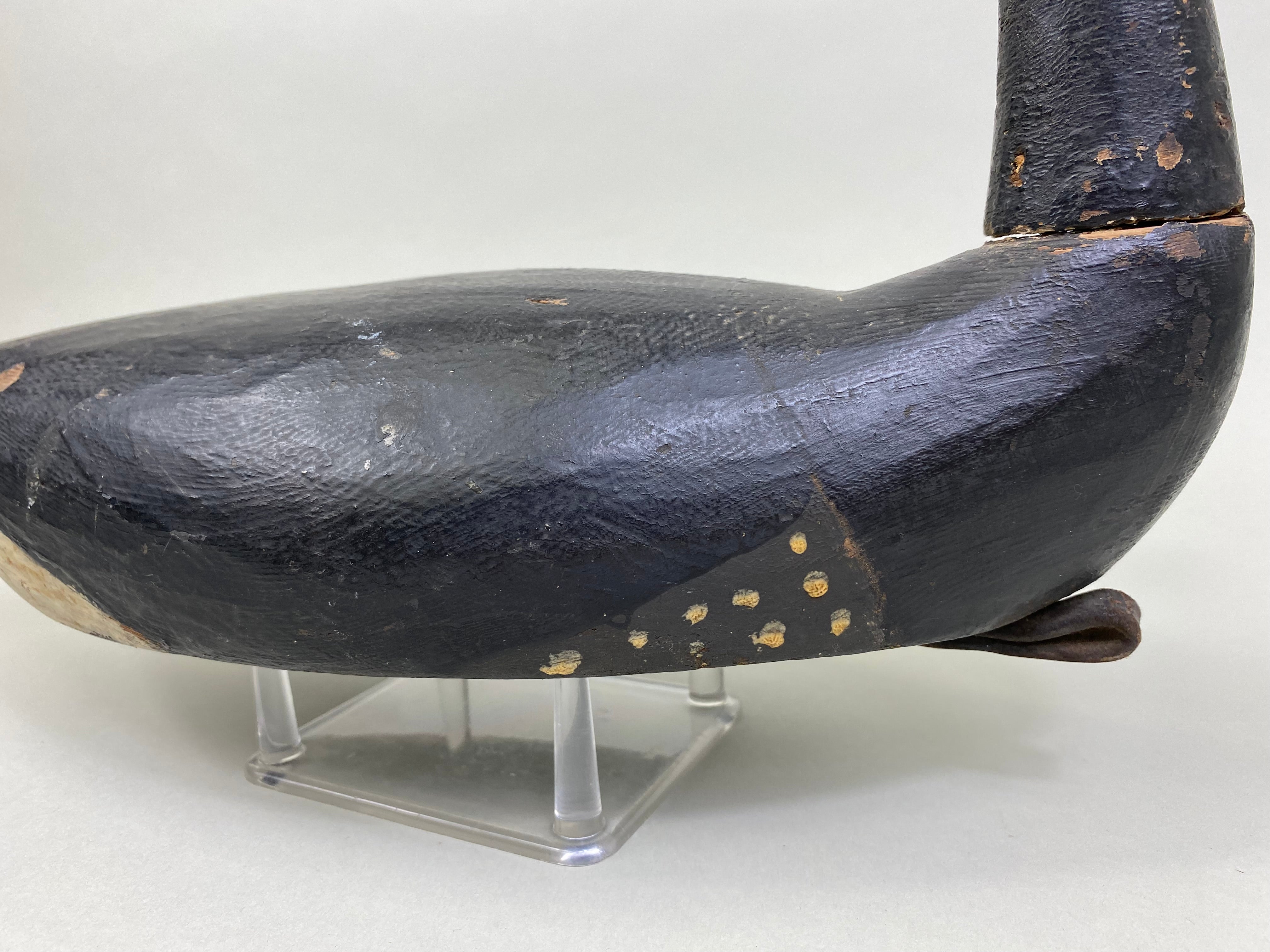 Early East Coast Brant by unknown carver. Solid body, "F.H.", leather rigging strap, and lead weight on bottom. Mostly original paint with some hunting wear and puppy chews on end...