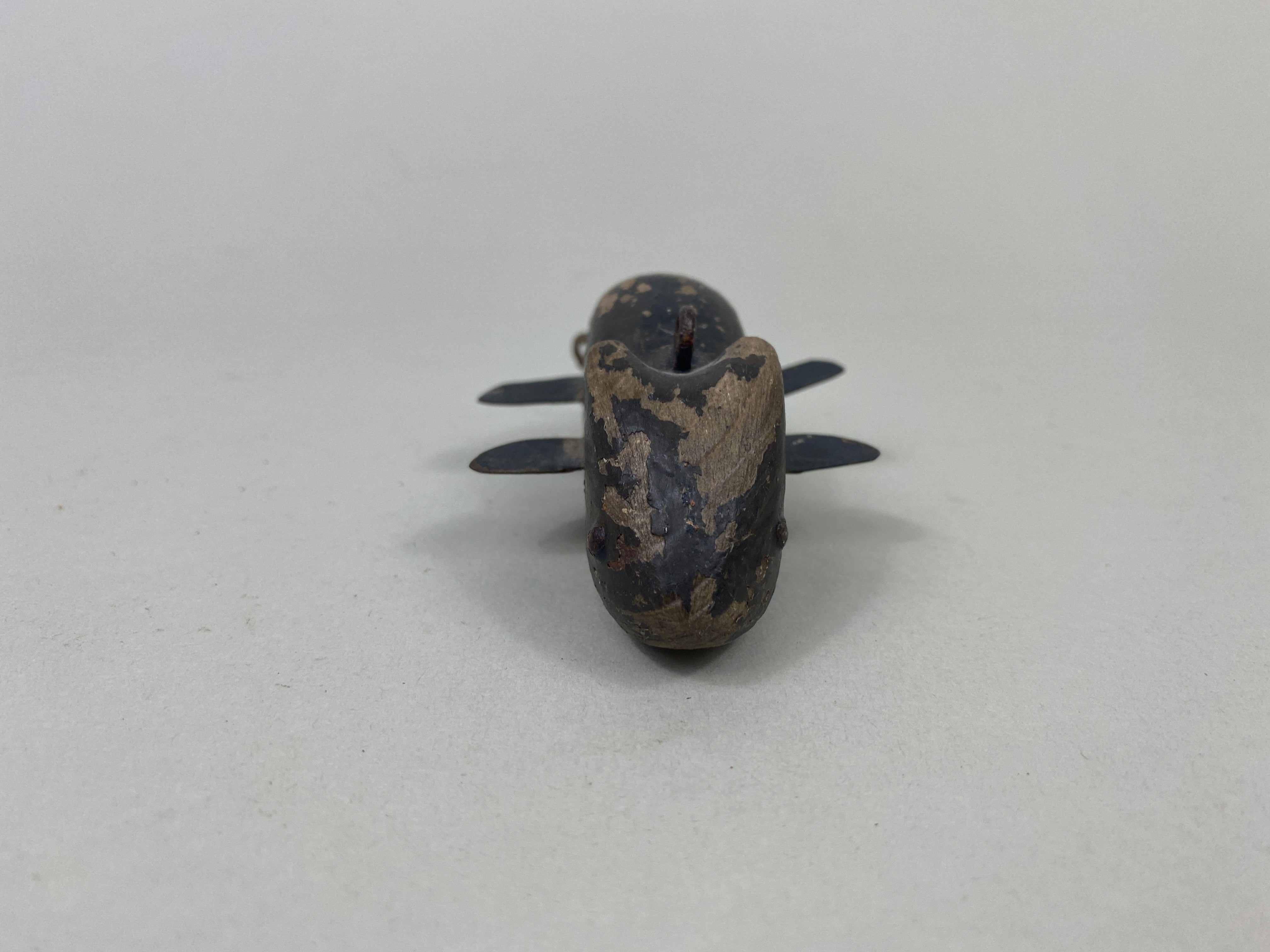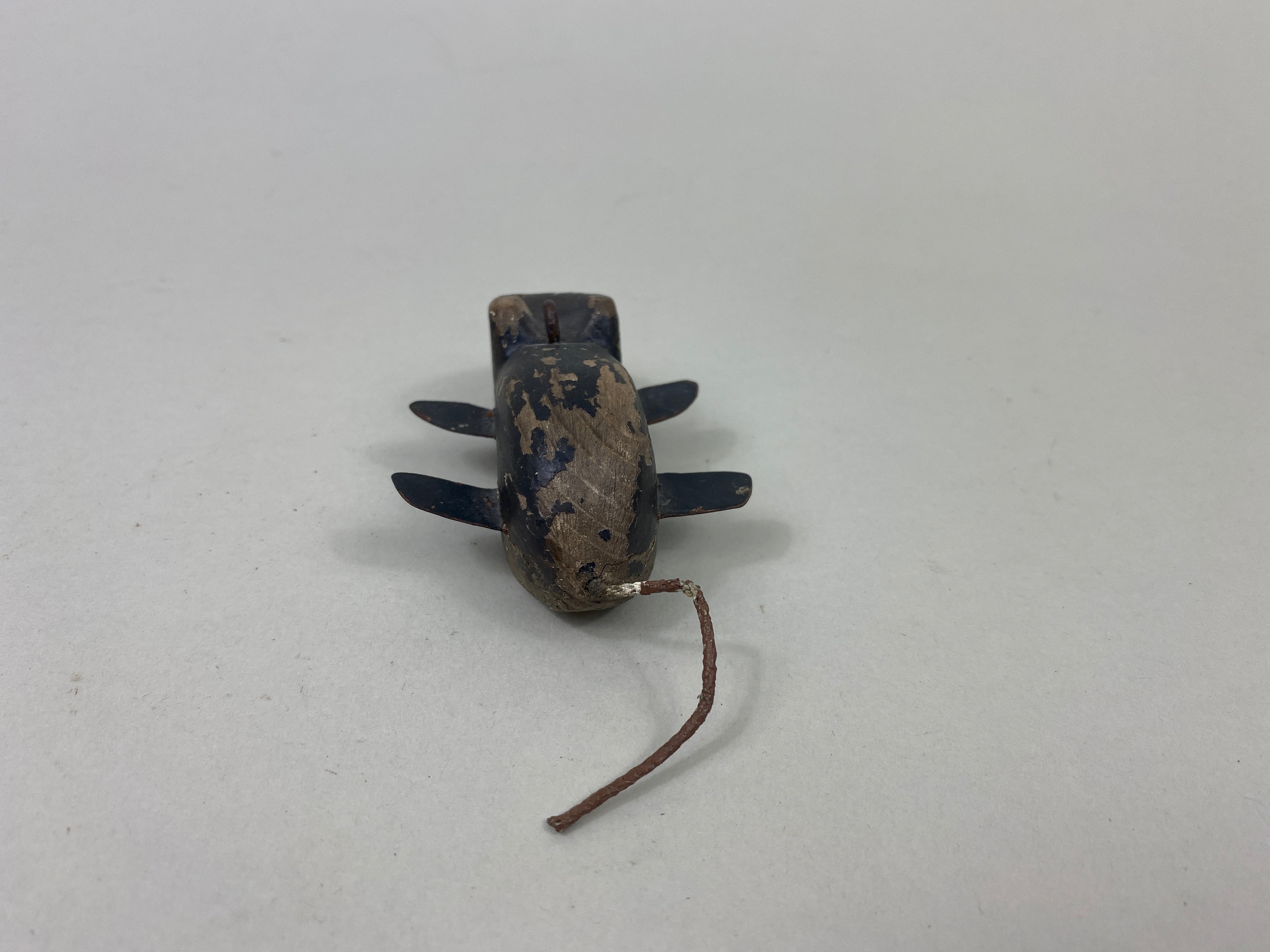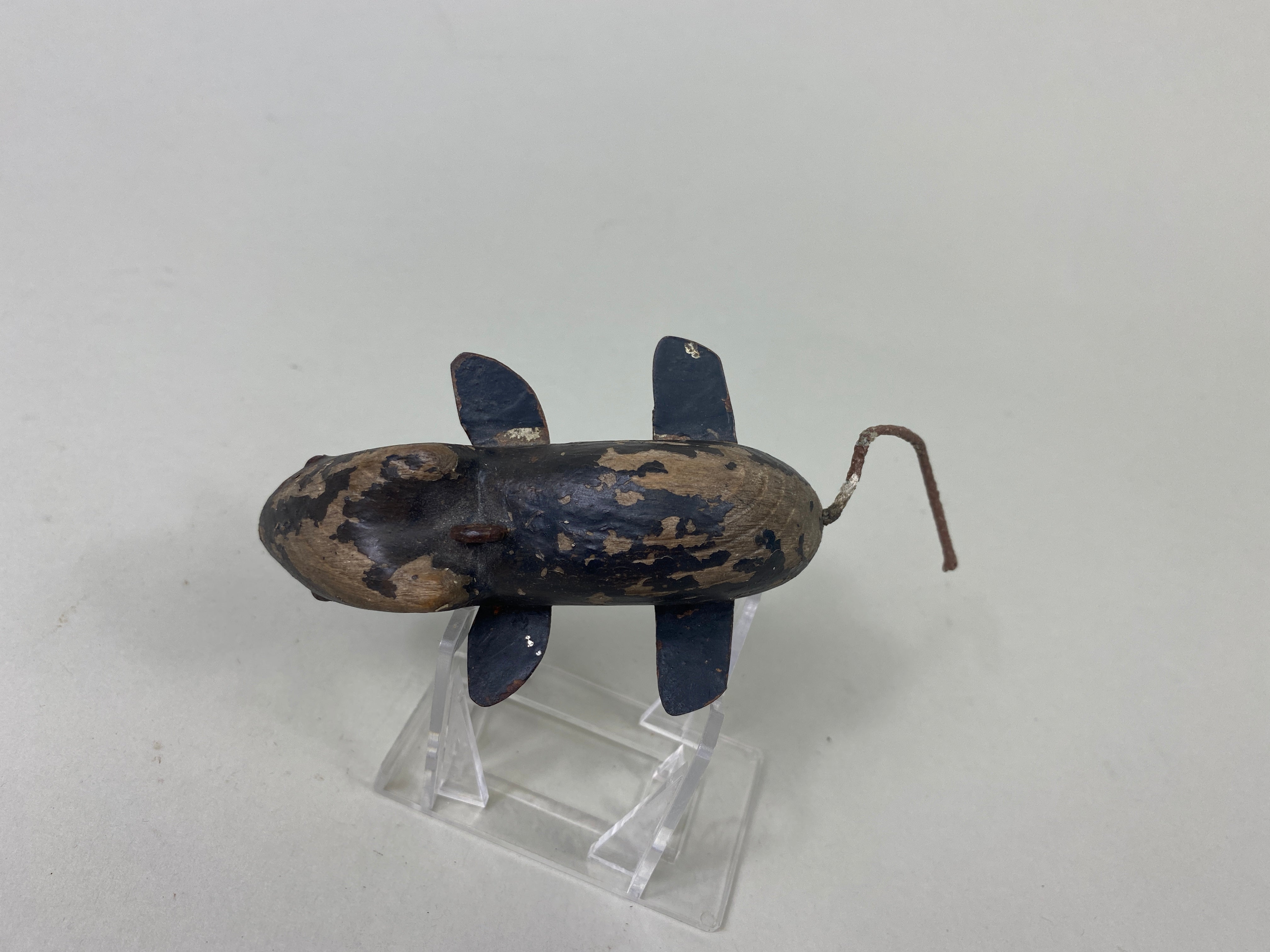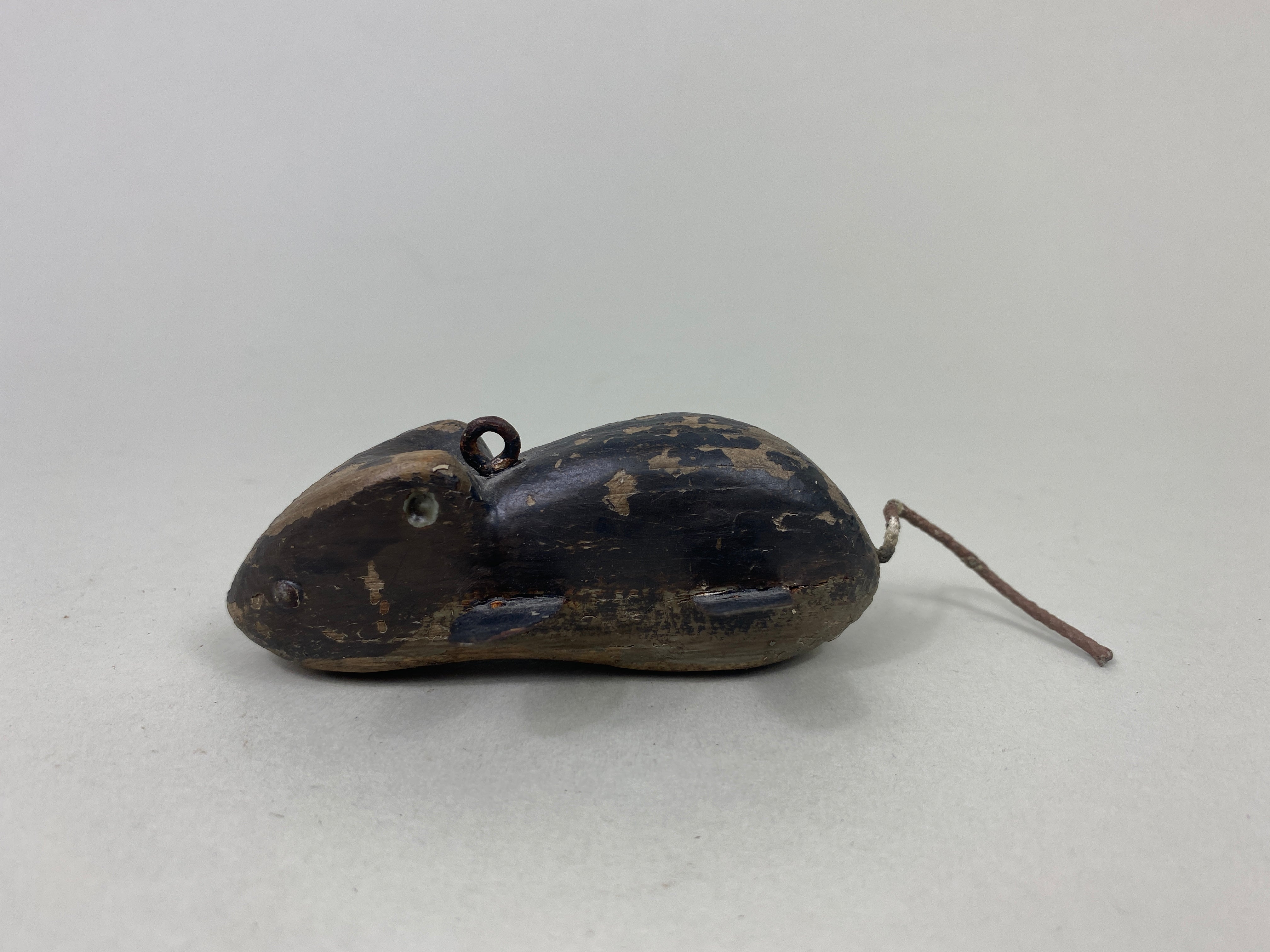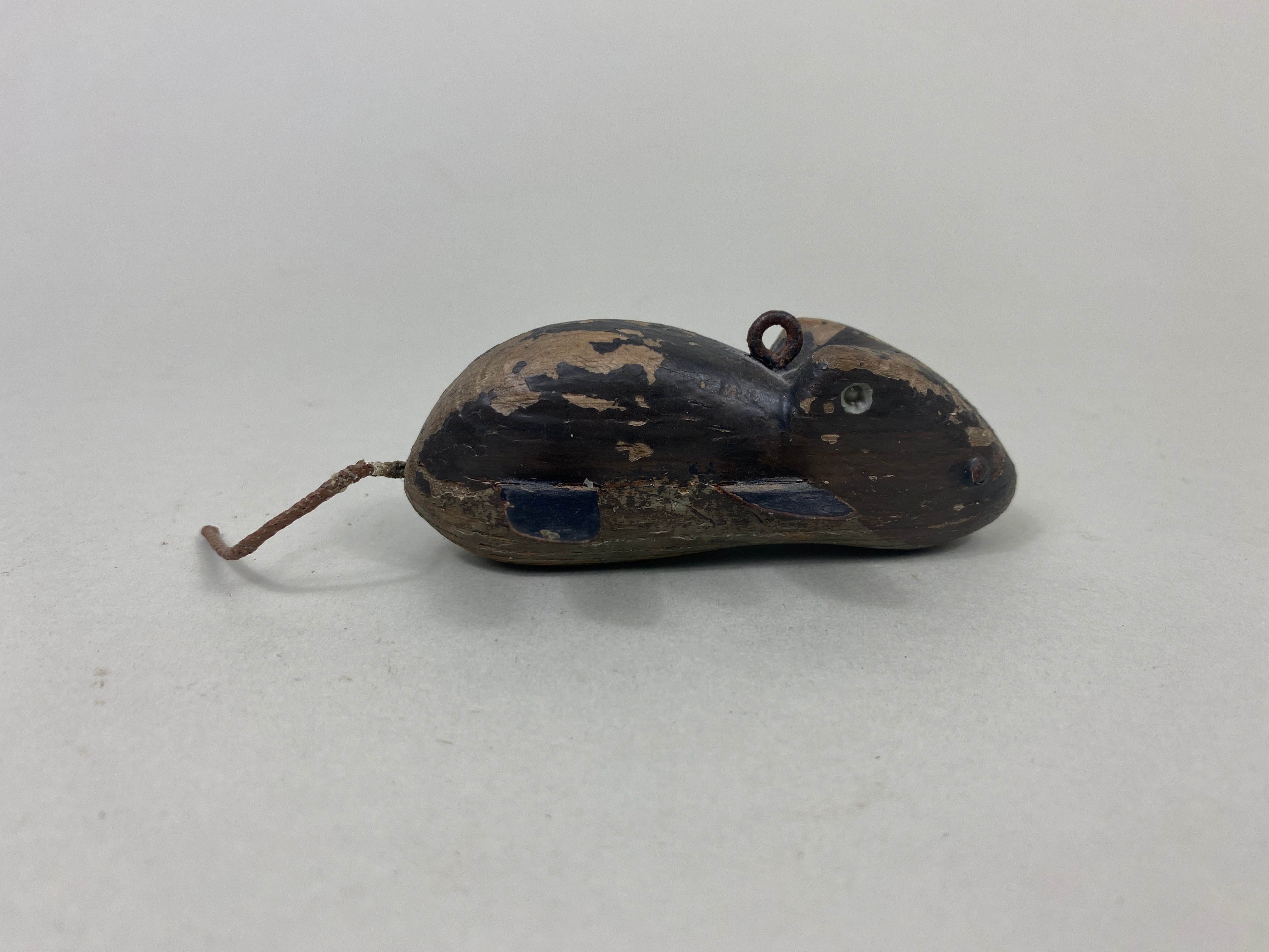 Mouse spearing decoy, unknown maker, all original. Inletted lead weights, cloth tail, metal feet, wear and paint flaking from use. Body of mouse measures 3-1/2" long, 2" wide, and 1"...