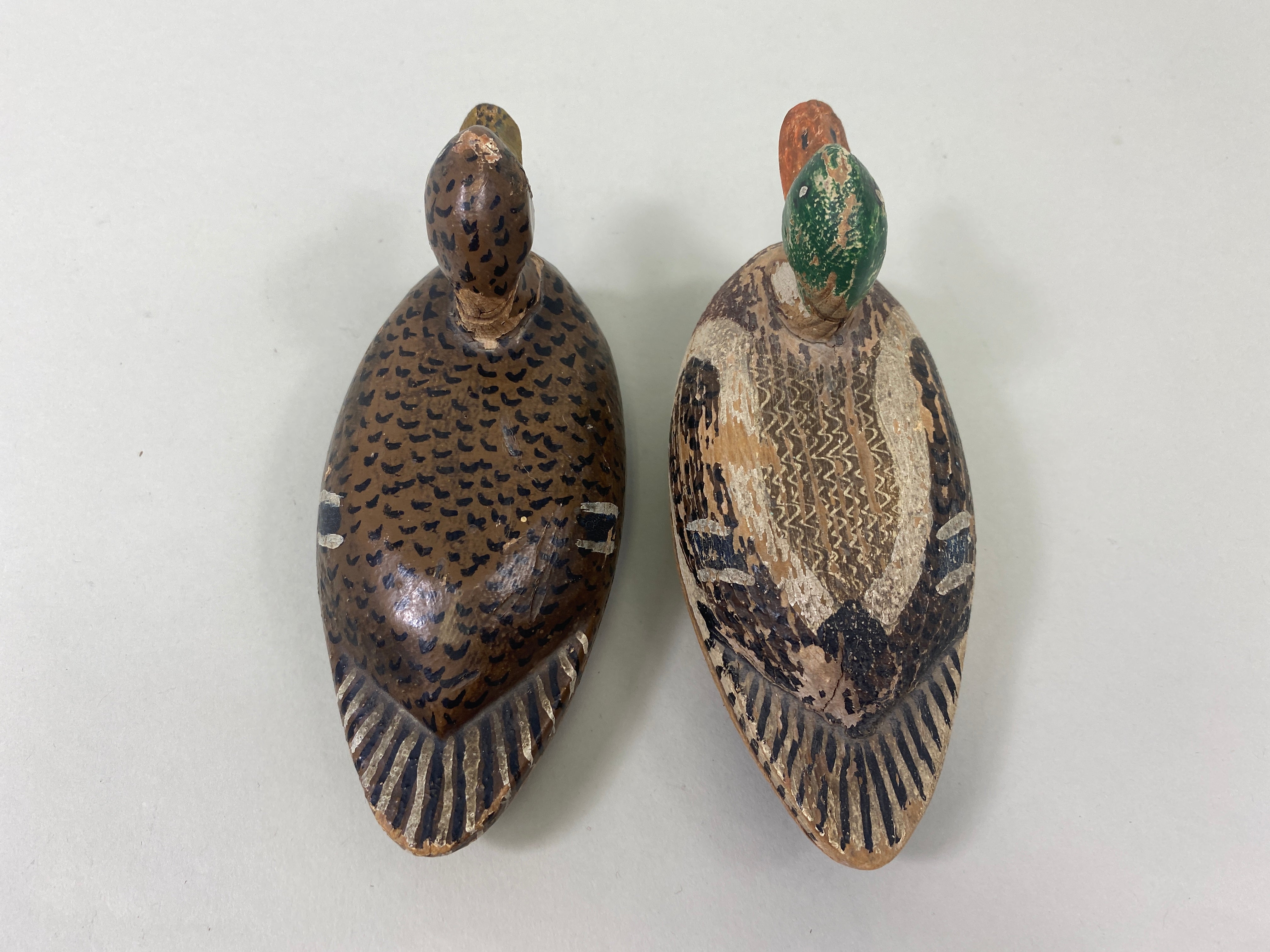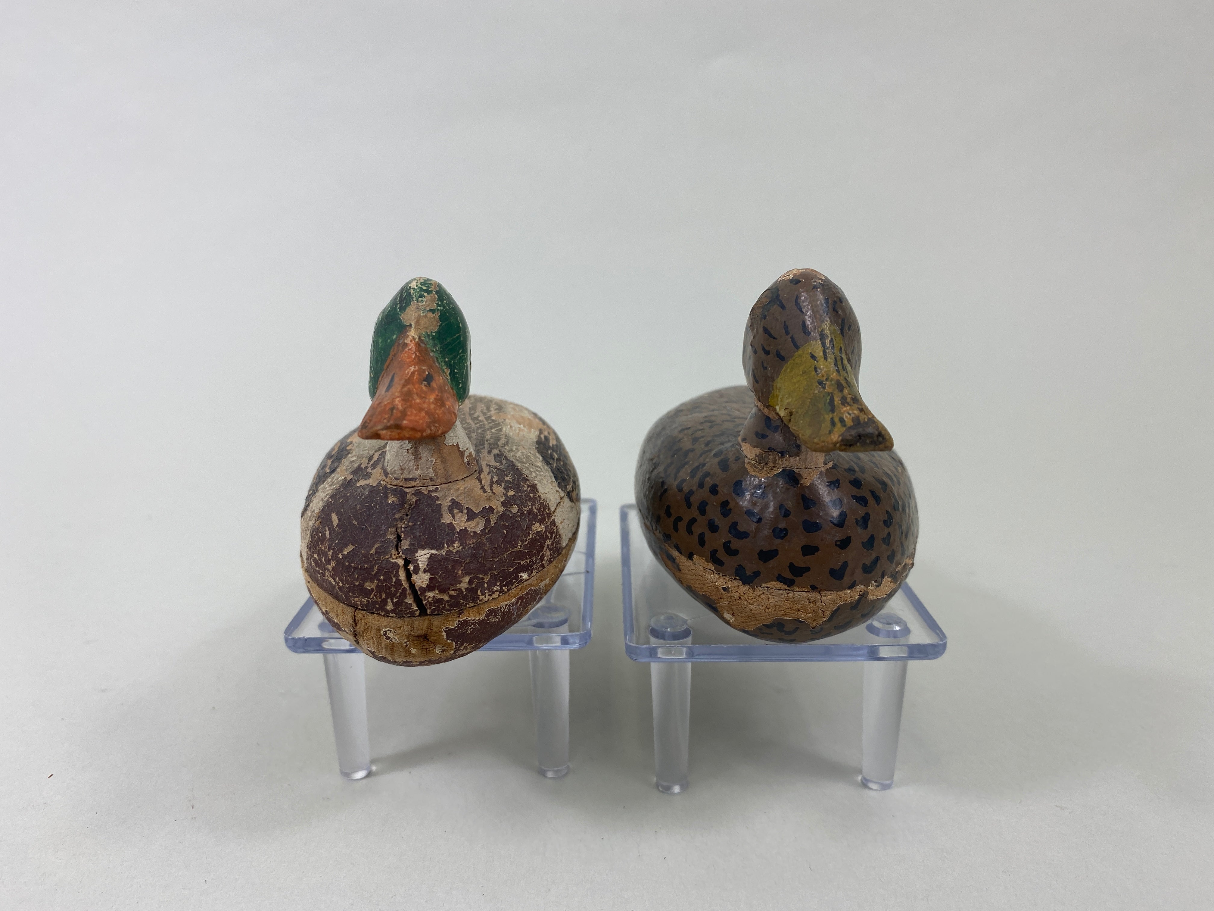 Pair of Miniature William Eveland Mallards, Pekin, Illinois. Painted eyes, original paint, age and neck cracks and wear including paint flaking, bill repair on drake. Each measure approximately 5-1/2" long,...