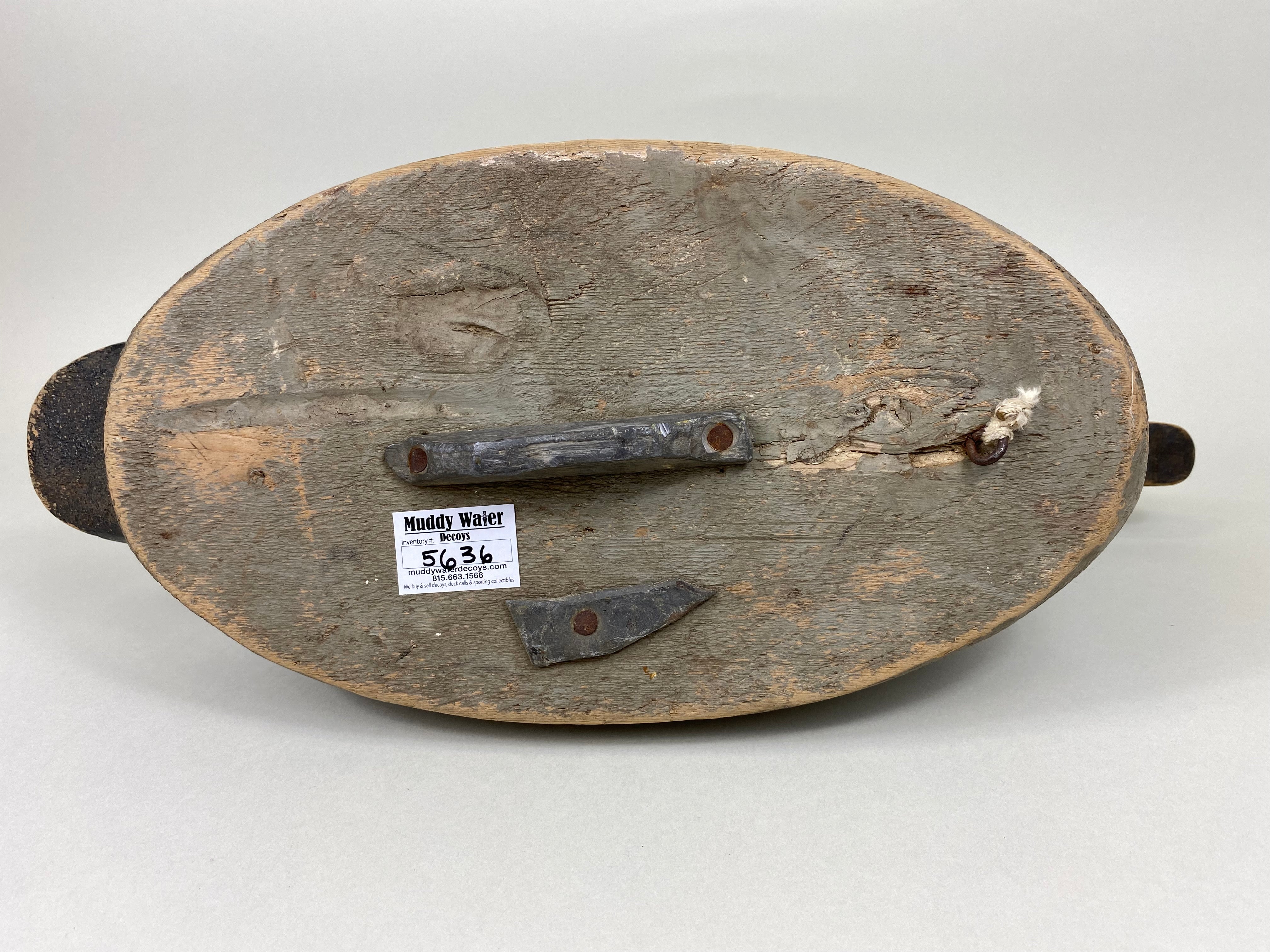 Early East Coast Brant by unknown carver. Solid body, "F.H.", leather rigging strap, and lead weight on bottom. Mostly original paint with some hunting wear and puppy chews on end...
