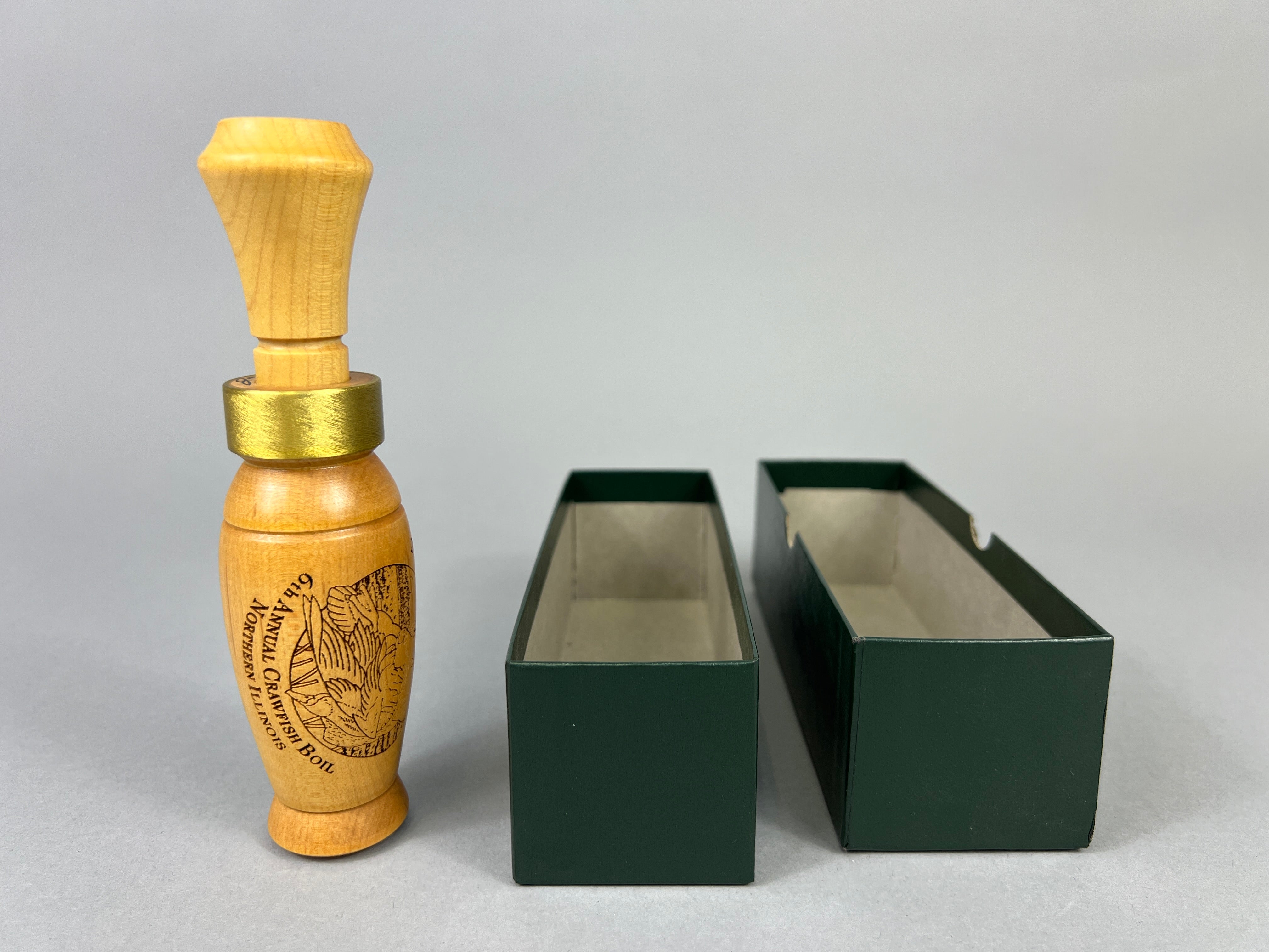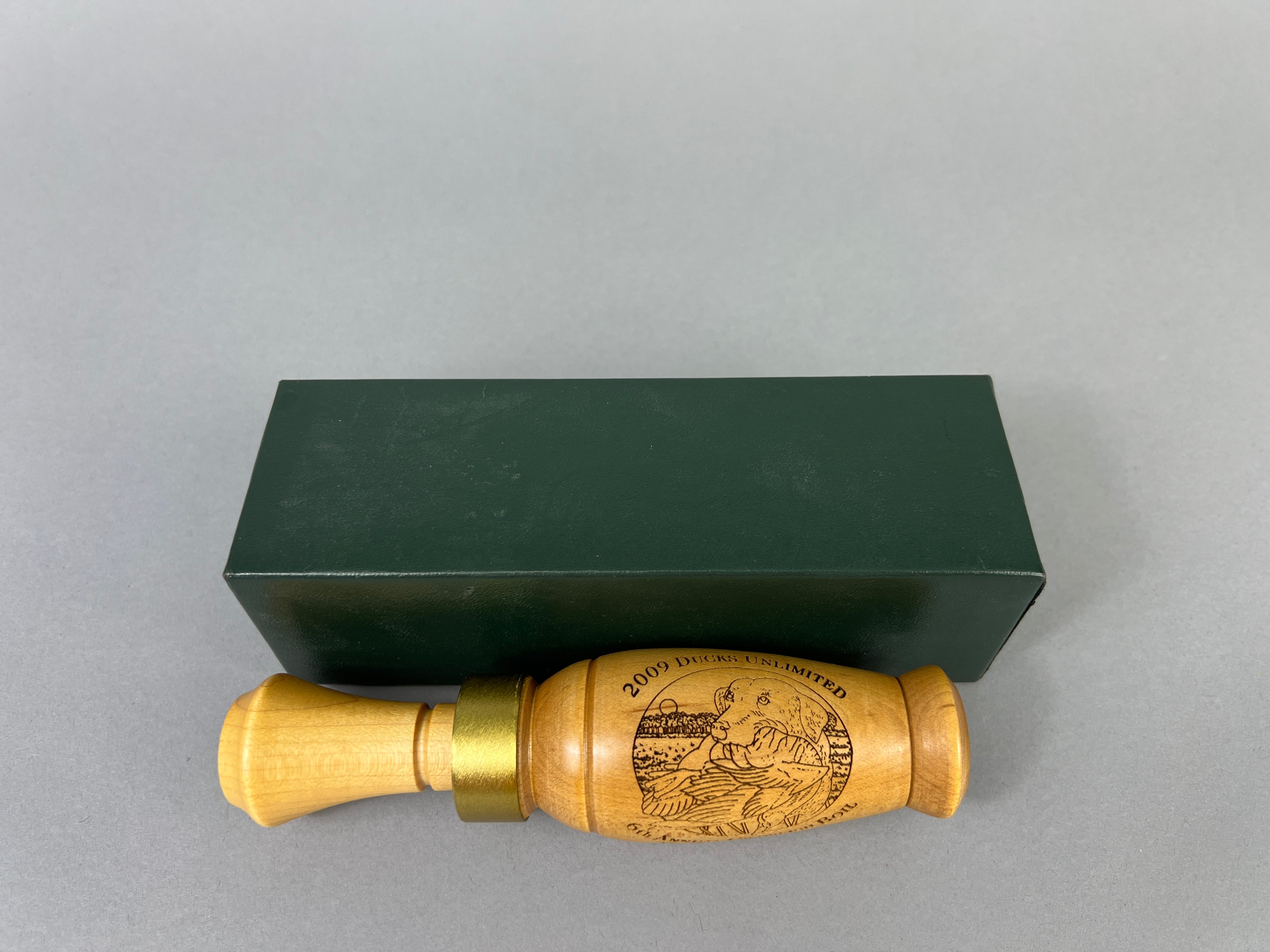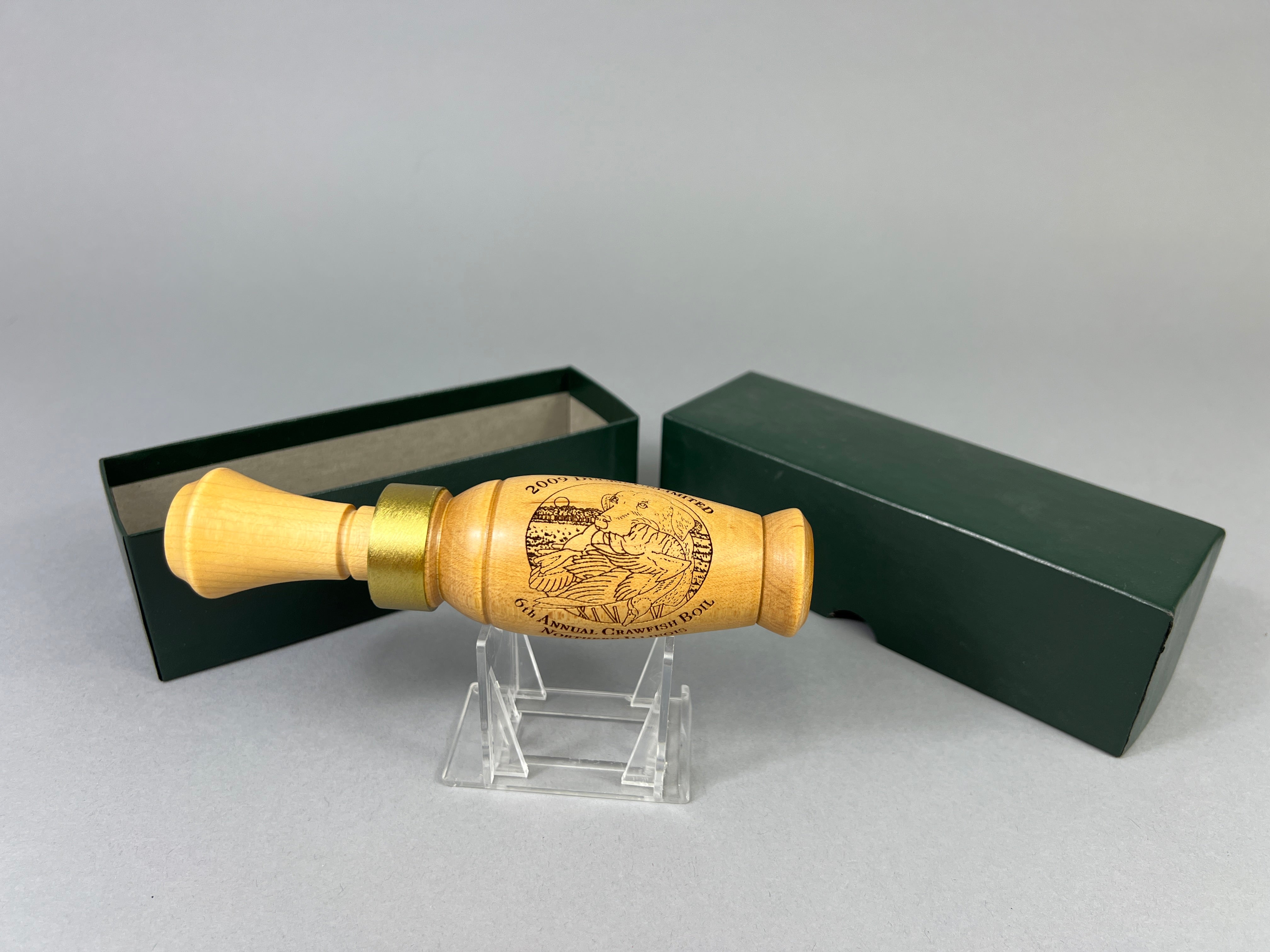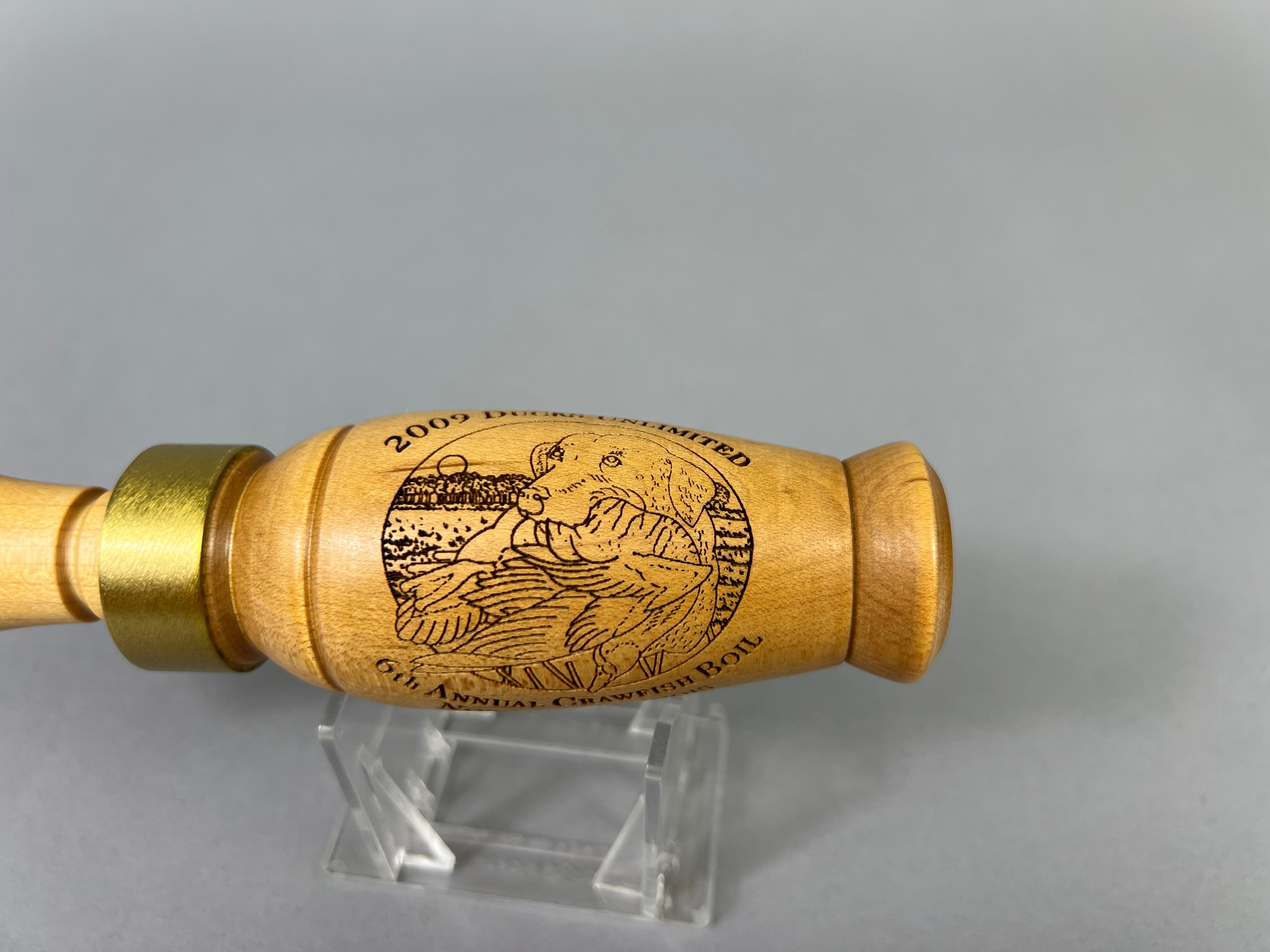 2009 Ducks Unlimited Duck Call. 6th Annual Crawfish Boil Northern Illinois. Like new condition, very nice detail carving, Signed Jim Bucher on top of barrel, and brass brand. Box included.