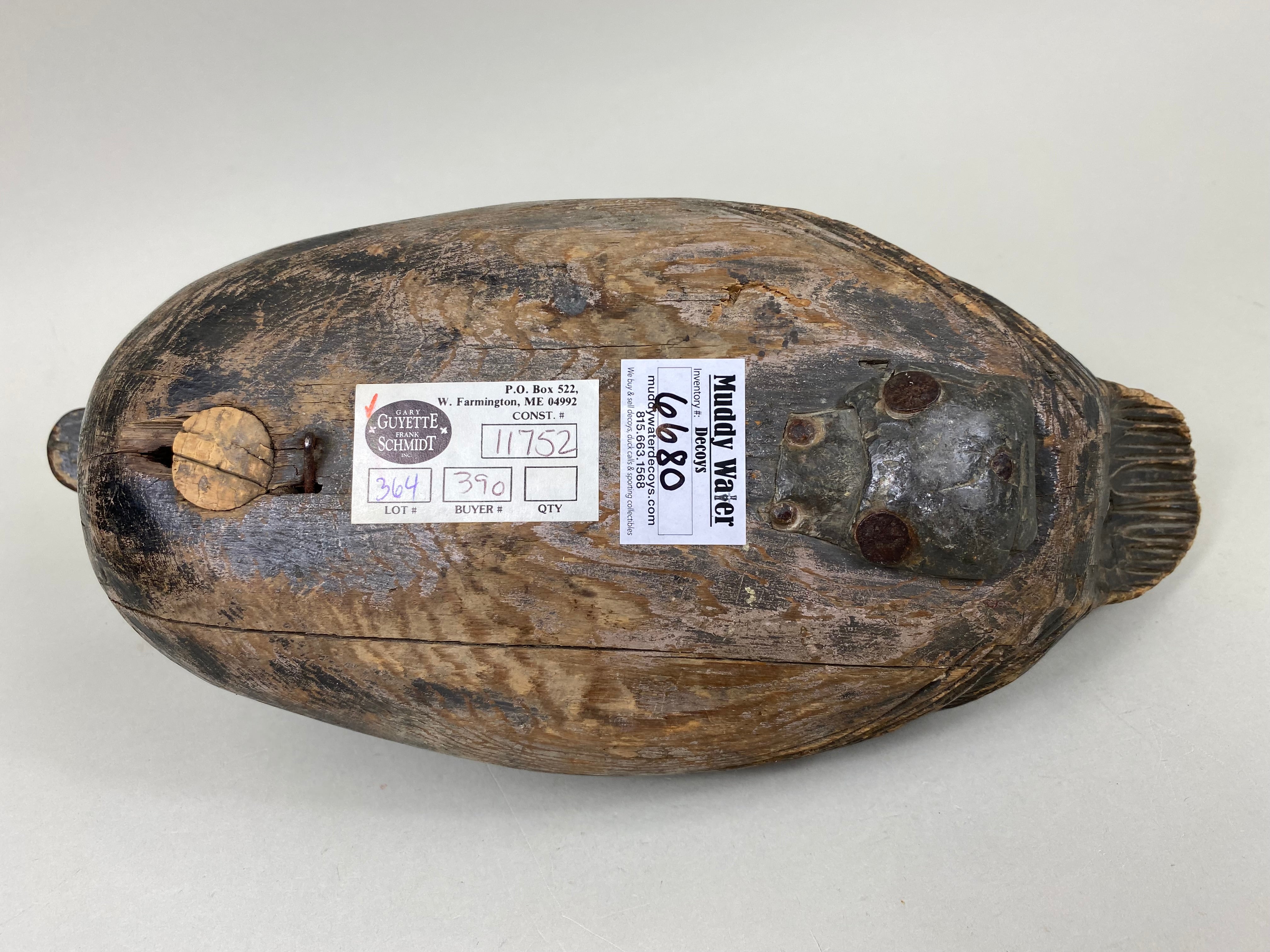 Early East Coast Brant by unknown carver. Solid body, "F.H.", leather rigging strap, and lead weight on bottom. Mostly original paint with some hunting wear and puppy chews on end...