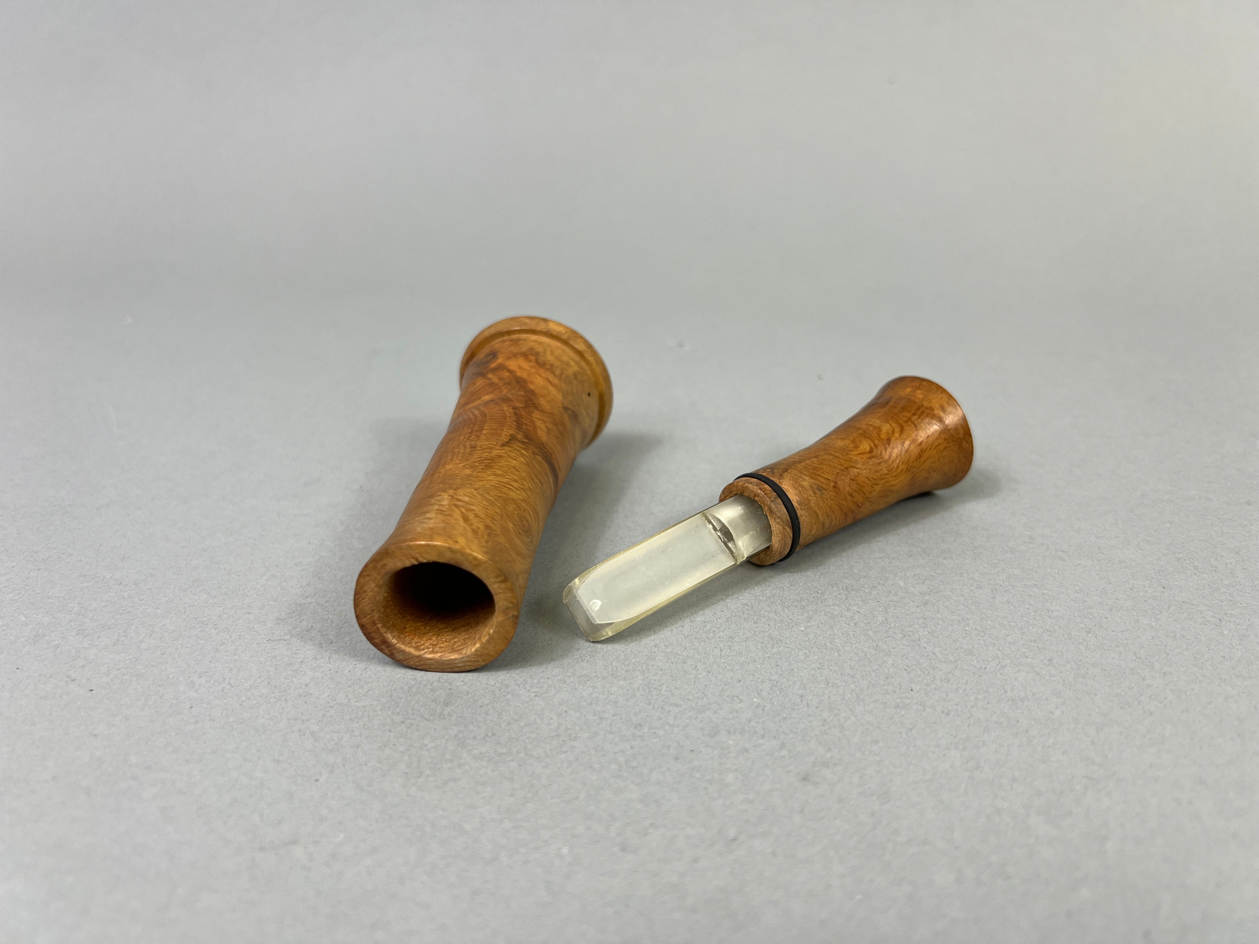 Louisiana Kelso Wooden Duck Call. Double plastic reed, "KELSO 10.21.2001" stamped on top of barrel. Call works and is in good condition, measures 5-1/2" long.