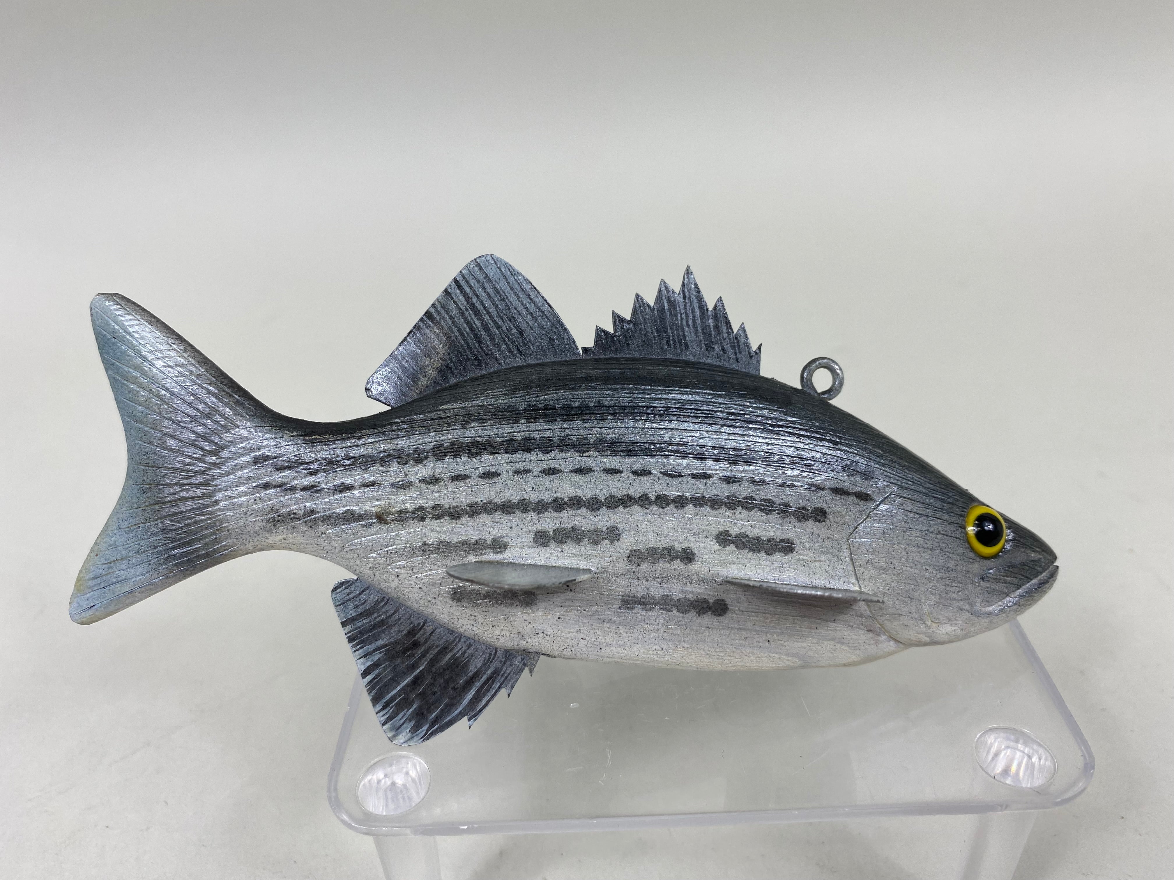 White Bass fish spearing decoy by Marcel Meloche, Cochrane, Ontario. Glass eyes, metal fins, detailed carved wooden tail and gills, inletted lead weights on bottom as well as "MEM". Is in...