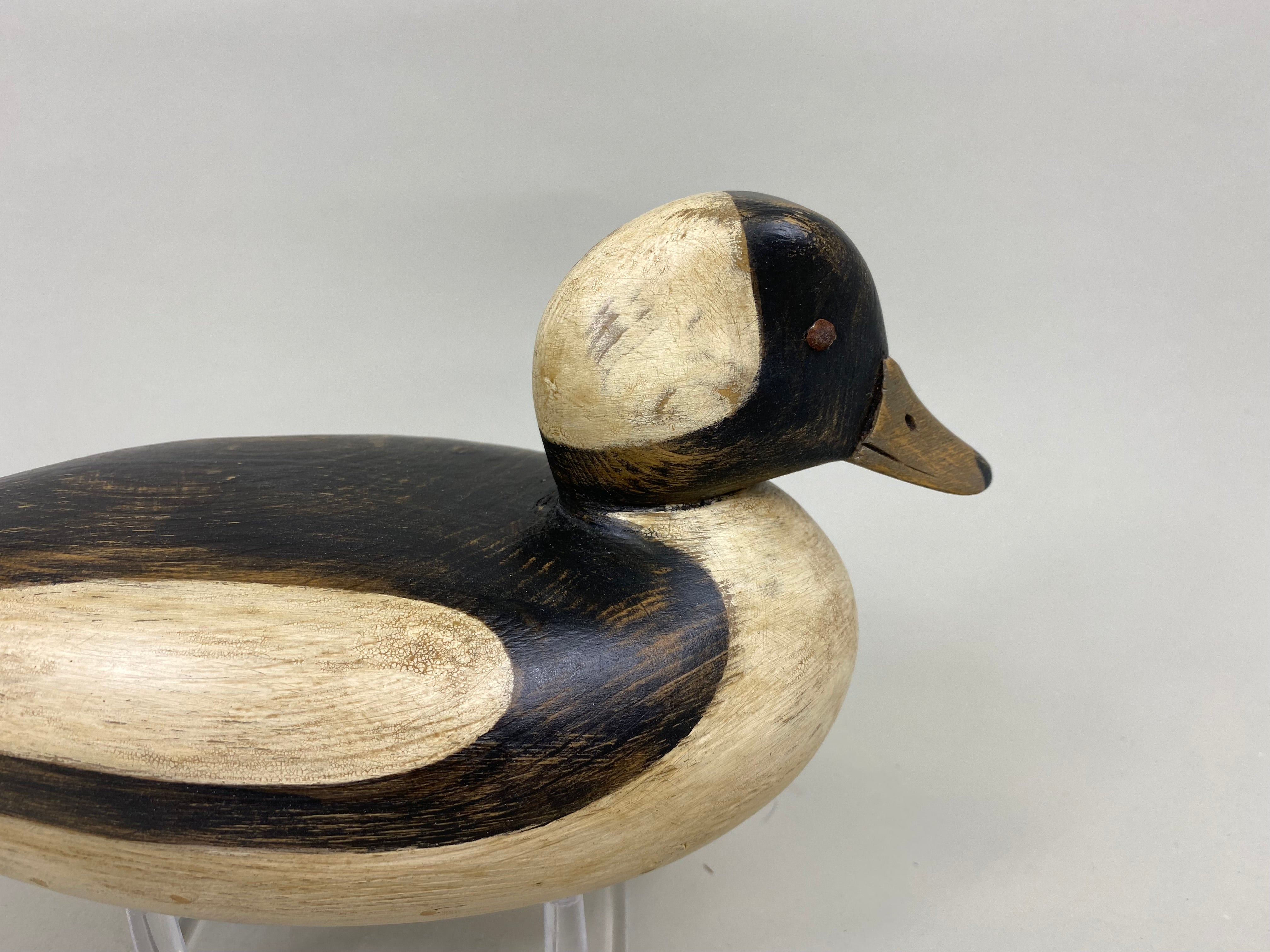 Evans Factory Bluebill Hen, Ladysmith, Wisconsin. Glass eyes, solid body, original paint, factory stamp, paw print. and #27 on bottom, has BB marks and hunting wear, chip of wood missing...