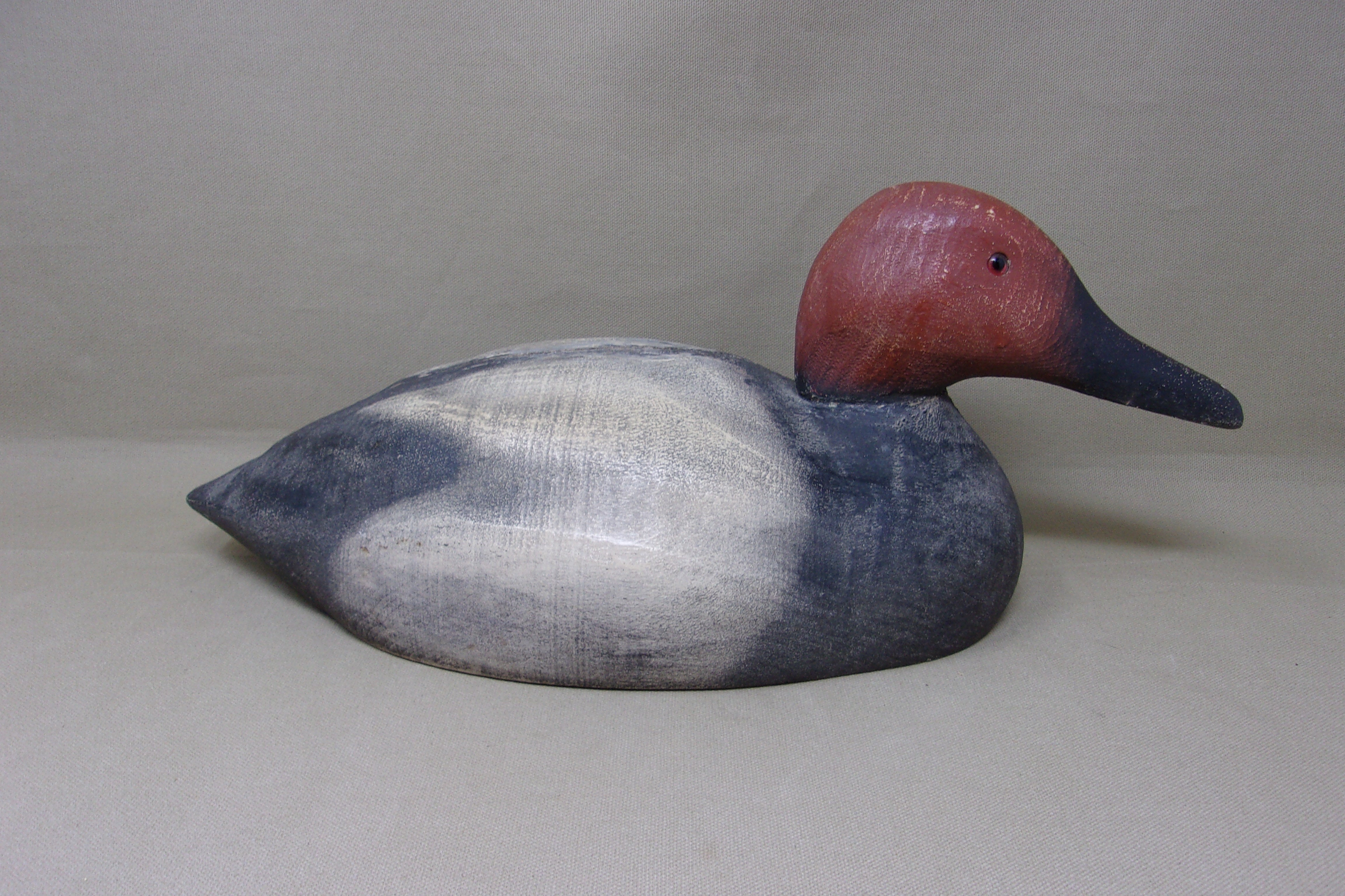 Herters 1893 Series Canvasback, Waseca Minnesota.  Glass eyes, solid body, 1893 Factory stamp, age cracks and hole in bottom that was filled in with wood putty. Measures 16" long, 6-1/2" tall, and 6-1/2" wide.