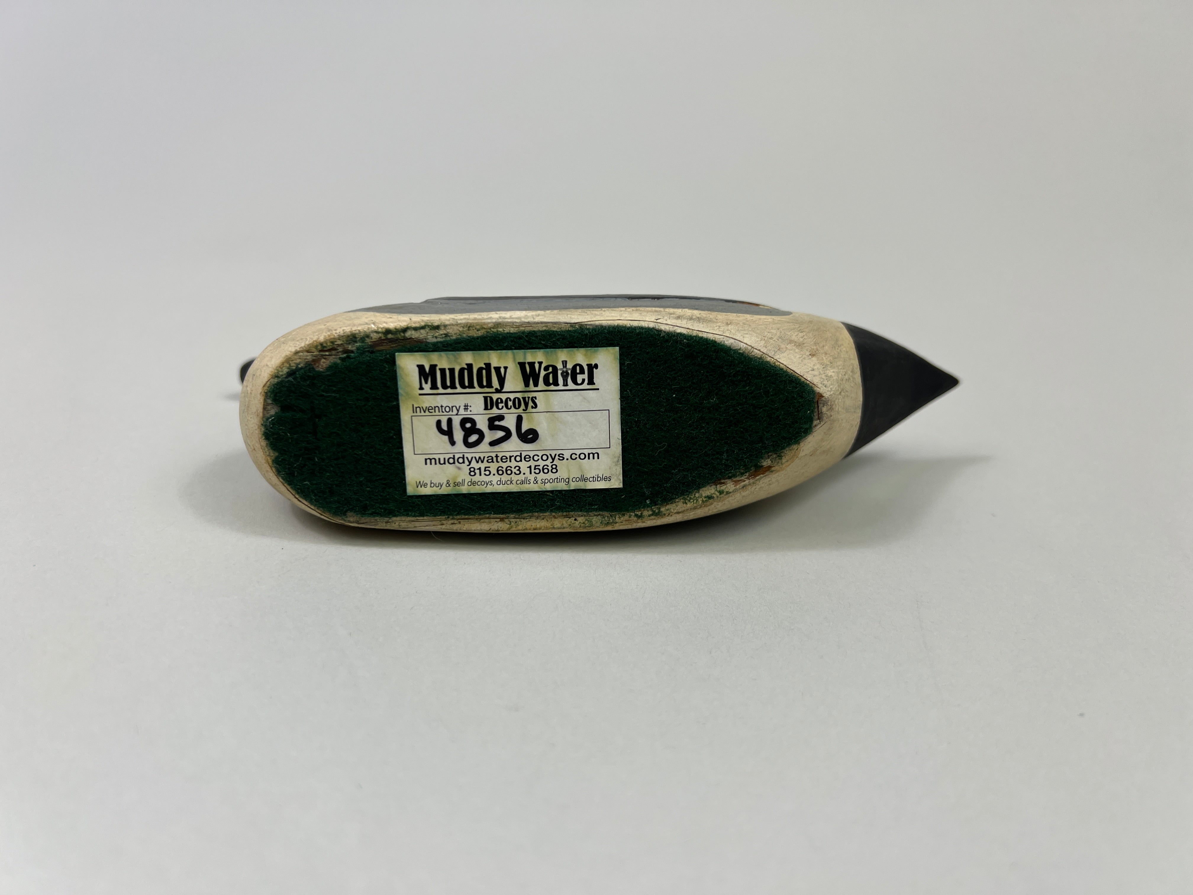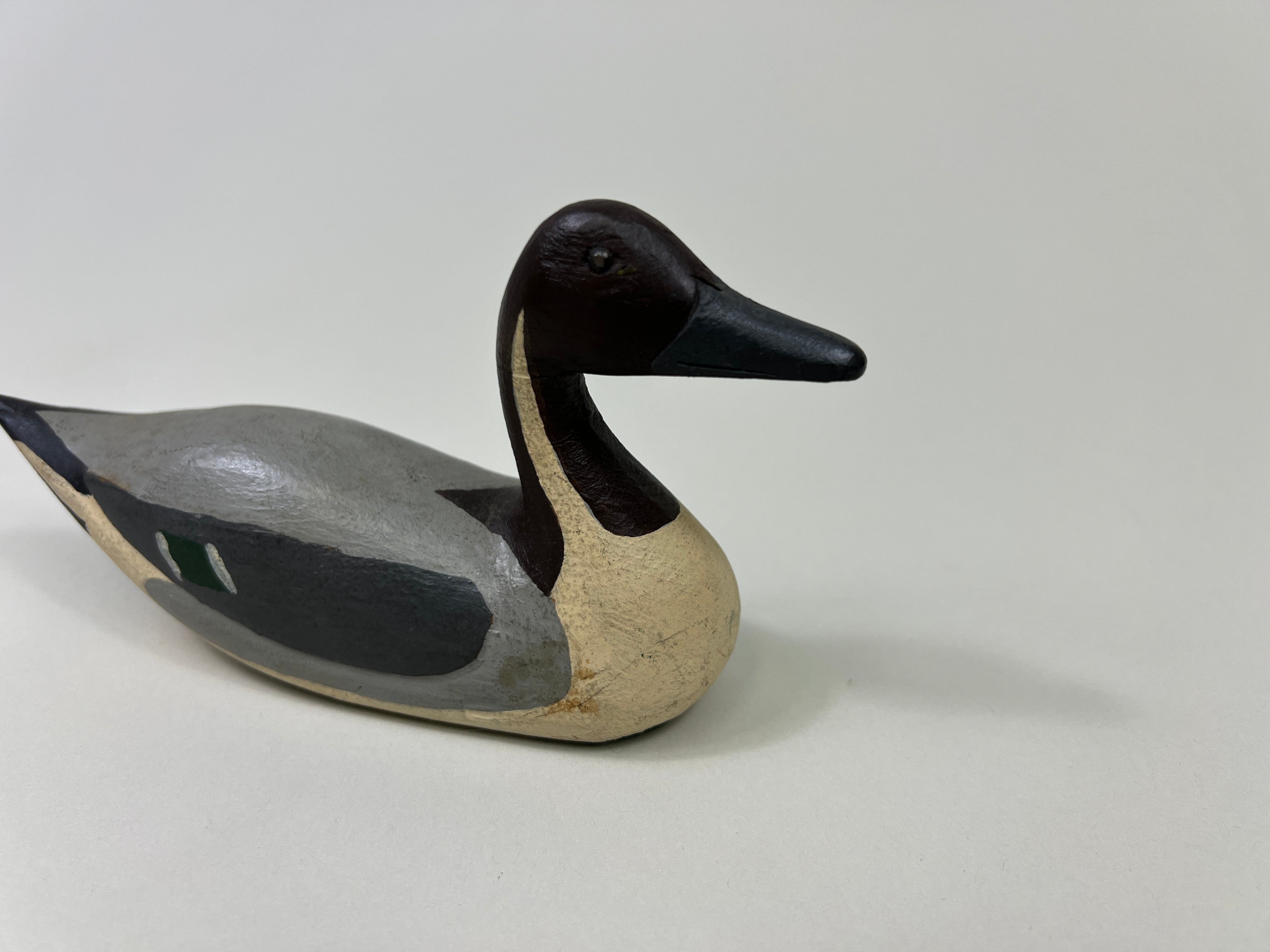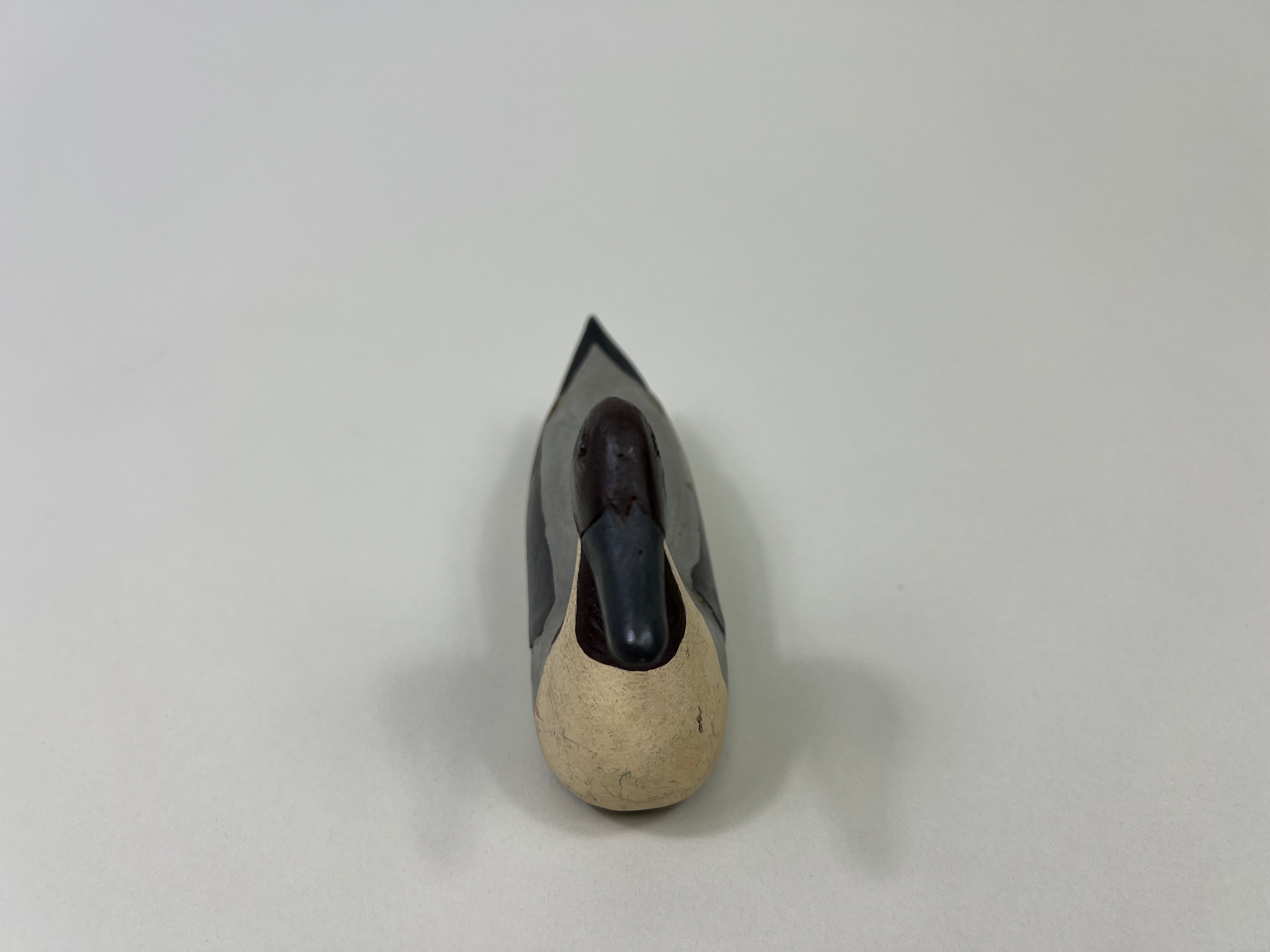 Unknown Mini Pintail Drake. Midwest region, circa 1940's-50's, glass eyes, solid body, original paint, nicely made. Measures 6-1/2" long, 1-1/2" wide, and 3-1/2" tall.