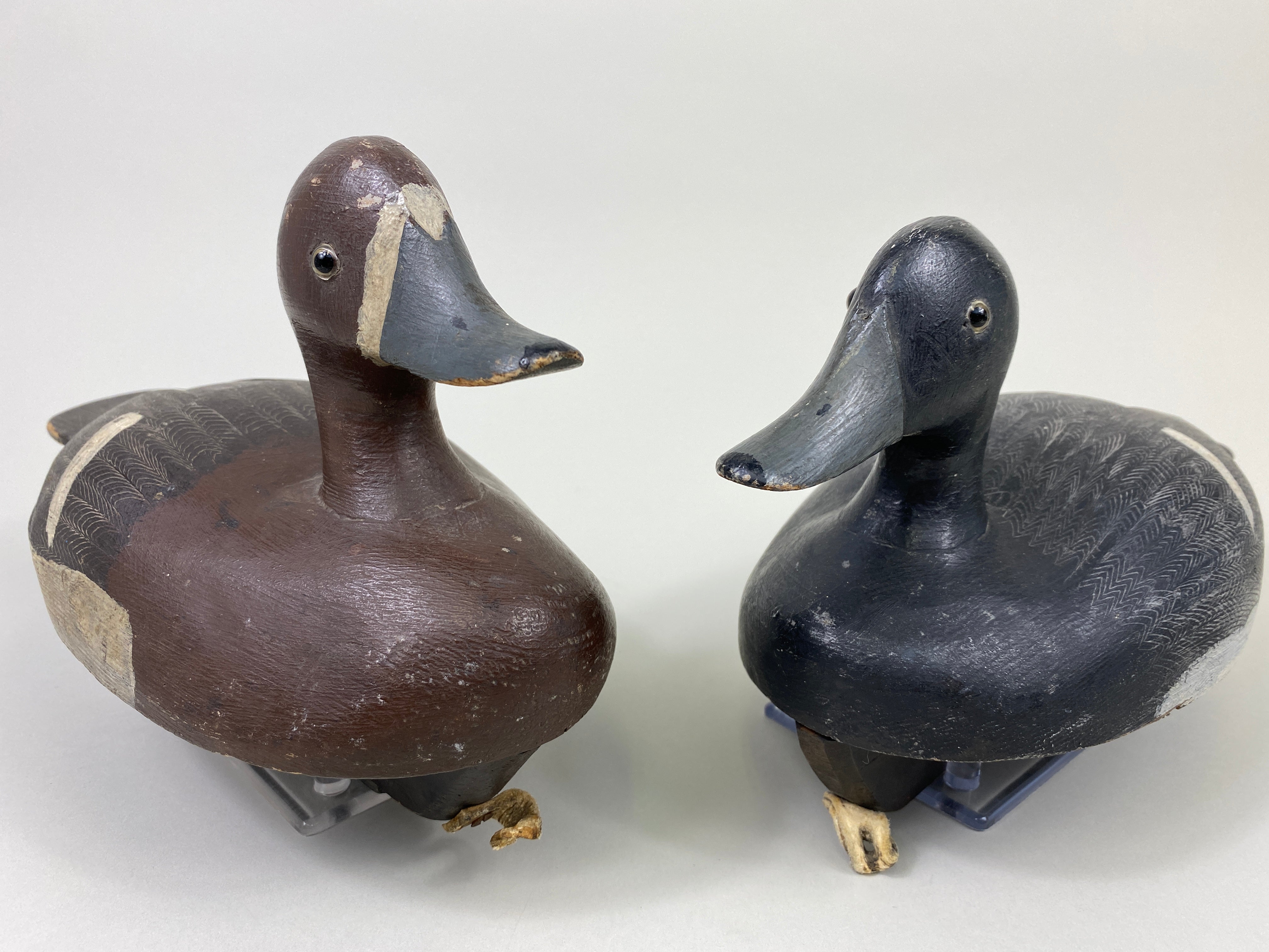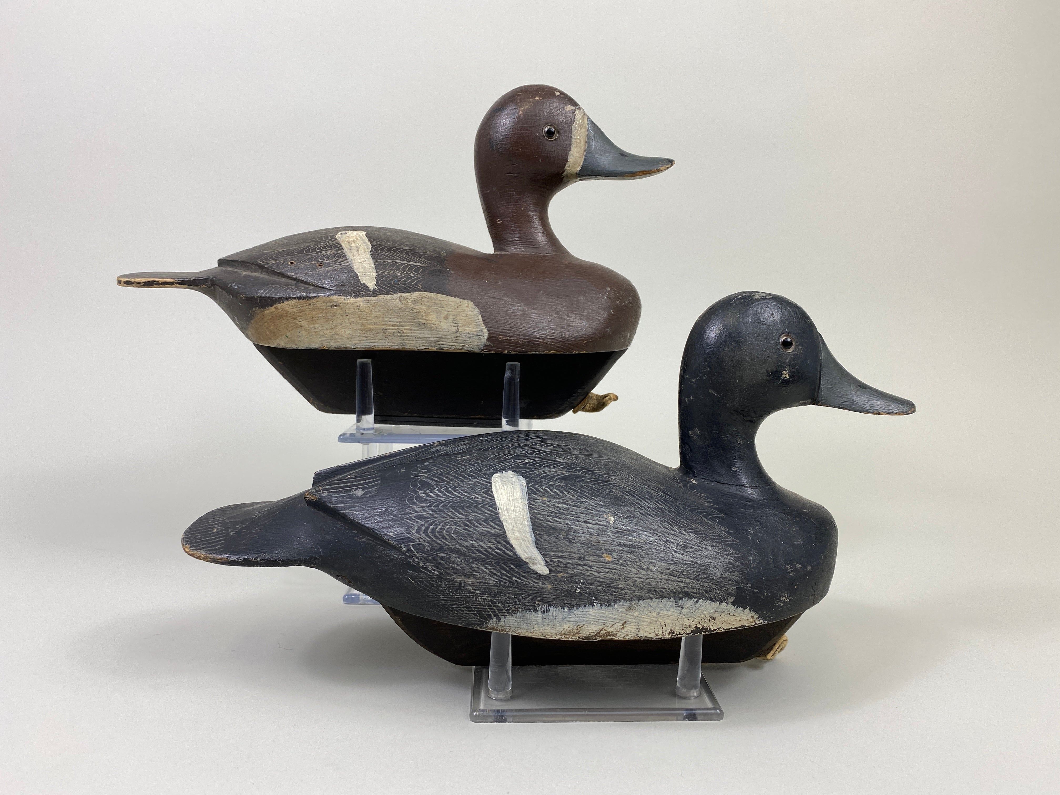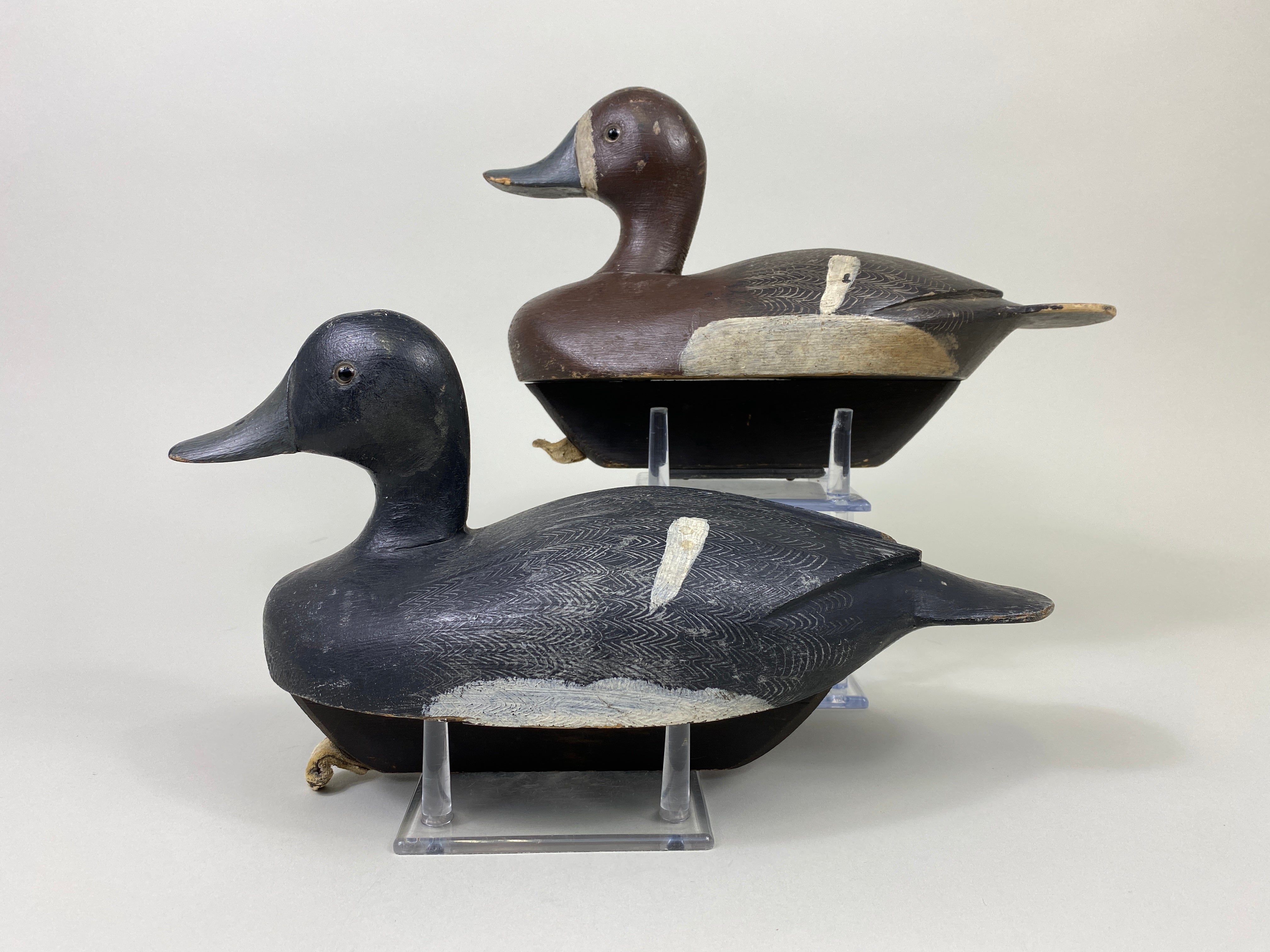 Smith Falls, Ontario, pair of bluebills by unknown carver. Decoys have glass eyes, solid bodies, original paint, wooden keels with leather rigging straps, comb painting, carved wings, and some minor...
