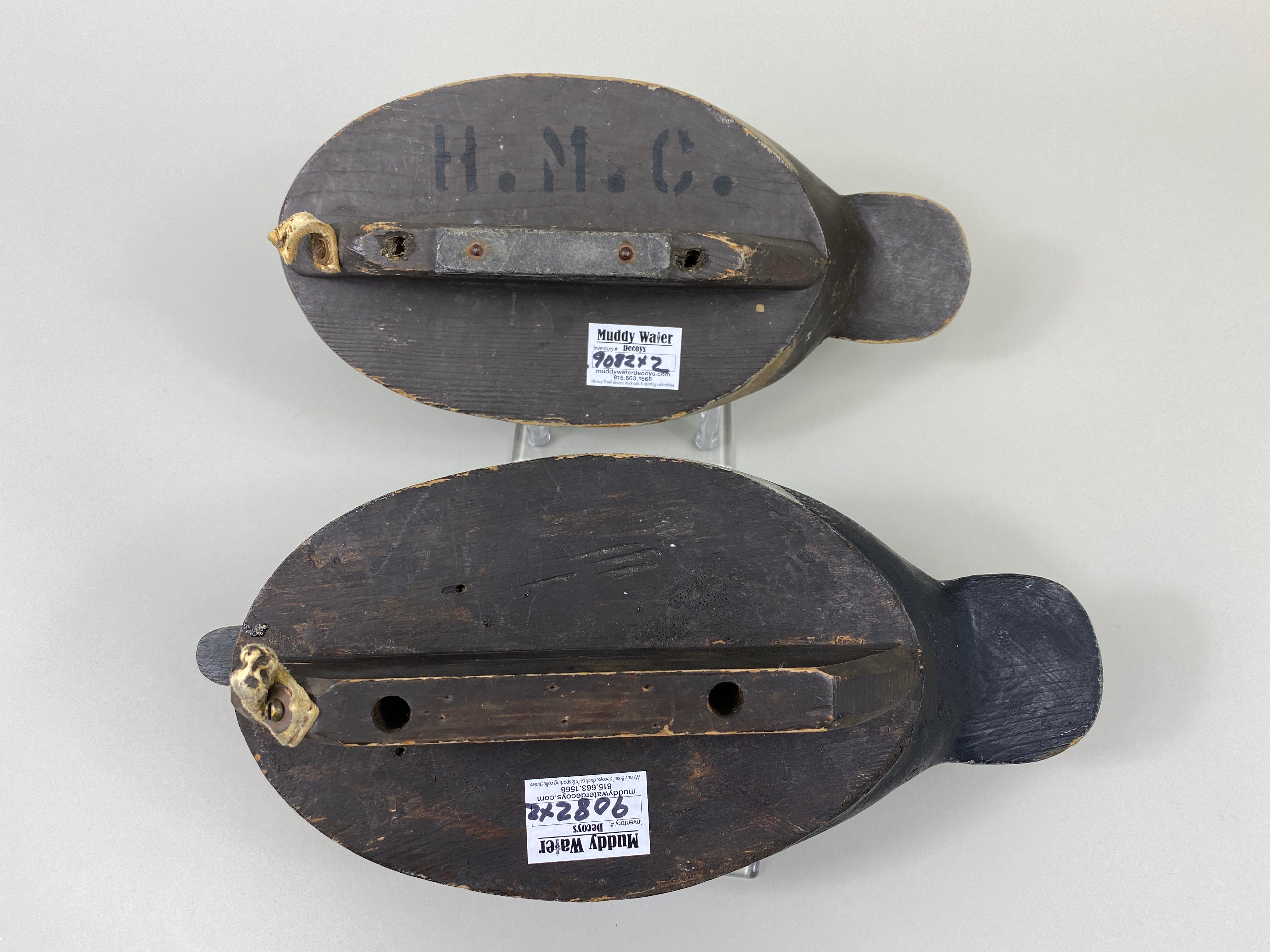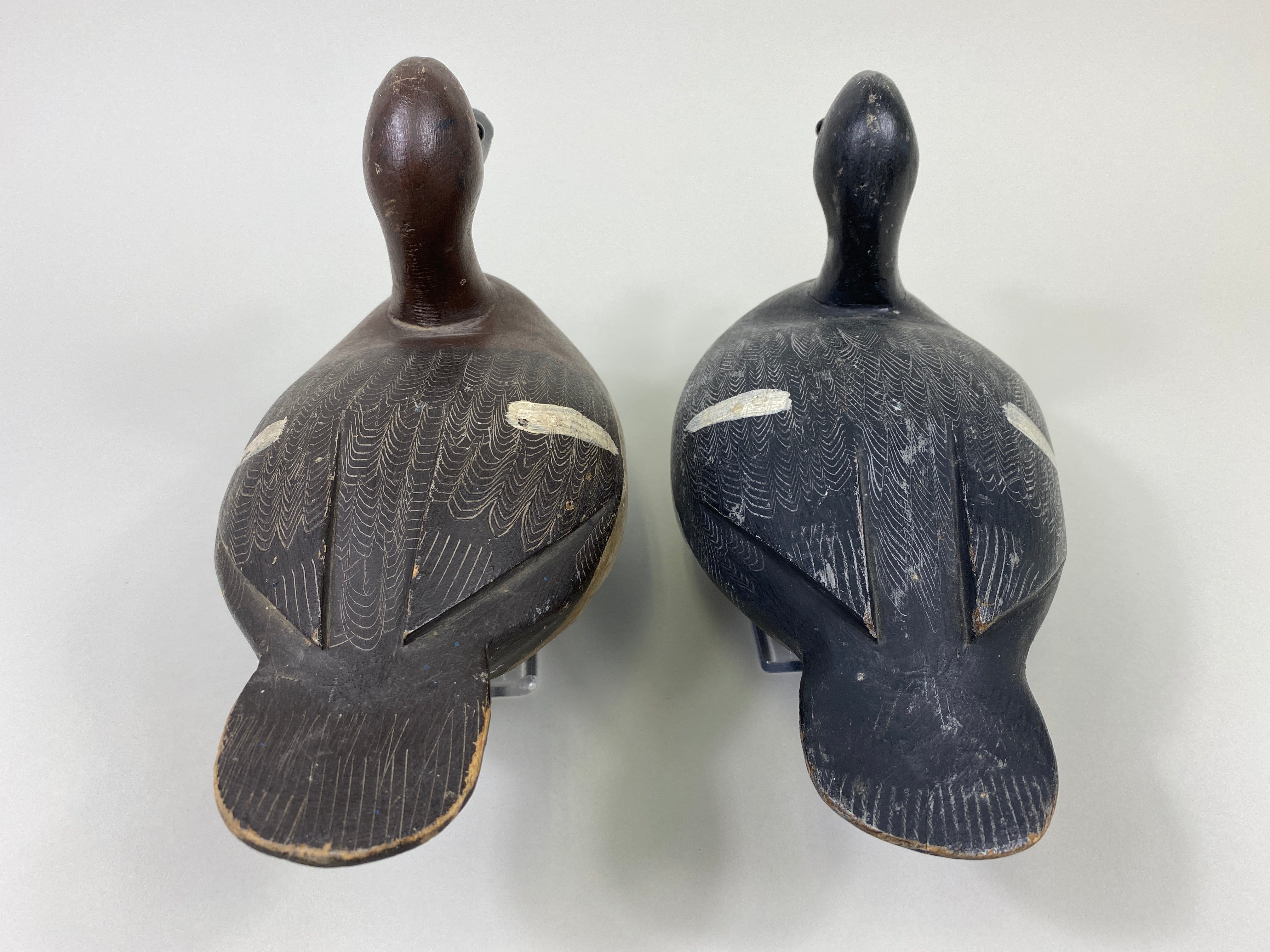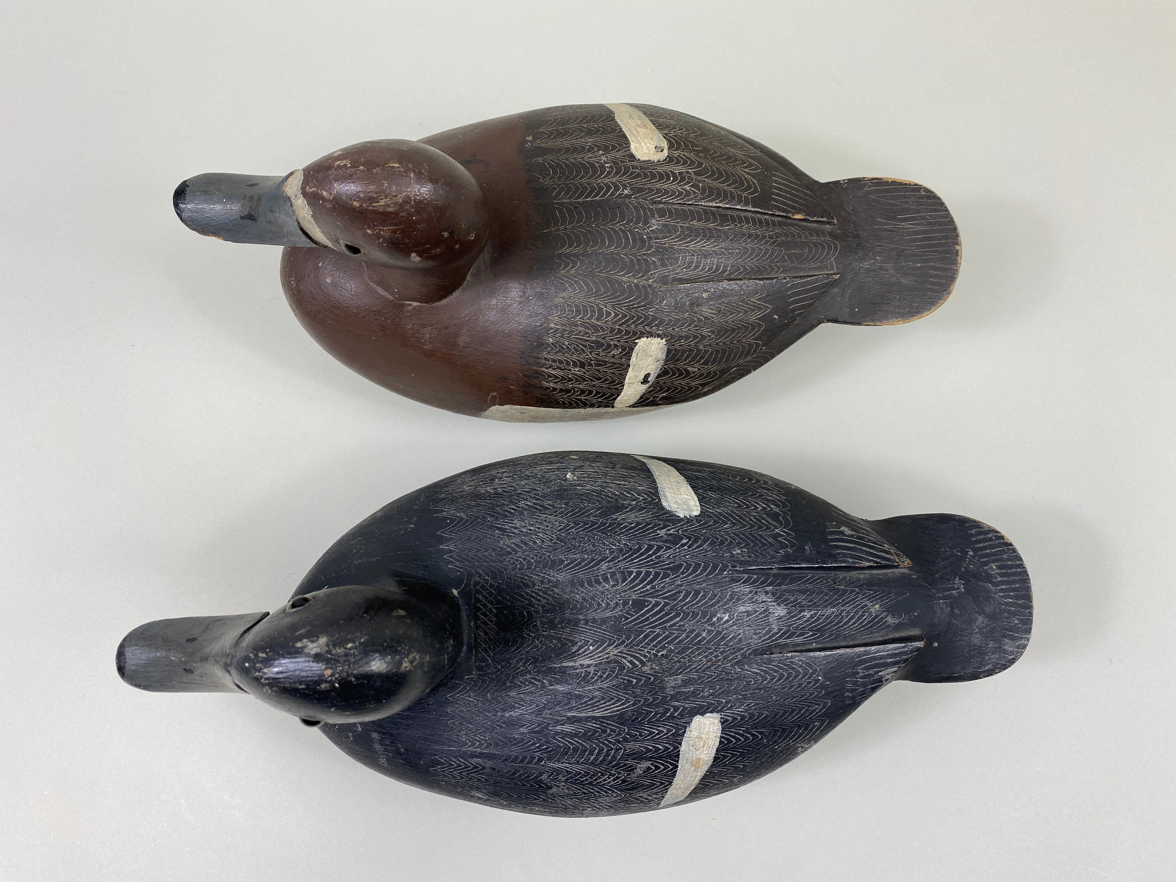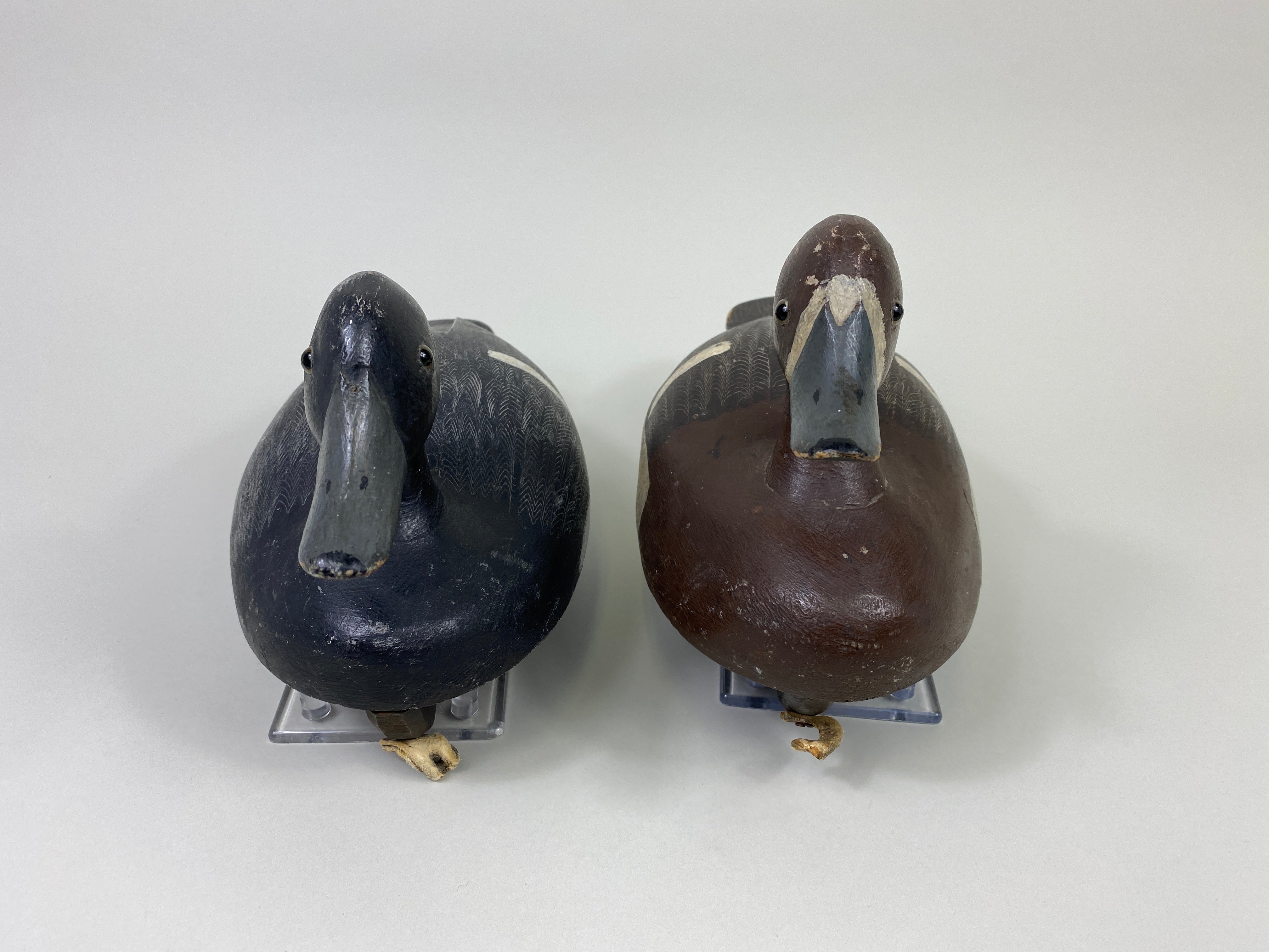 Smith Falls, Ontario, pair of bluebills by unknown carver. Decoys have glass eyes, solid bodies, original paint, wooden keels with leather rigging straps, comb painting, carved wings, and some minor...