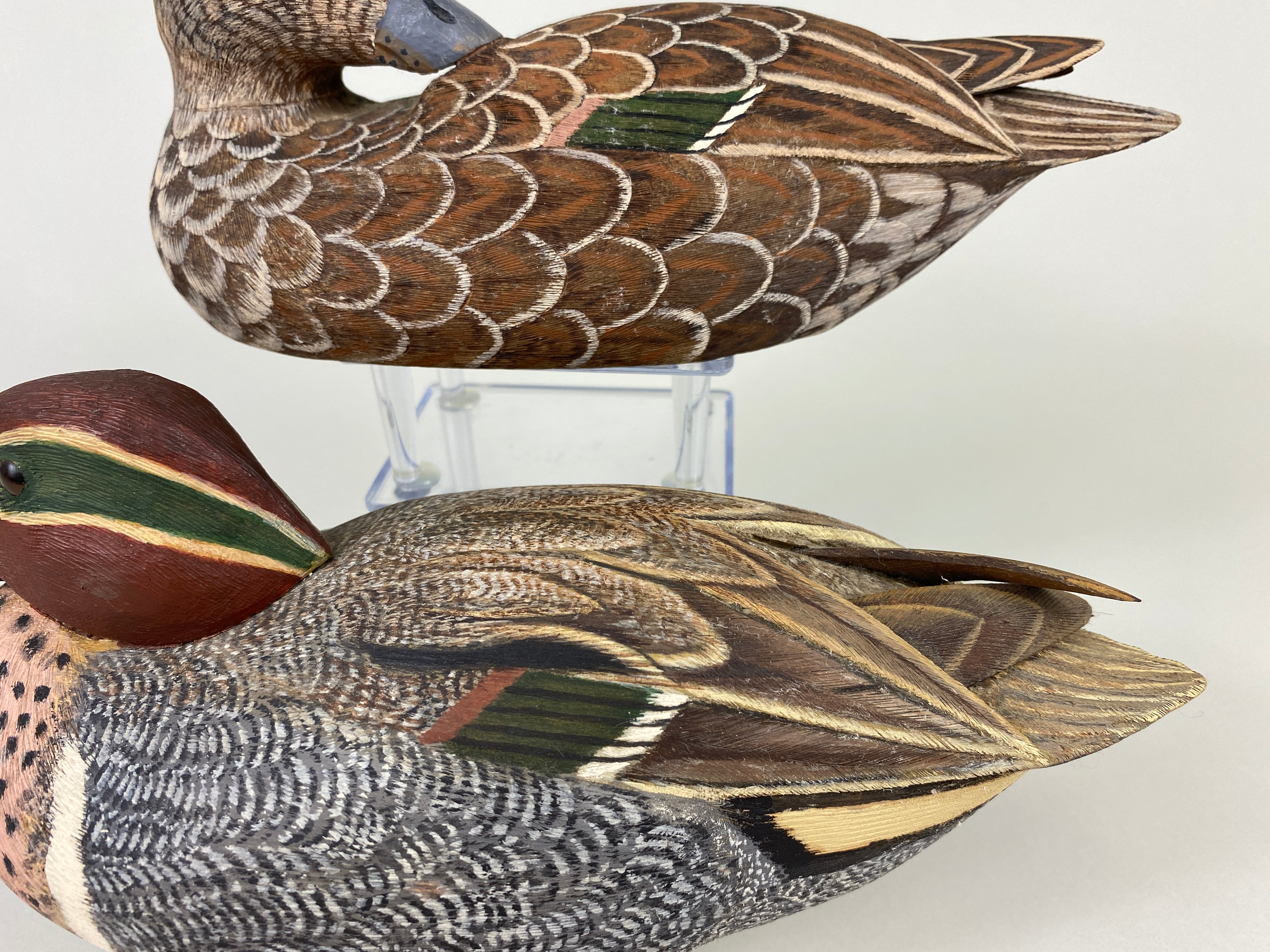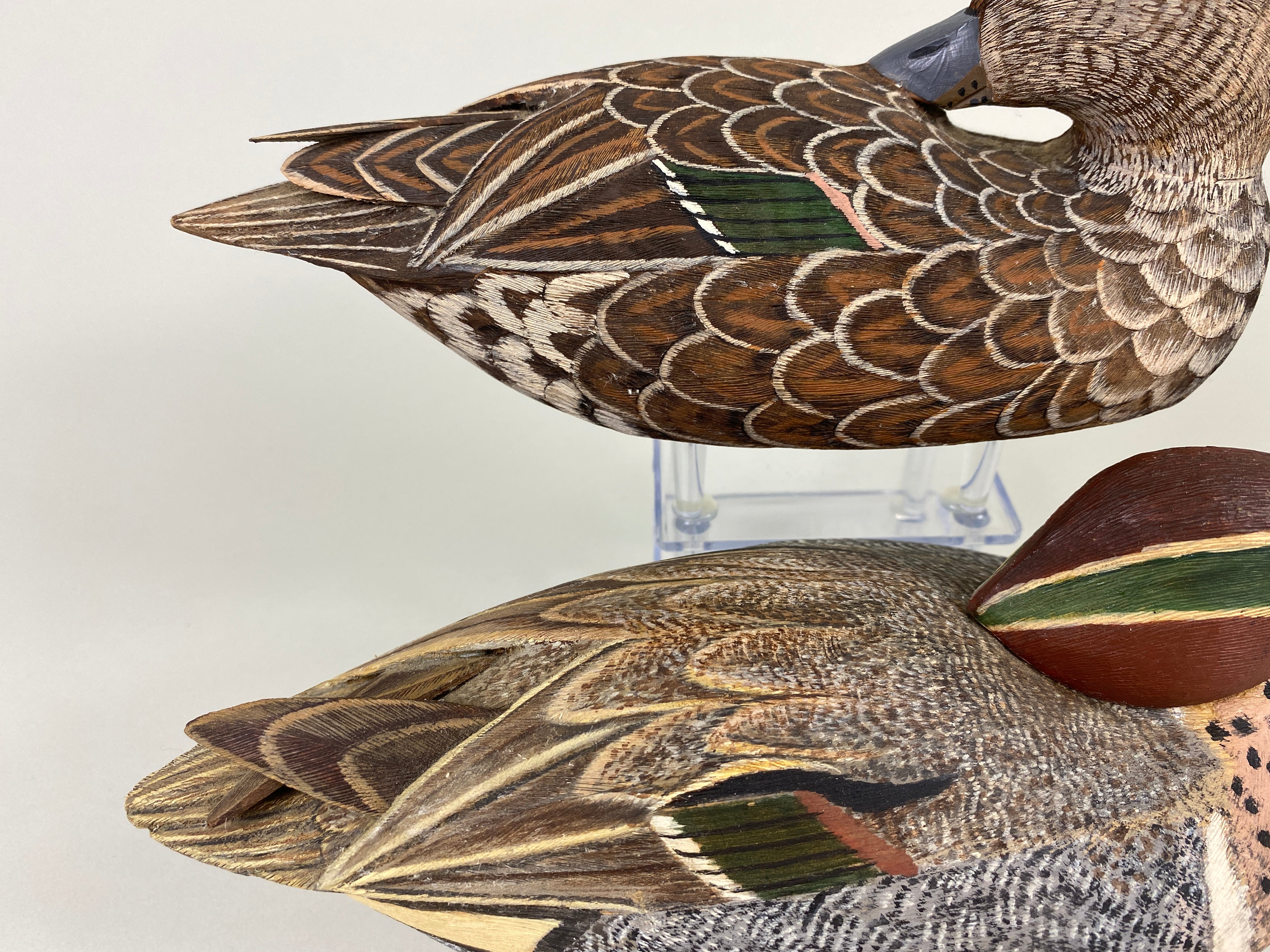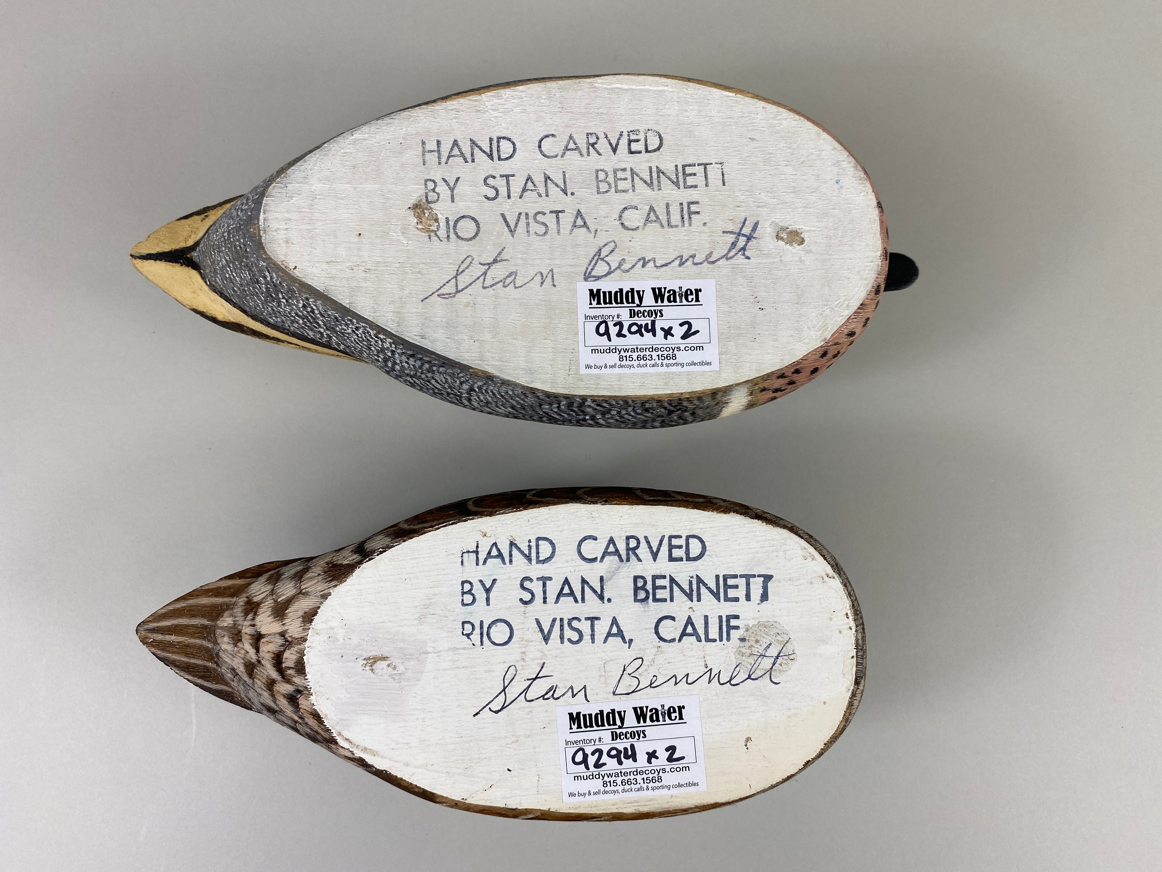 Pair of Green-Wing Teal by Stan Bennett, Rio Vista California. Very nicely carved and painted with detailed raised and crossed feathers. Glass eyes, solid bodies, original paint, bottoms are stamped...