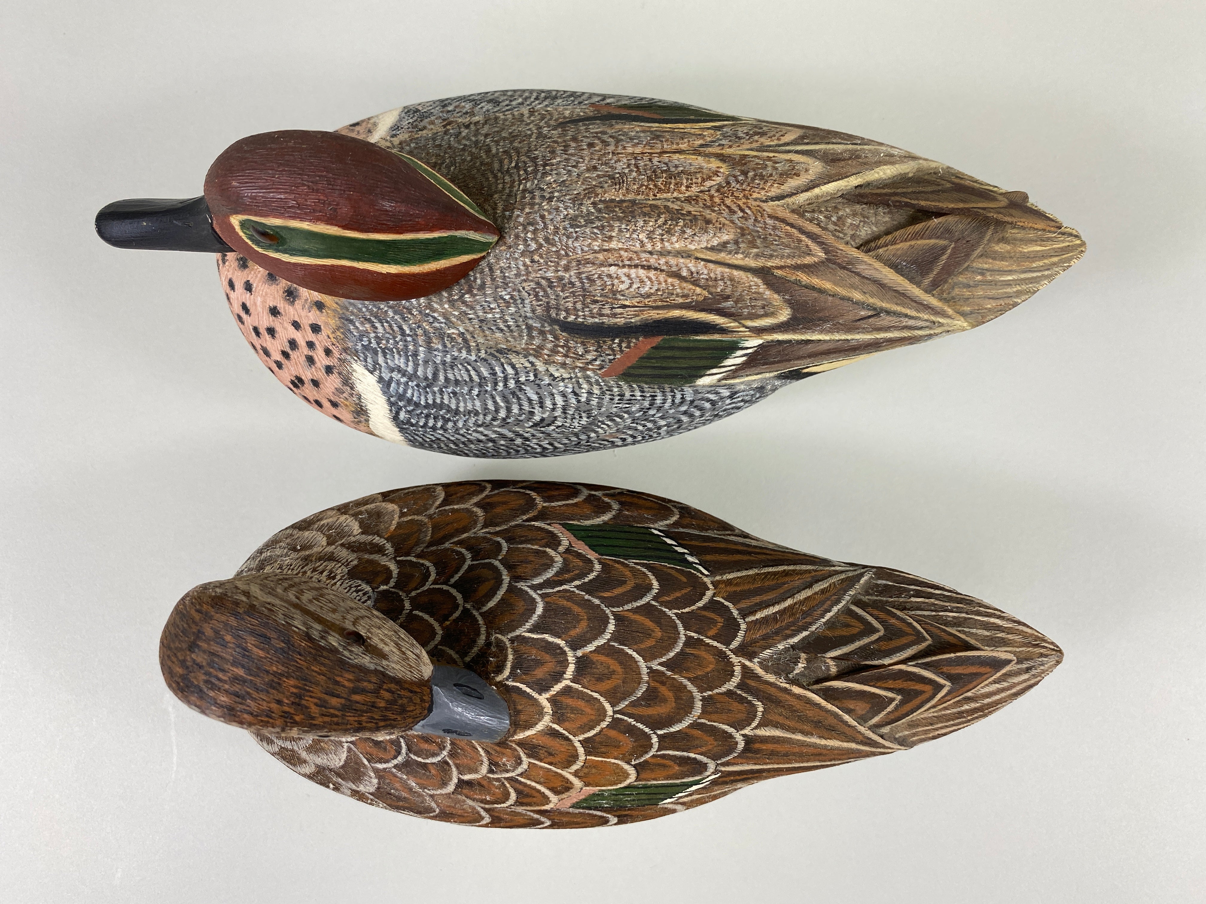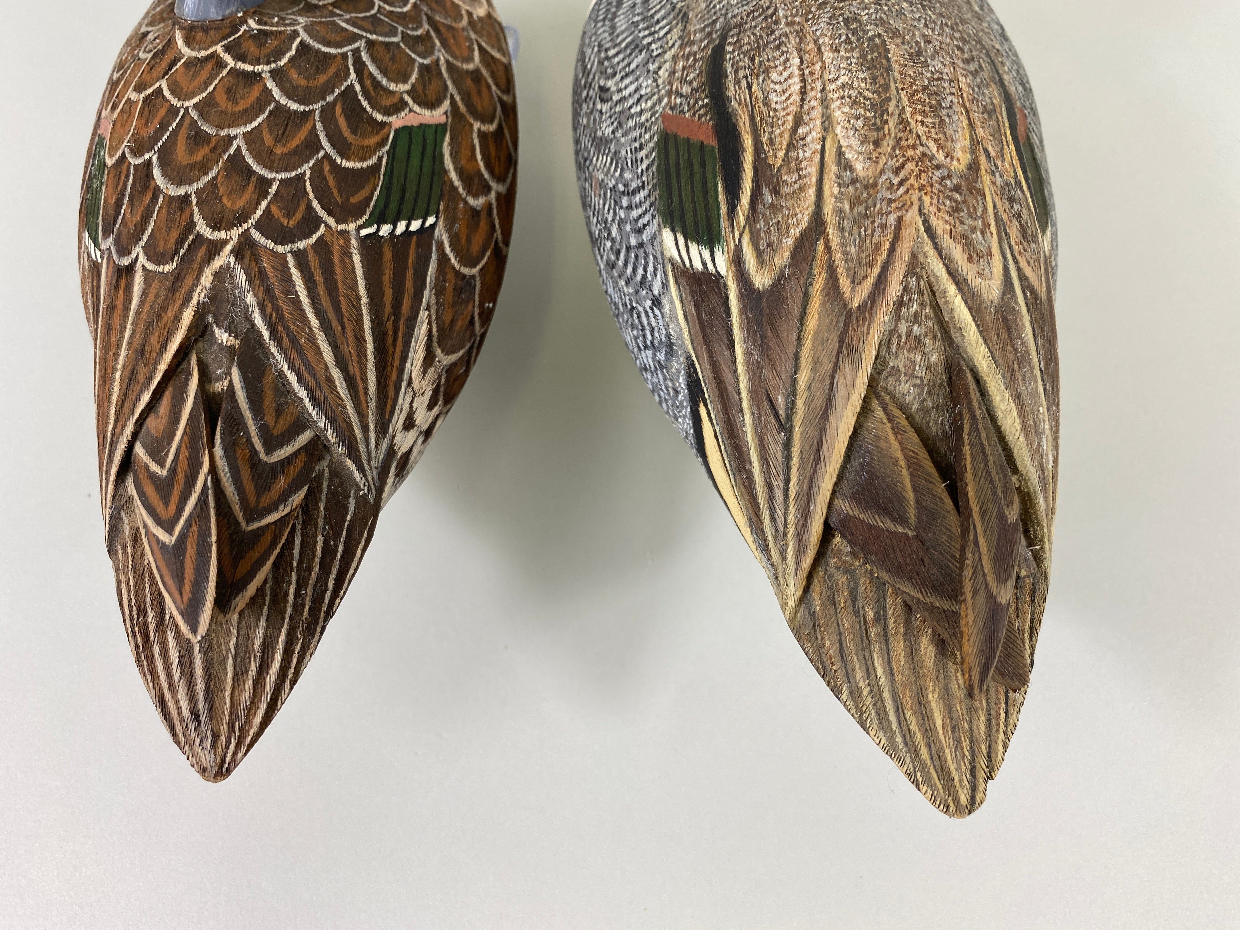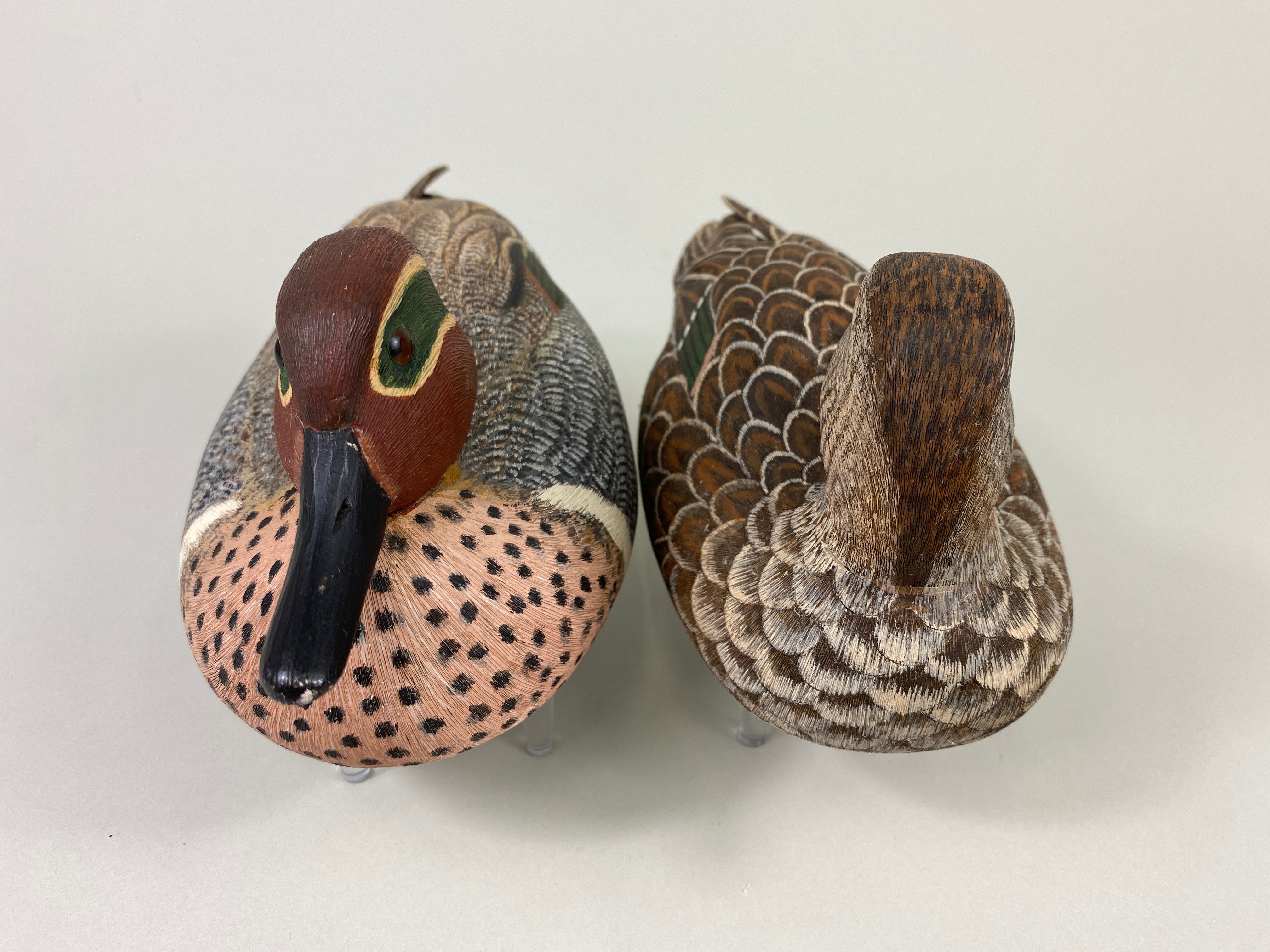 Pair of Green-Wing Teal by Stan Bennett, Rio Vista California. Very nicely carved and painted with detailed raised and crossed feathers. Glass eyes, solid bodies, original paint, bottoms are stamped...