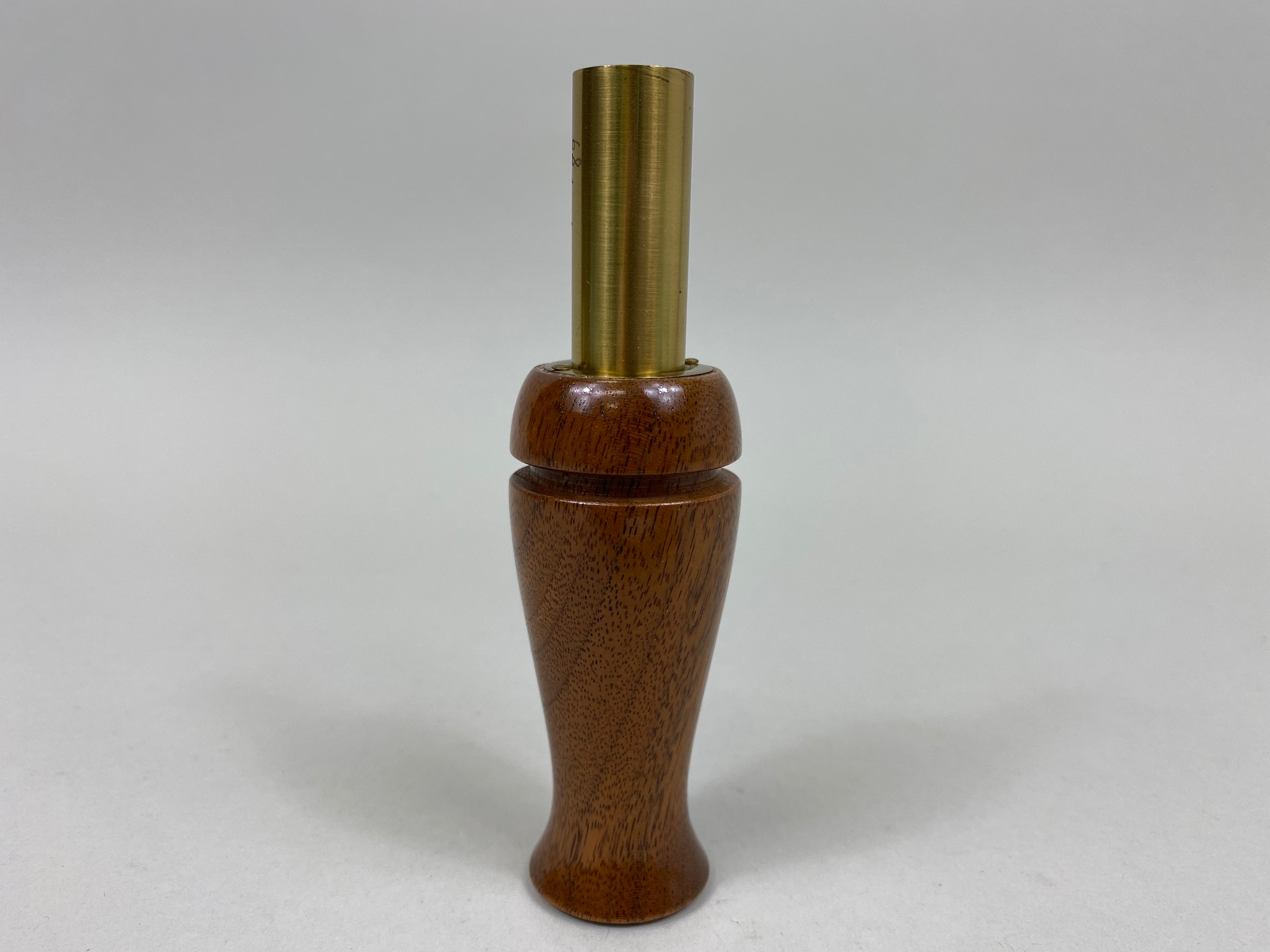 Duck call by Johnny "Bill" Weiss, Chandlerville, Illinois. Call is in very good, like new condition, nice wood colors, works, and has "Johnny Bill 89" engraved on brass stopper. Storage...