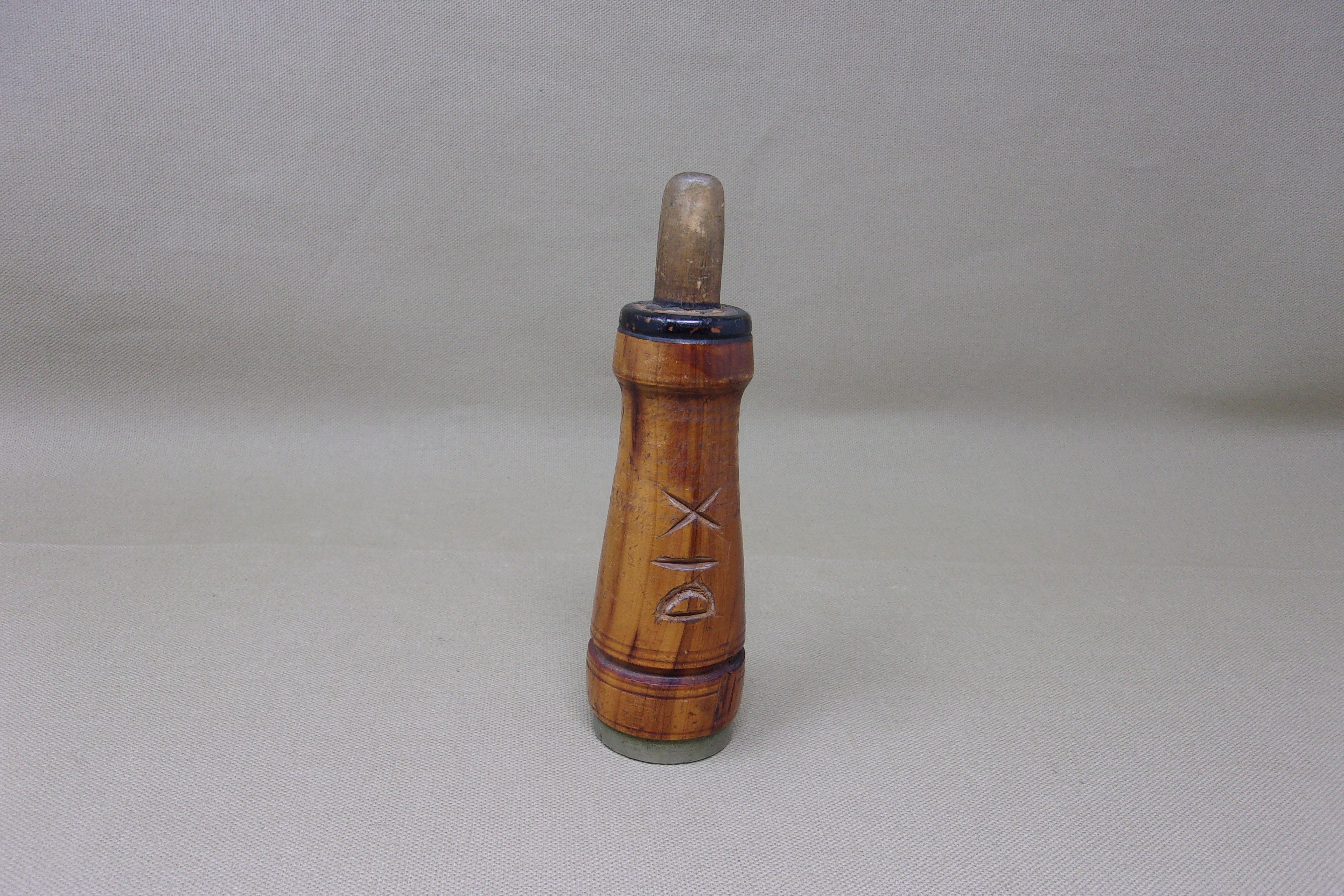 Charles Perdew Crow Call, Henry Illinois.  "CHAS. H. PERDEW, HENRY, ILL." stamp on barrel. Barrel has "DIX" carved in side of barrel and has wear from being used.  Stands 5-1/2" tall.