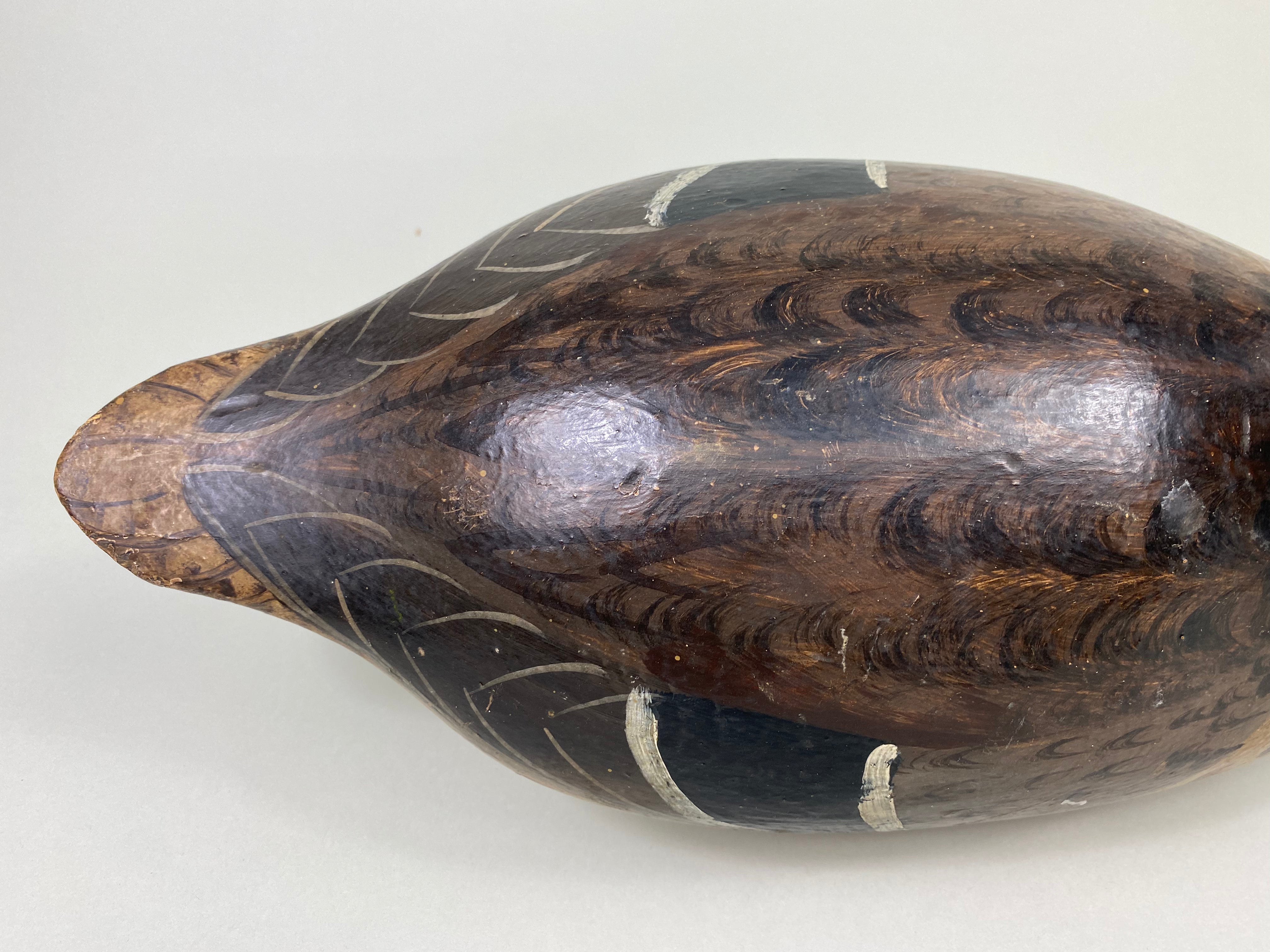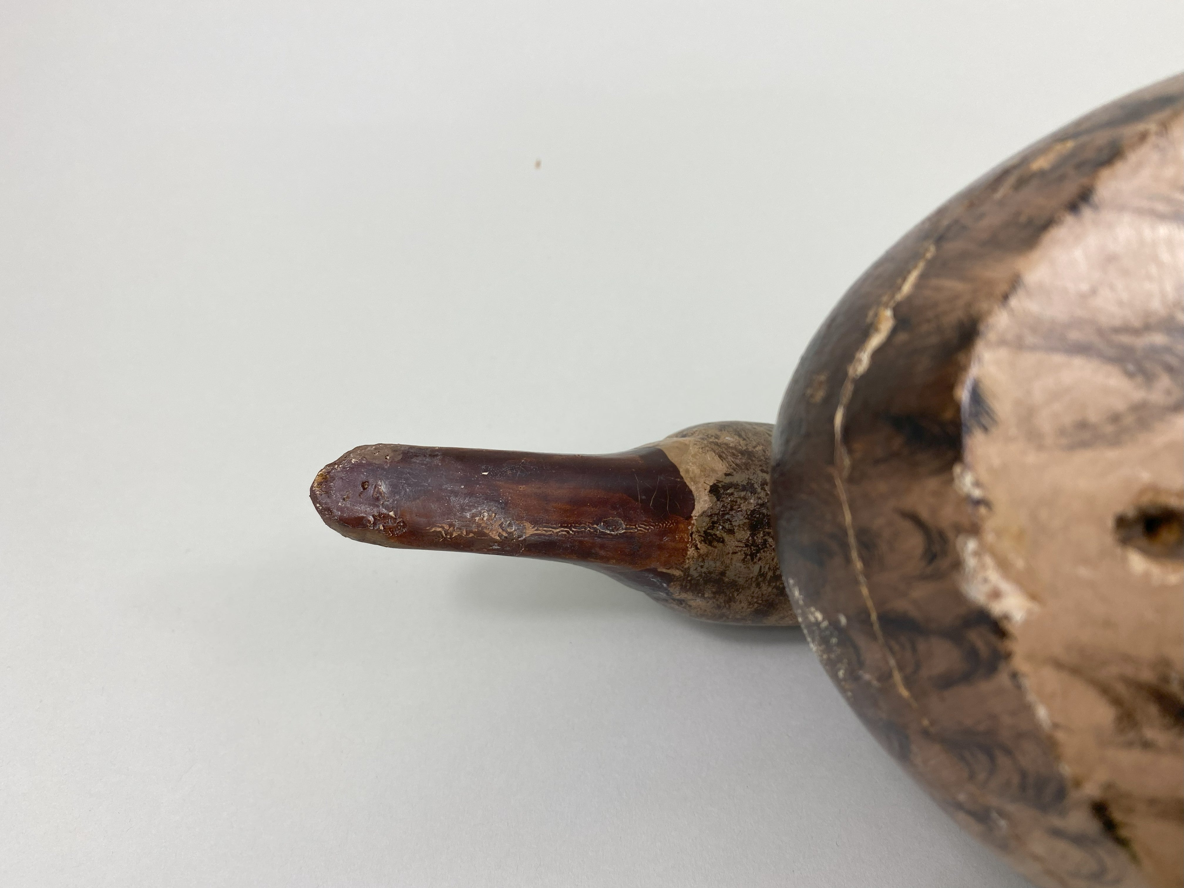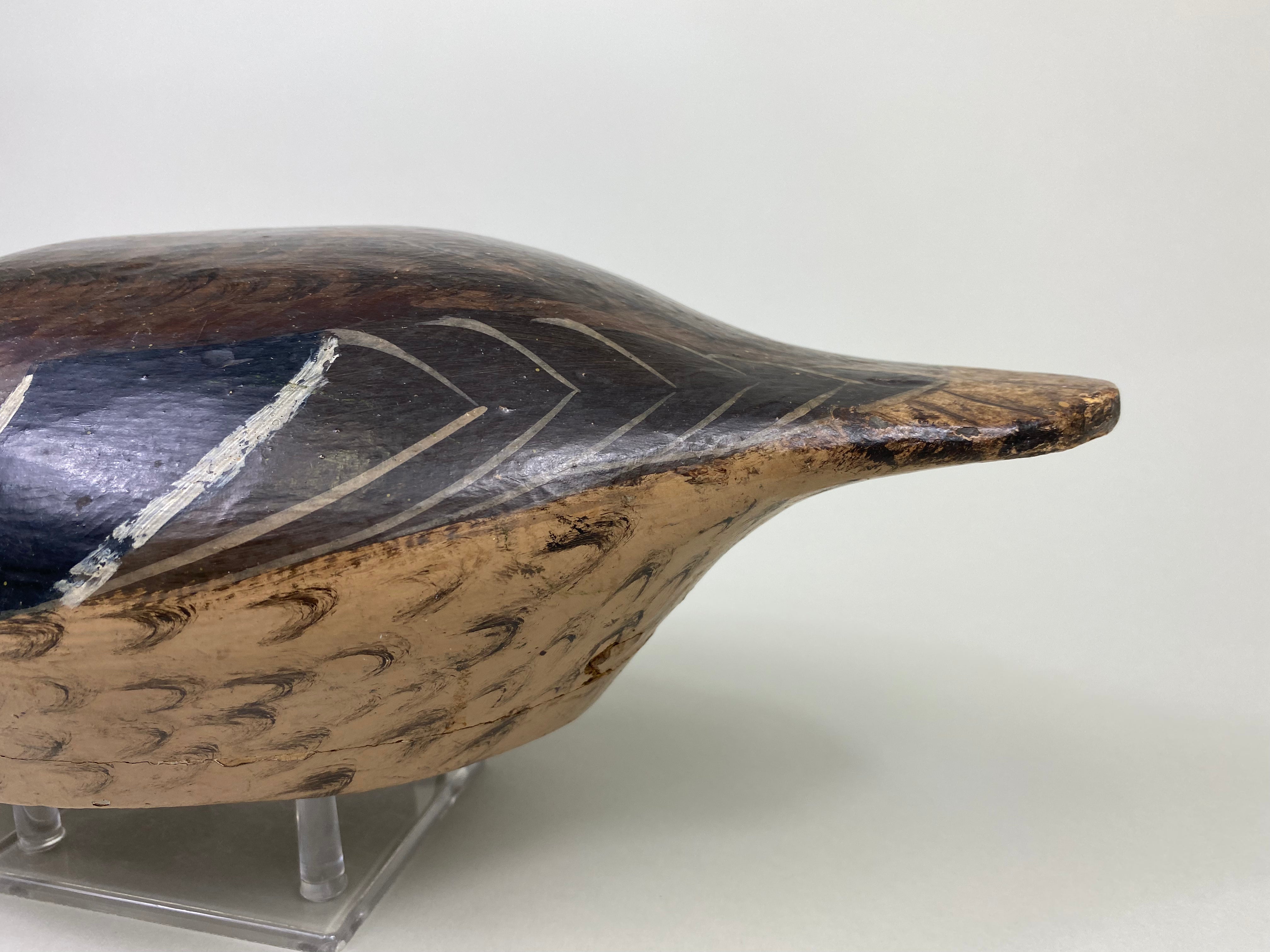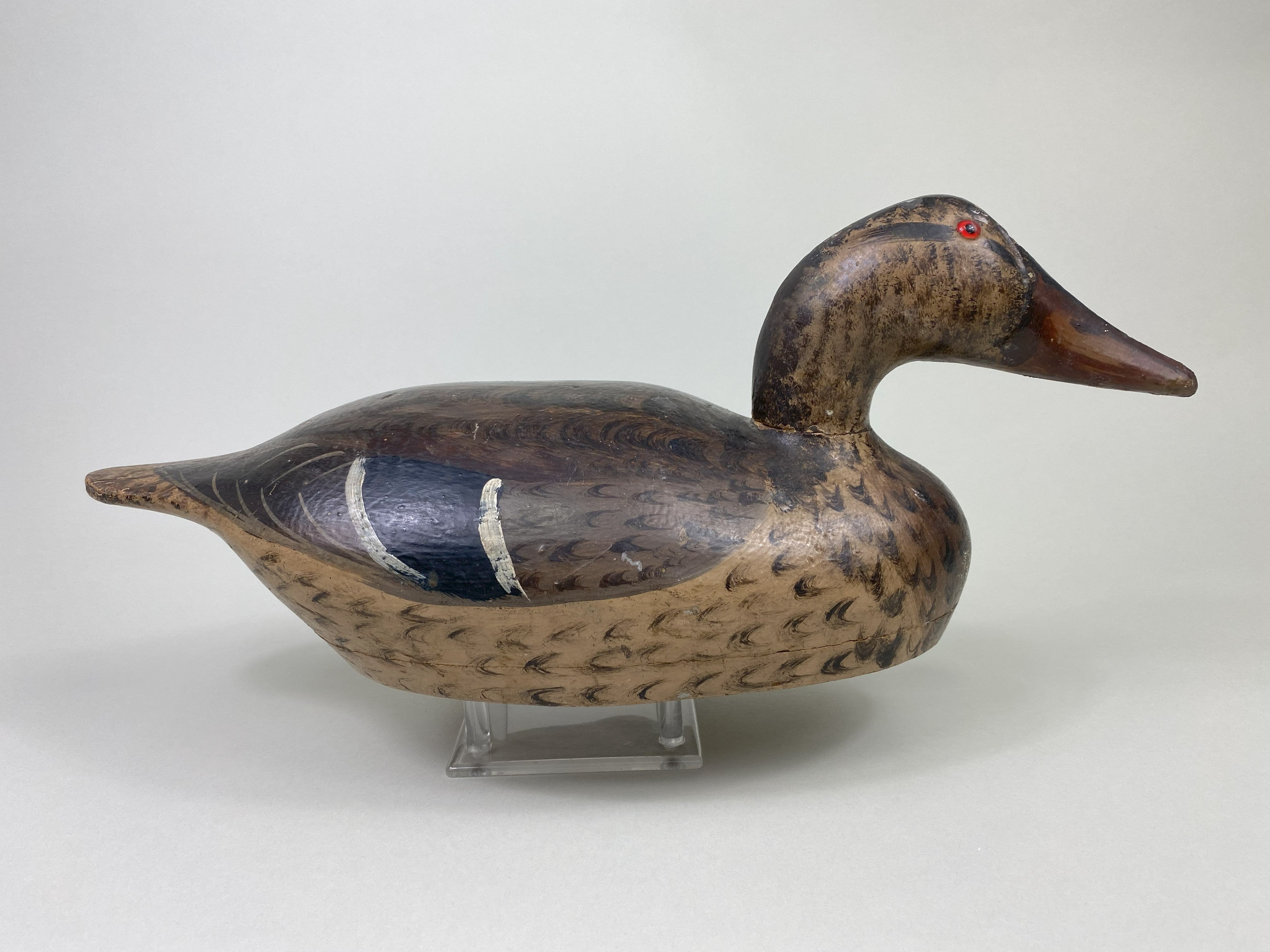 Gus Moak, Tustin, Wisconsin, Canvasback painted as a mallard hen by Edna Perdew, Henry, Illinois. Glass eyes, hollow with bottom board, puppies chews on bill, otherwise in good condition with...