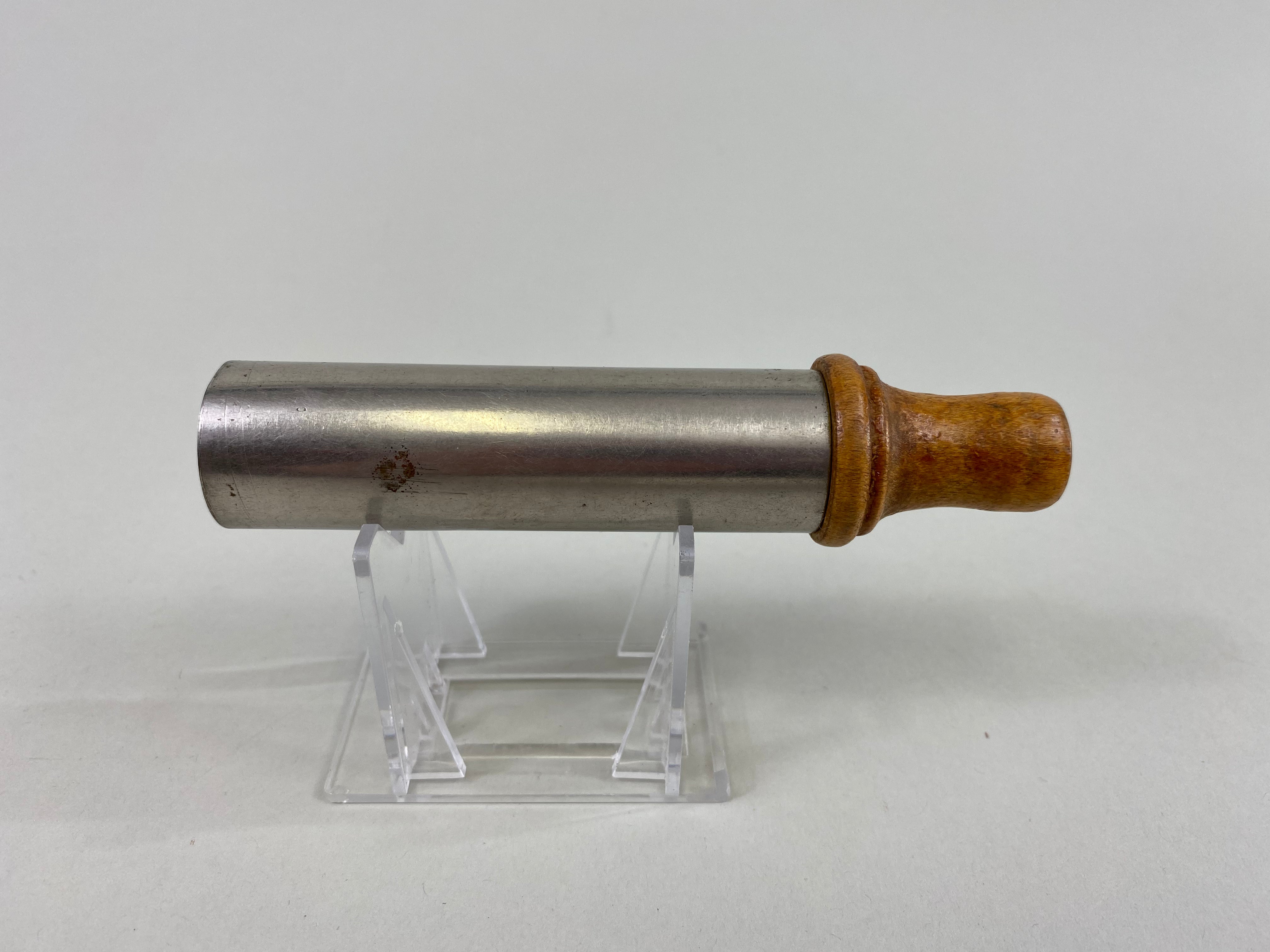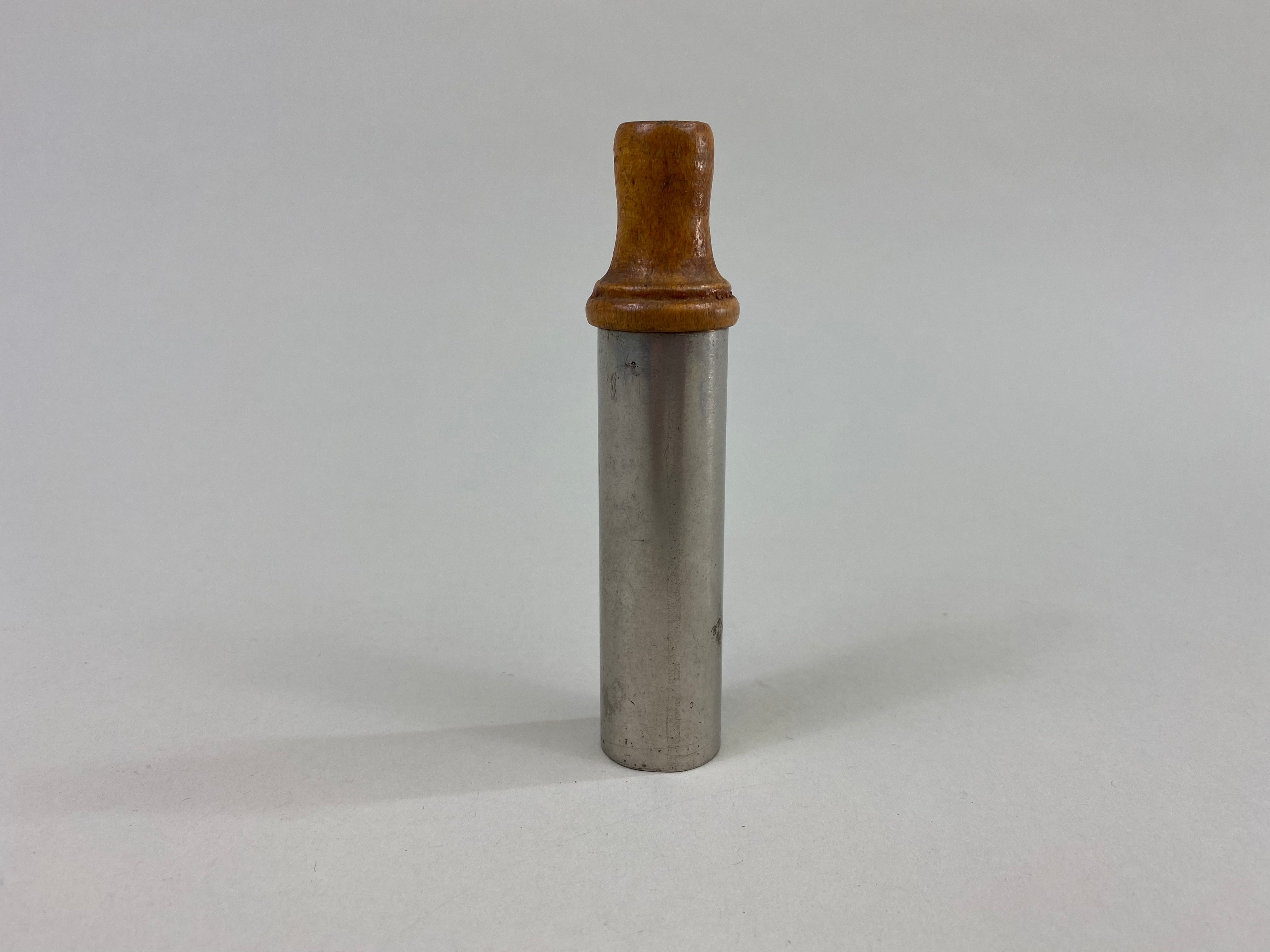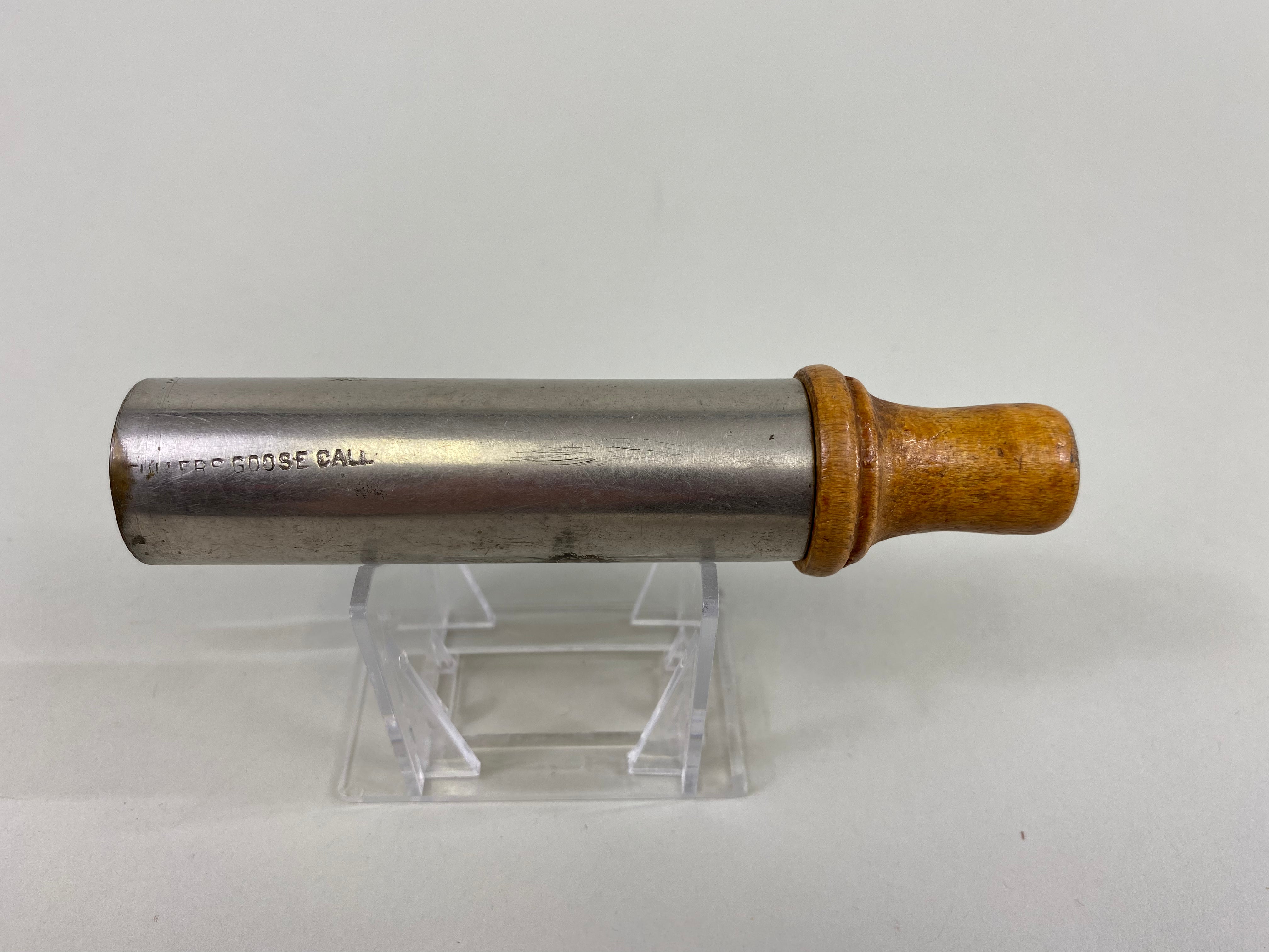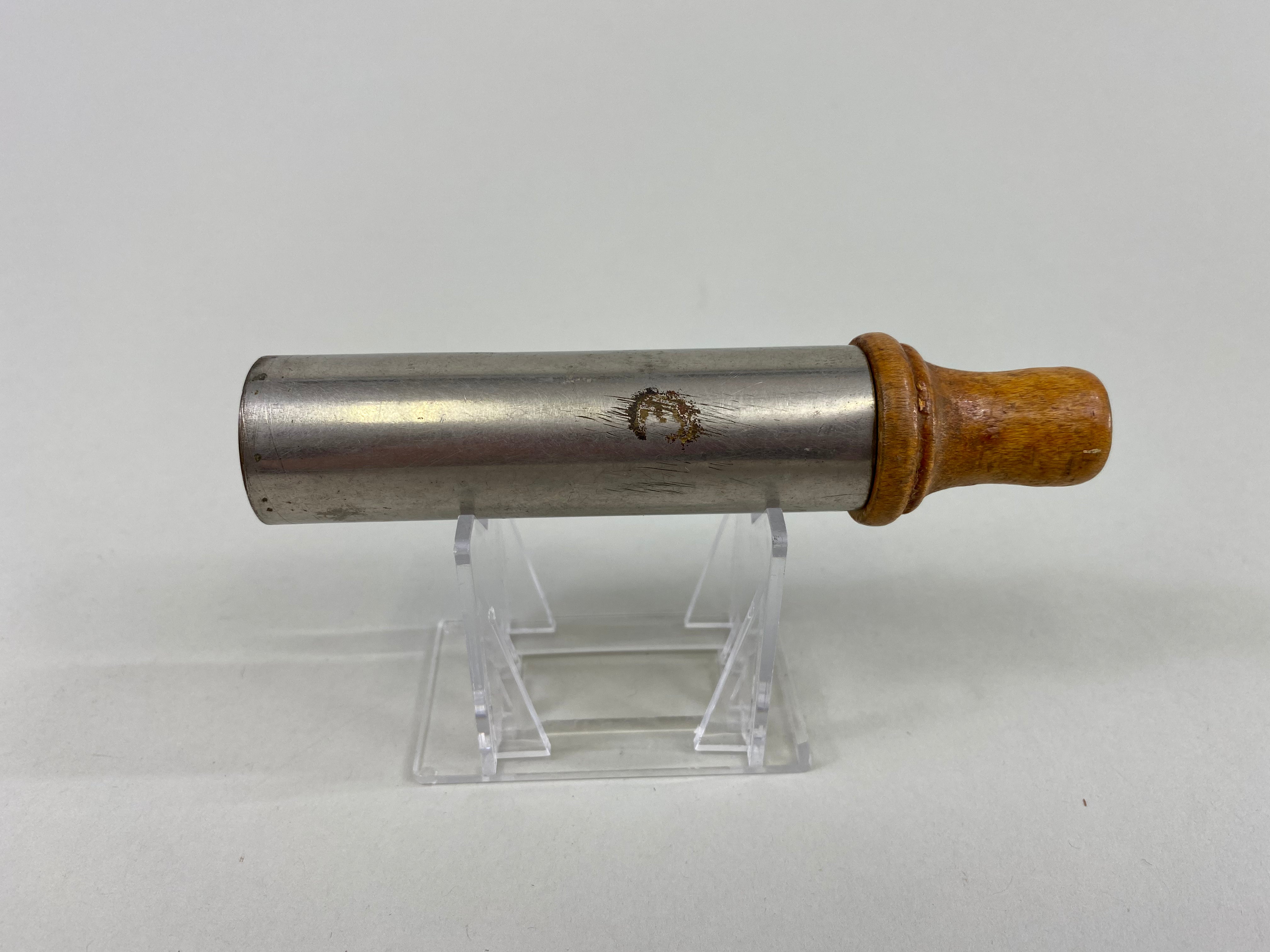 Fullers Goose Call, Chicago Illinois. Metal with wooden stopper end. "Fullers Goose Call" stamp on barrel. Call works, has some wear from use, and measures 5" long.