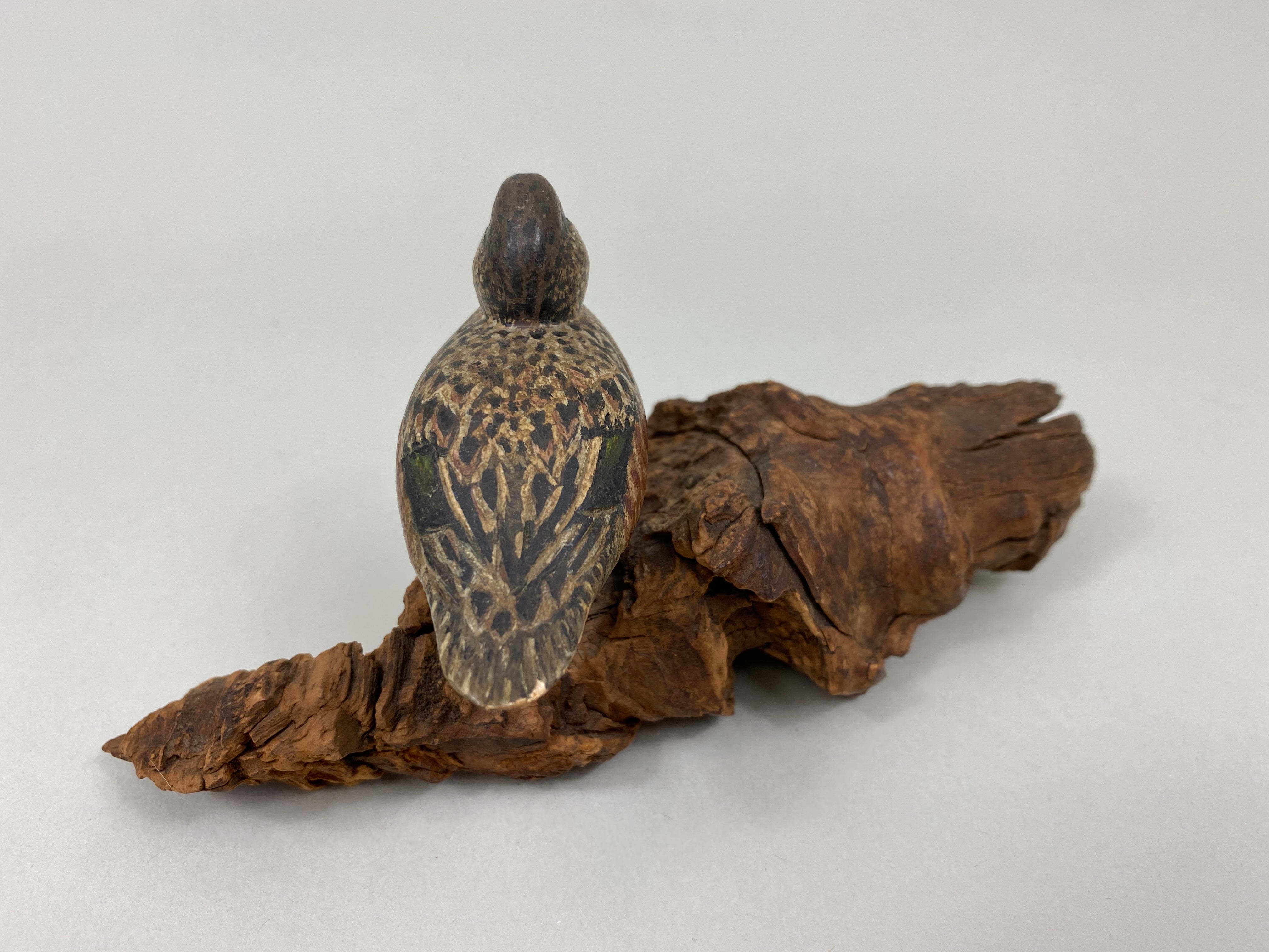 Miniature Wigeon Hen standing on a piece of driftwood. Unknown carver, carved eyes, all original in very good condition, metal legs and feet, very well done. Wigeon is 3" long...