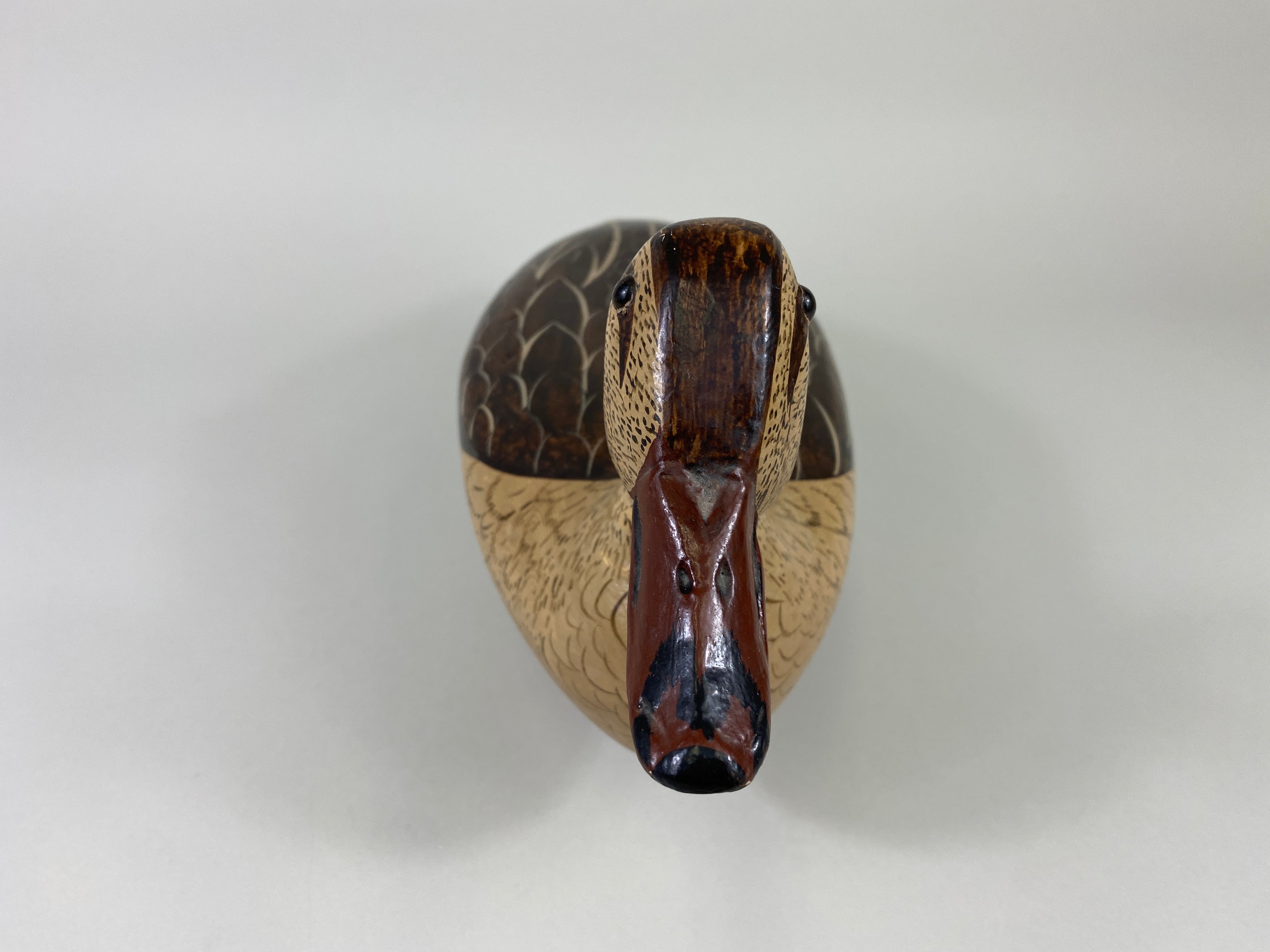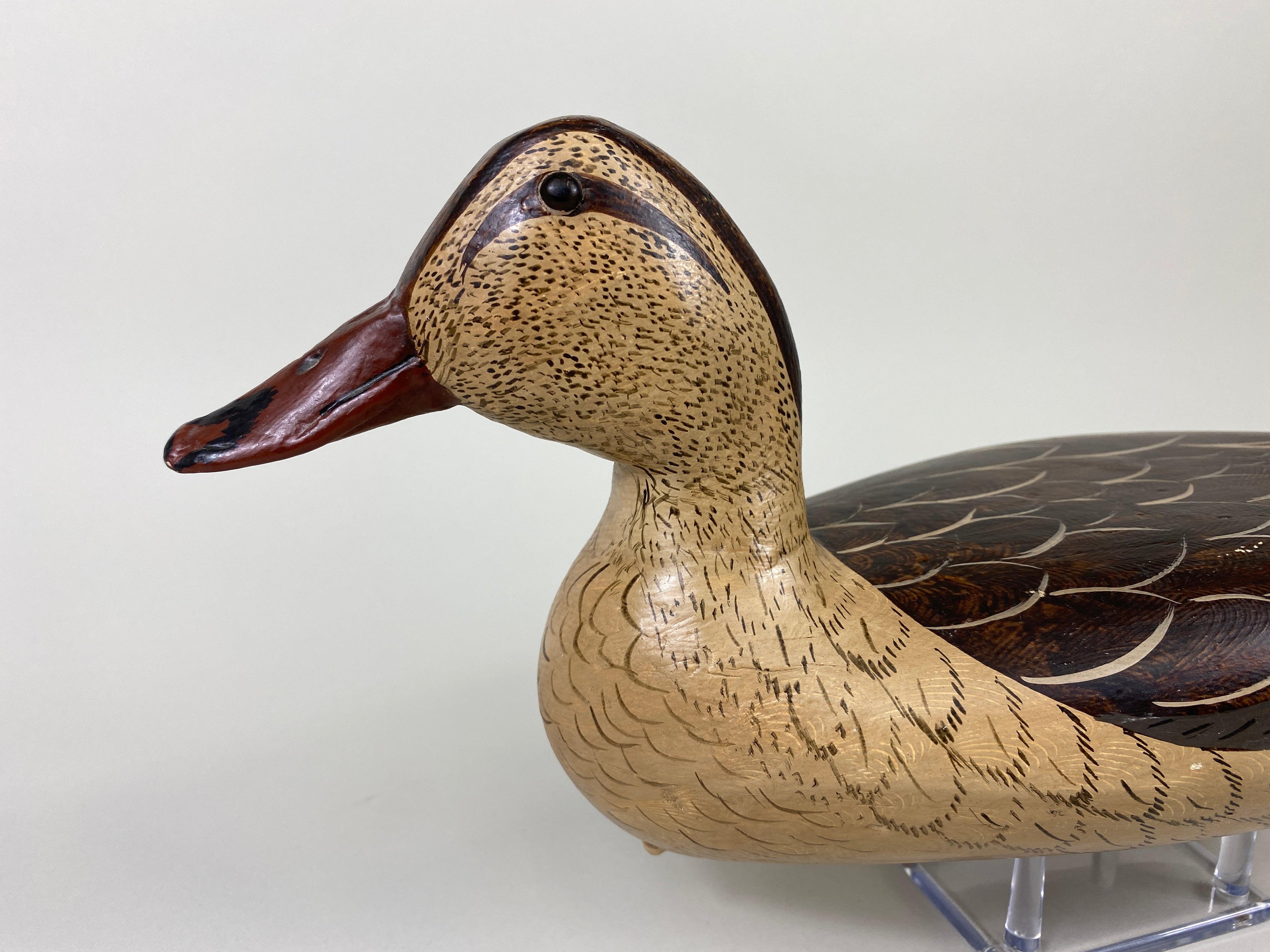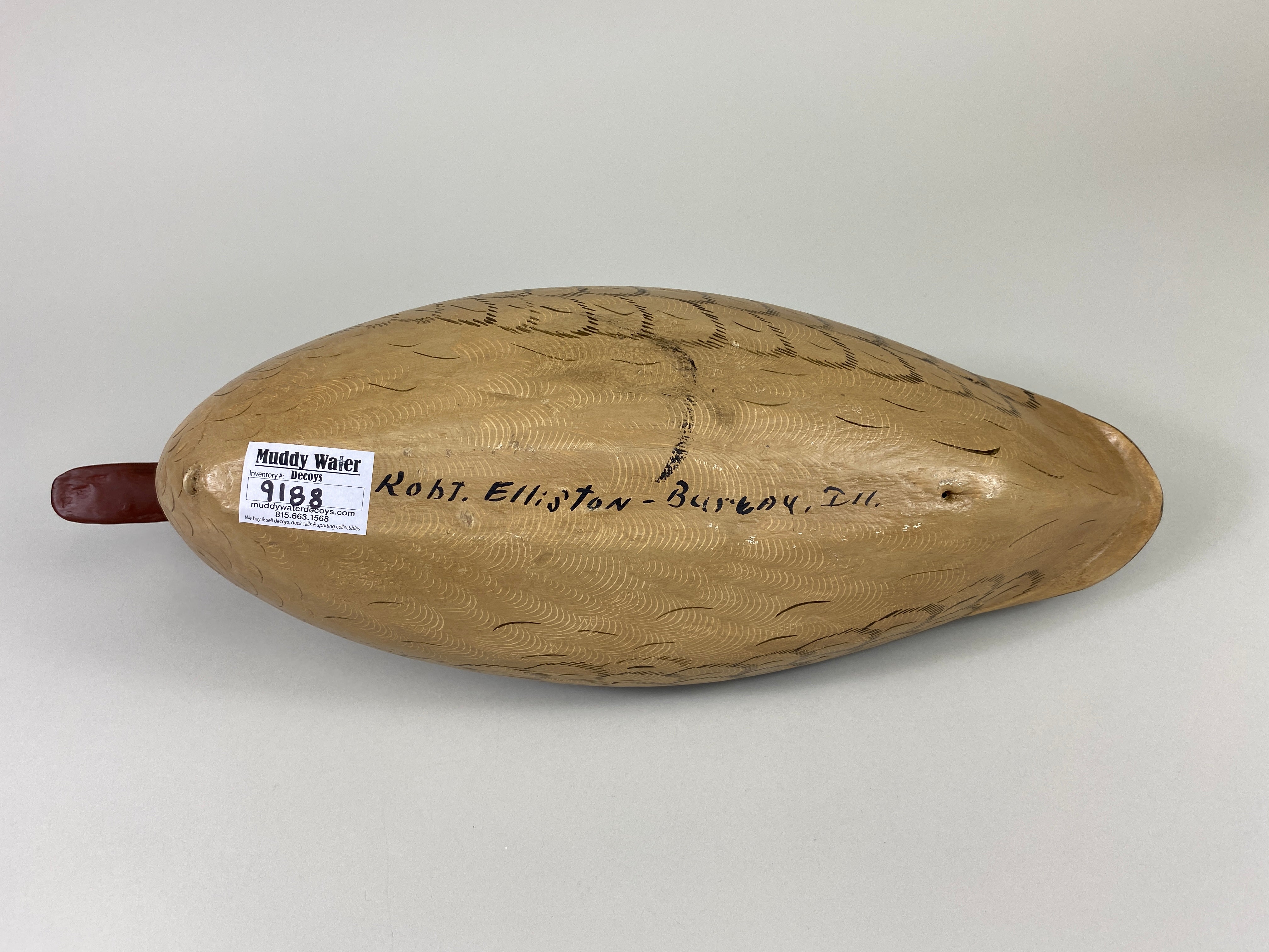 Robert Elliston Mallard Hen, Bureau, Illinois, Circa 1890's, painted by Charles Moore, Dekalb, Illinois. Decoy has glass eyes, hollow body, old hunting wear, carver's name written on the bottom by...