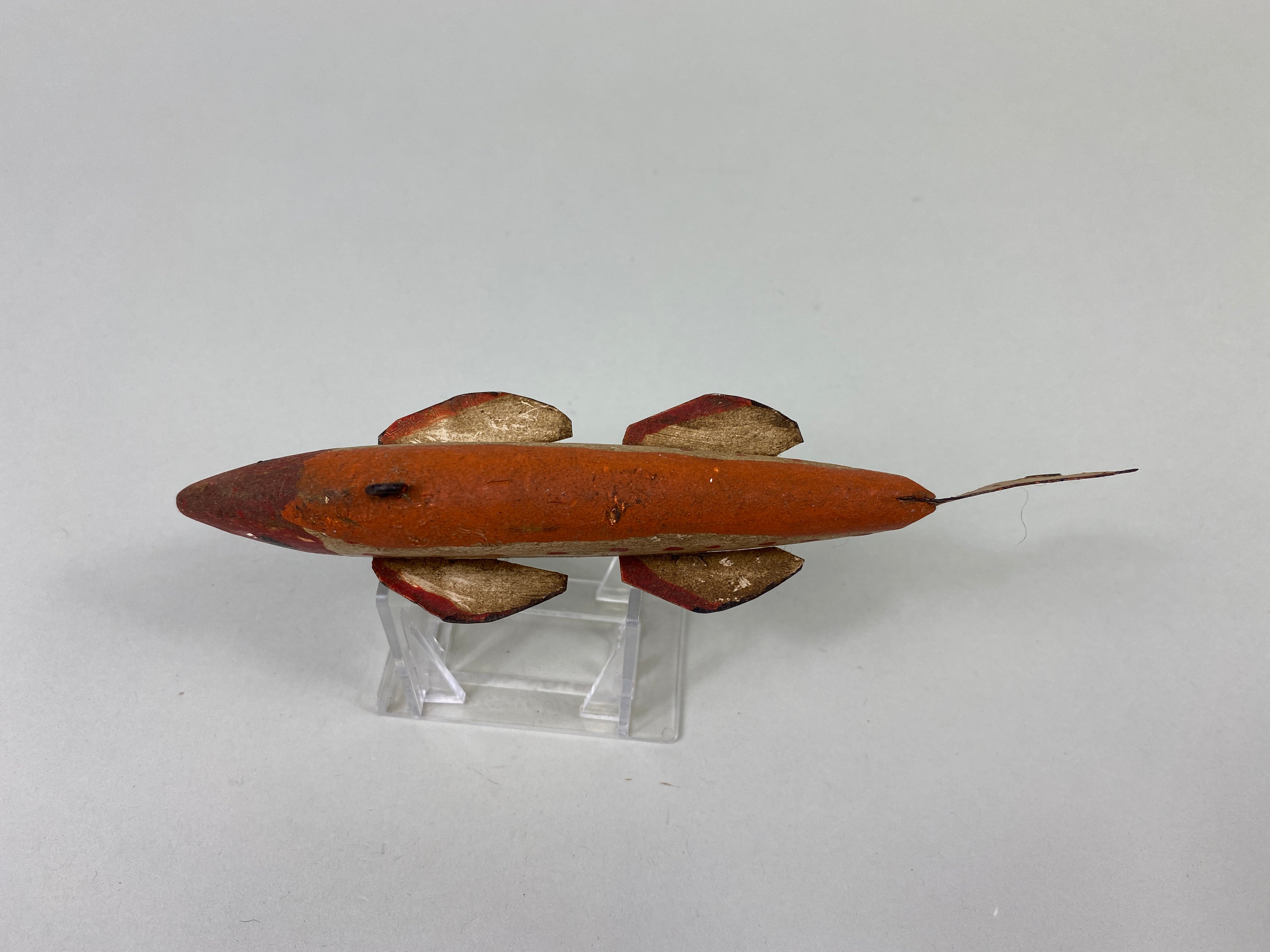 Fish Spearing Decoy by unknown maker. Painted eyes, carved mouth, metal fins and tail, inletted lead weight, has wear from use. Measures 6-1/2" long, 2" wide, and 1-1/2" tall.
