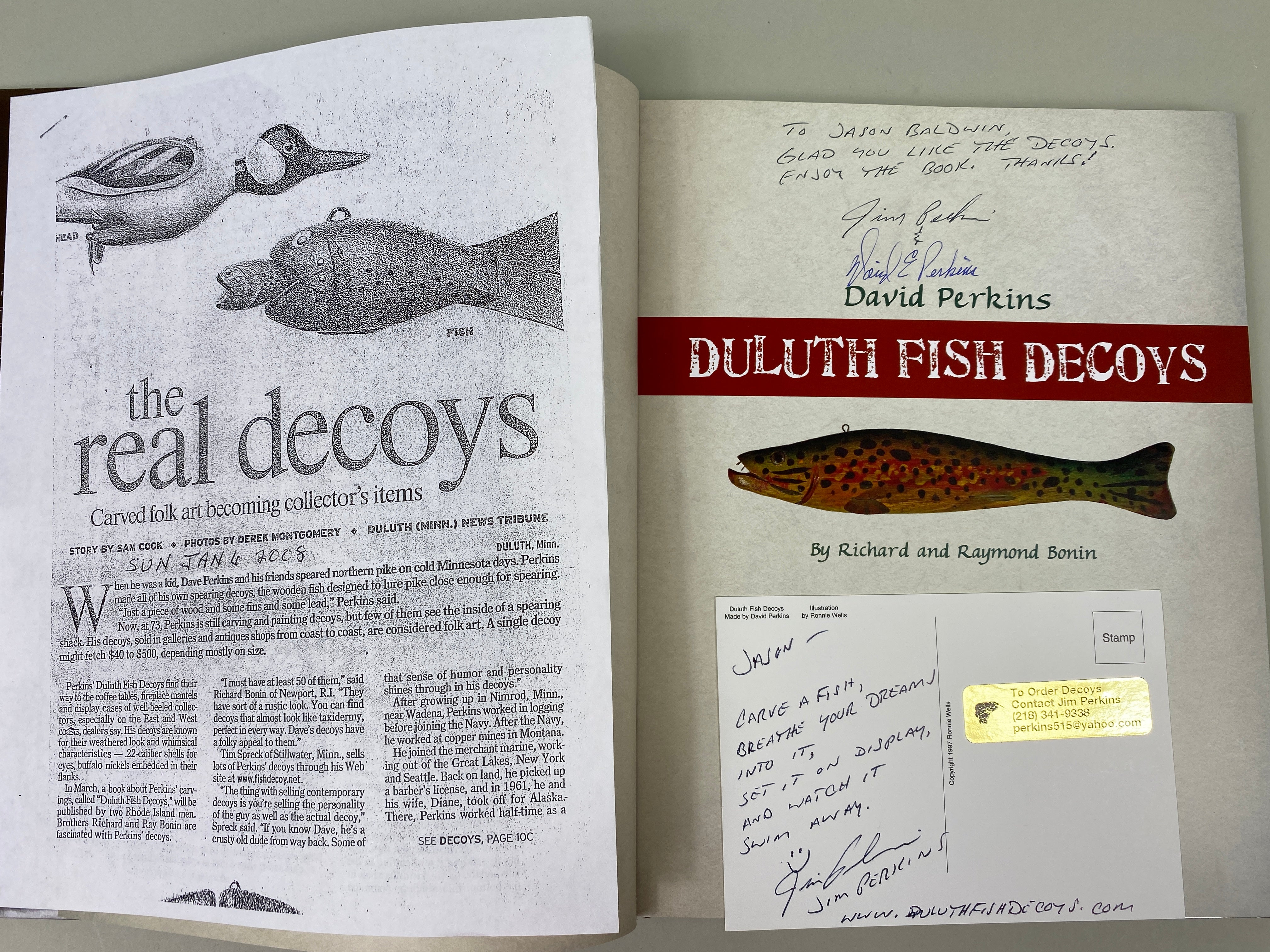 Duluth Fish Decoys by artist David E. Perkins, book written by Richard & Raymond Bonin. This hard cover, 104 page book is signed by Richard Bonin and David Perkins. It...